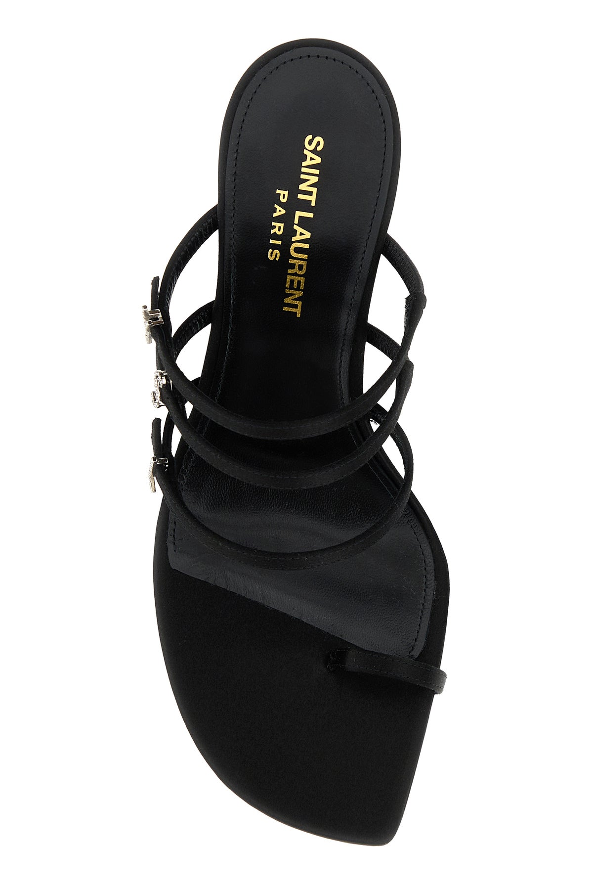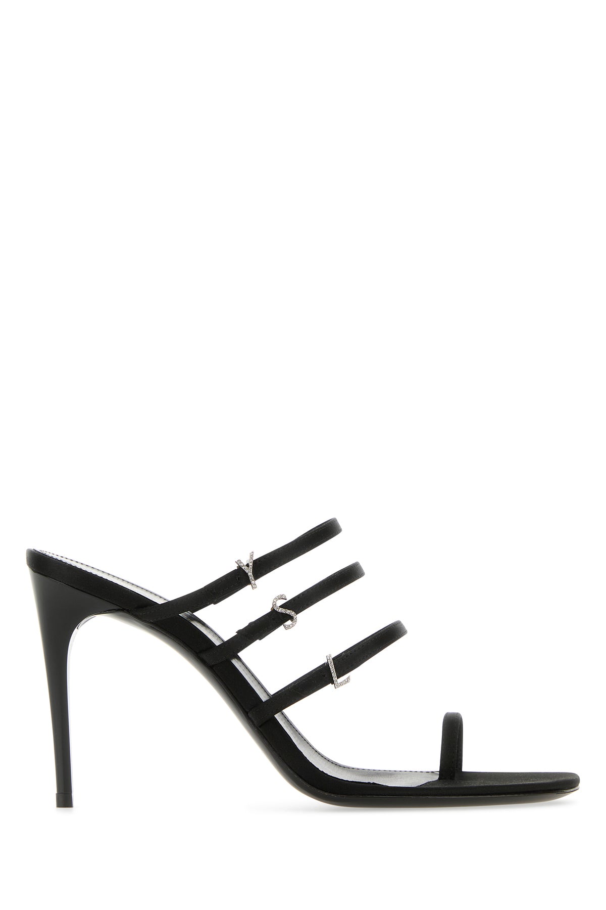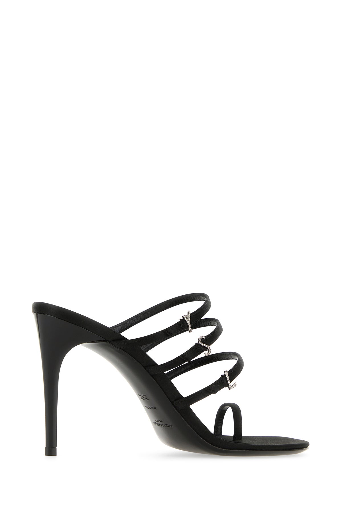 Thong mules realized in satin enriched by metal lettering logo with rhinestones on the instep.