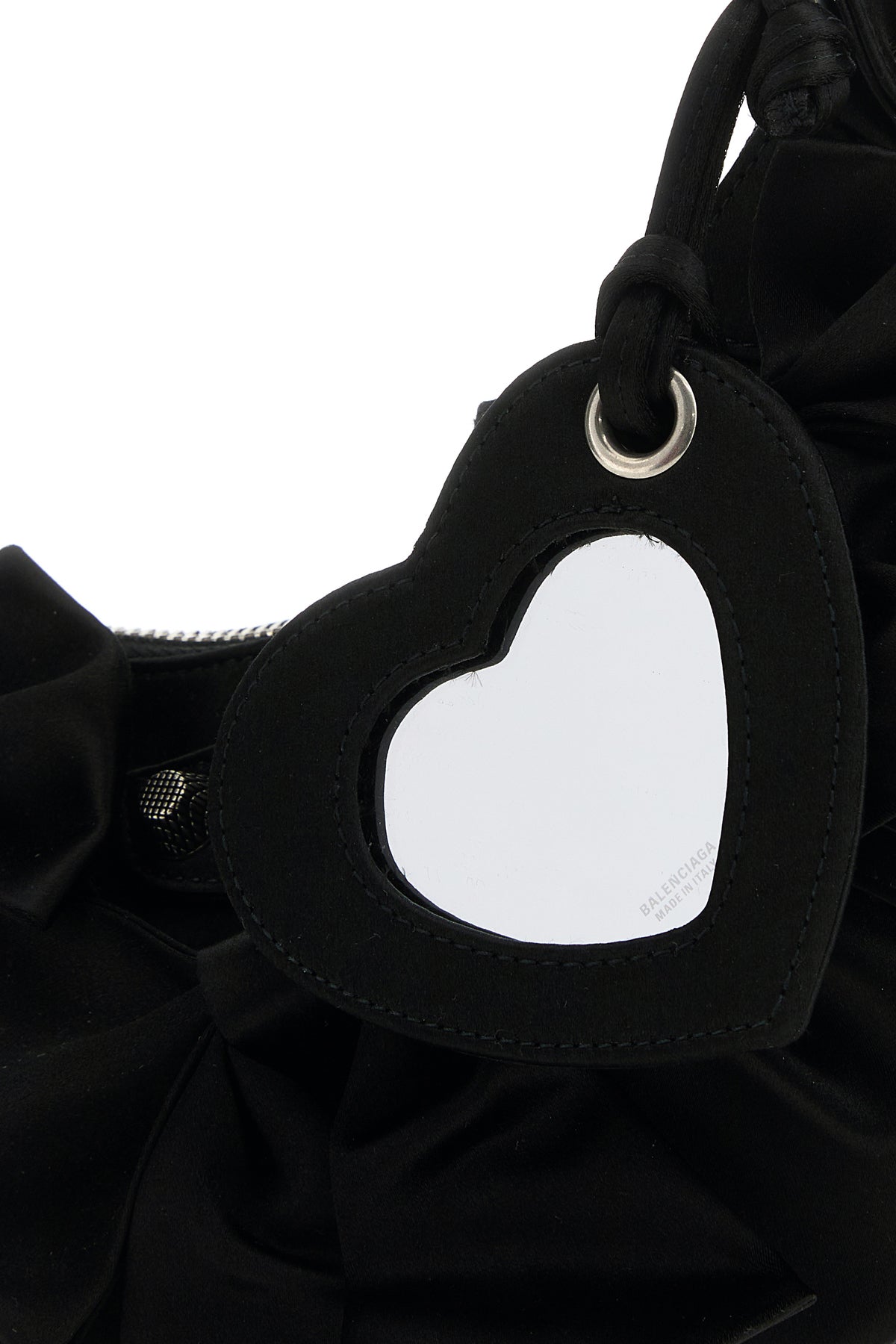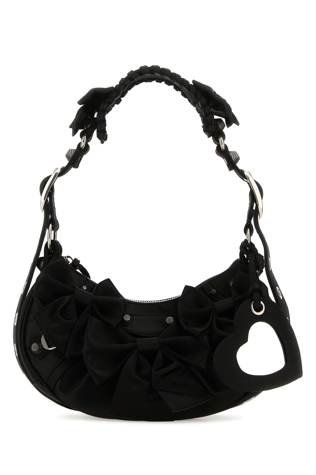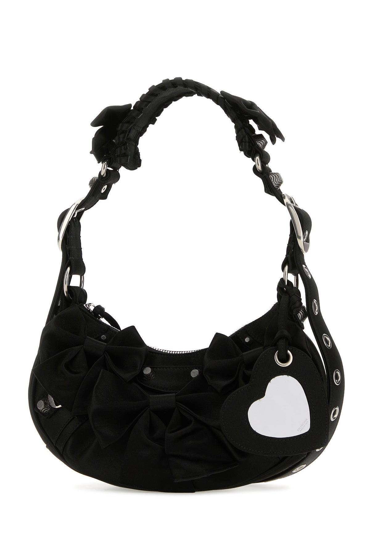 Shoulder bag realized in satin enriched by metal studs, tonal fabric decorative bow and detachable tonal fabric logoed mirror at the front.
