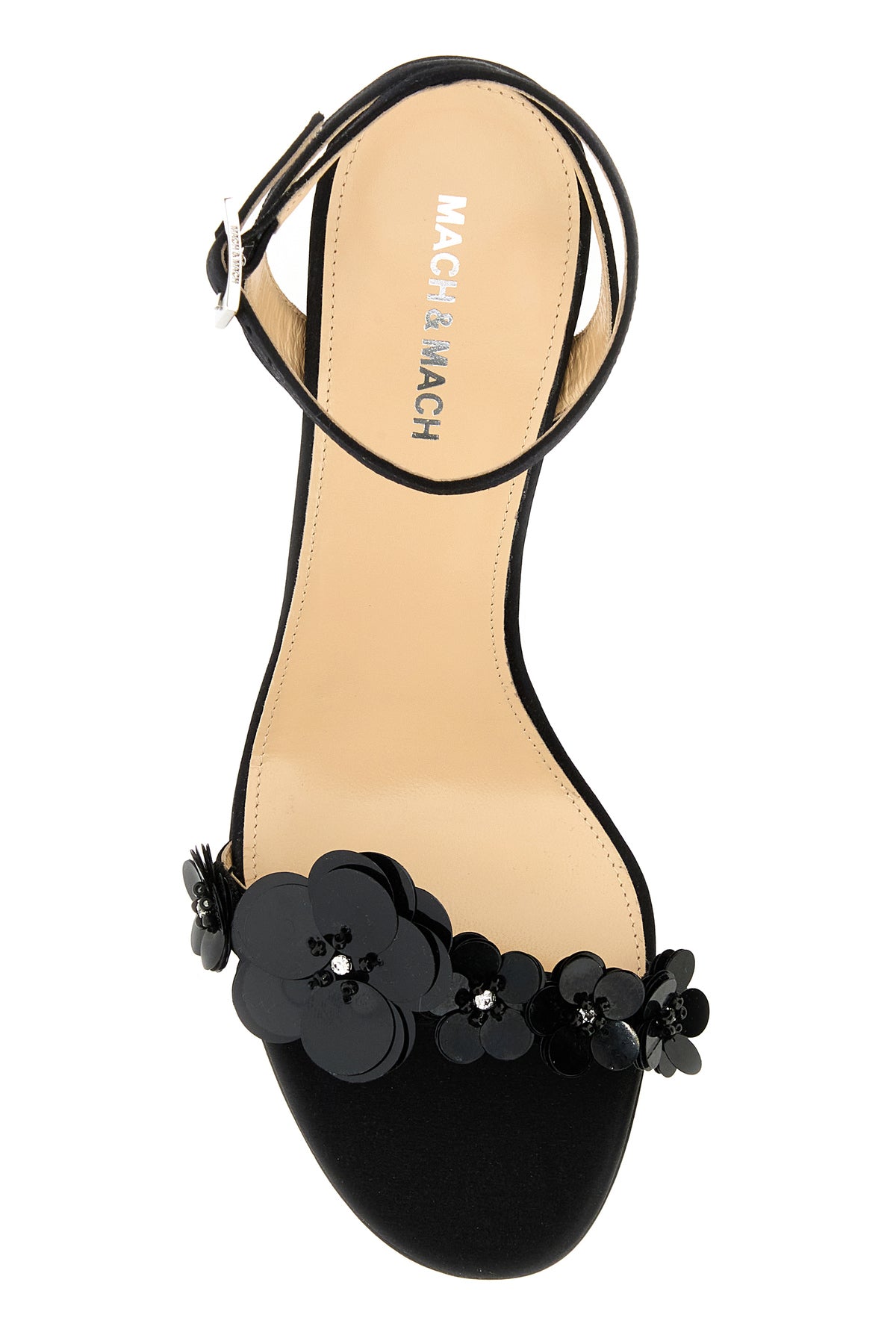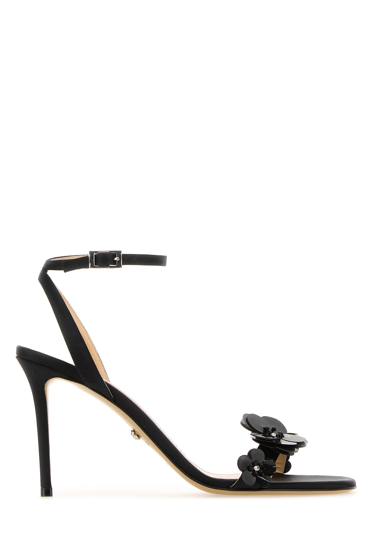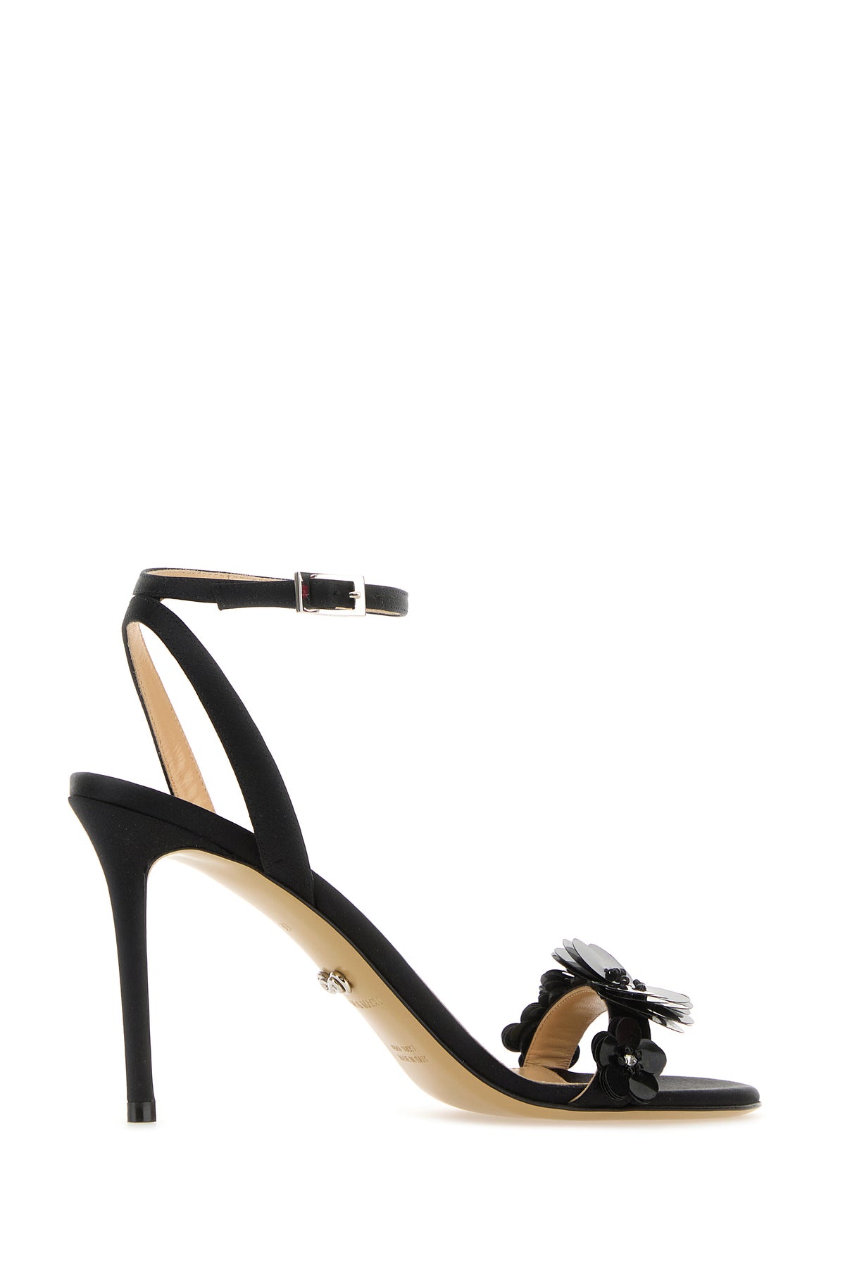 Sandals realized in satin enriched by tonal floral embellishments at the front.