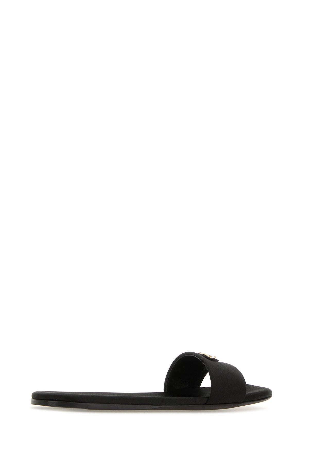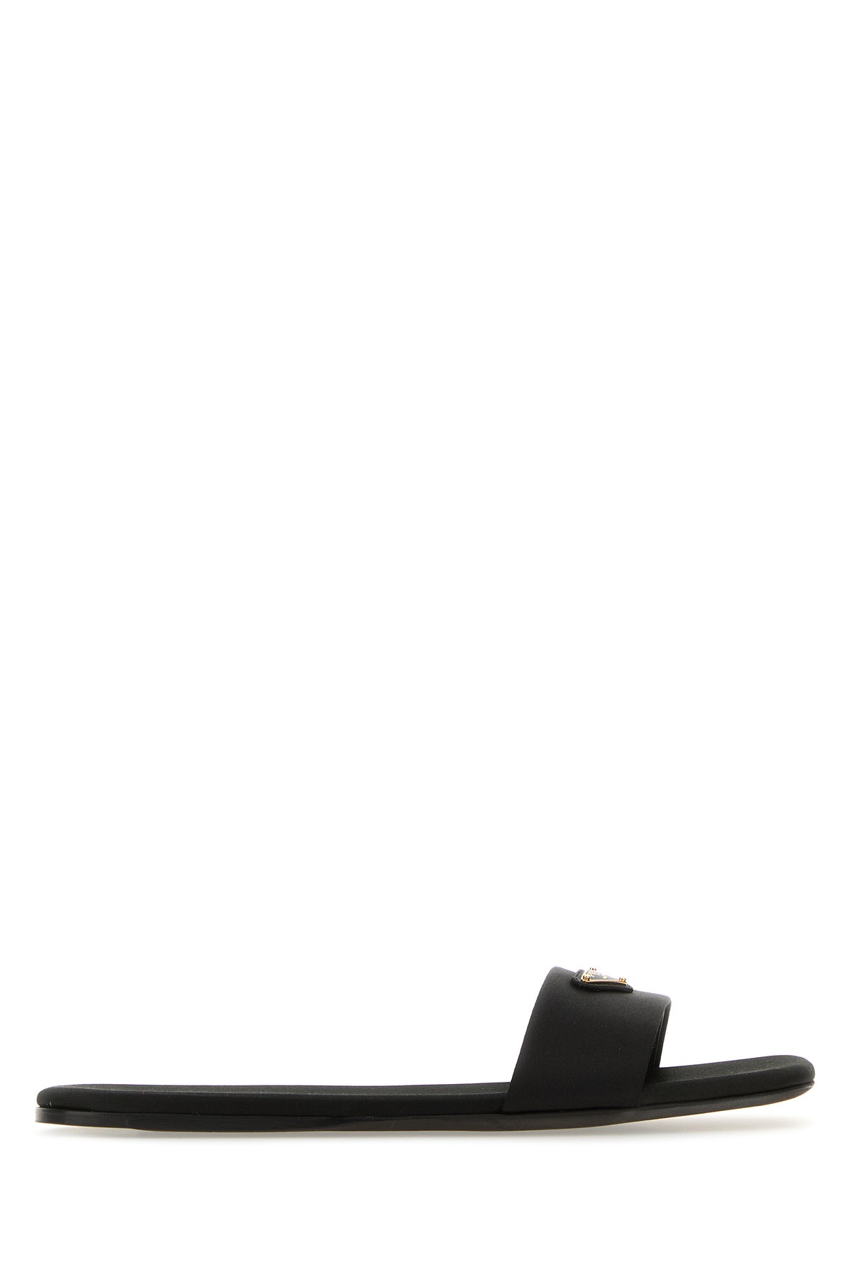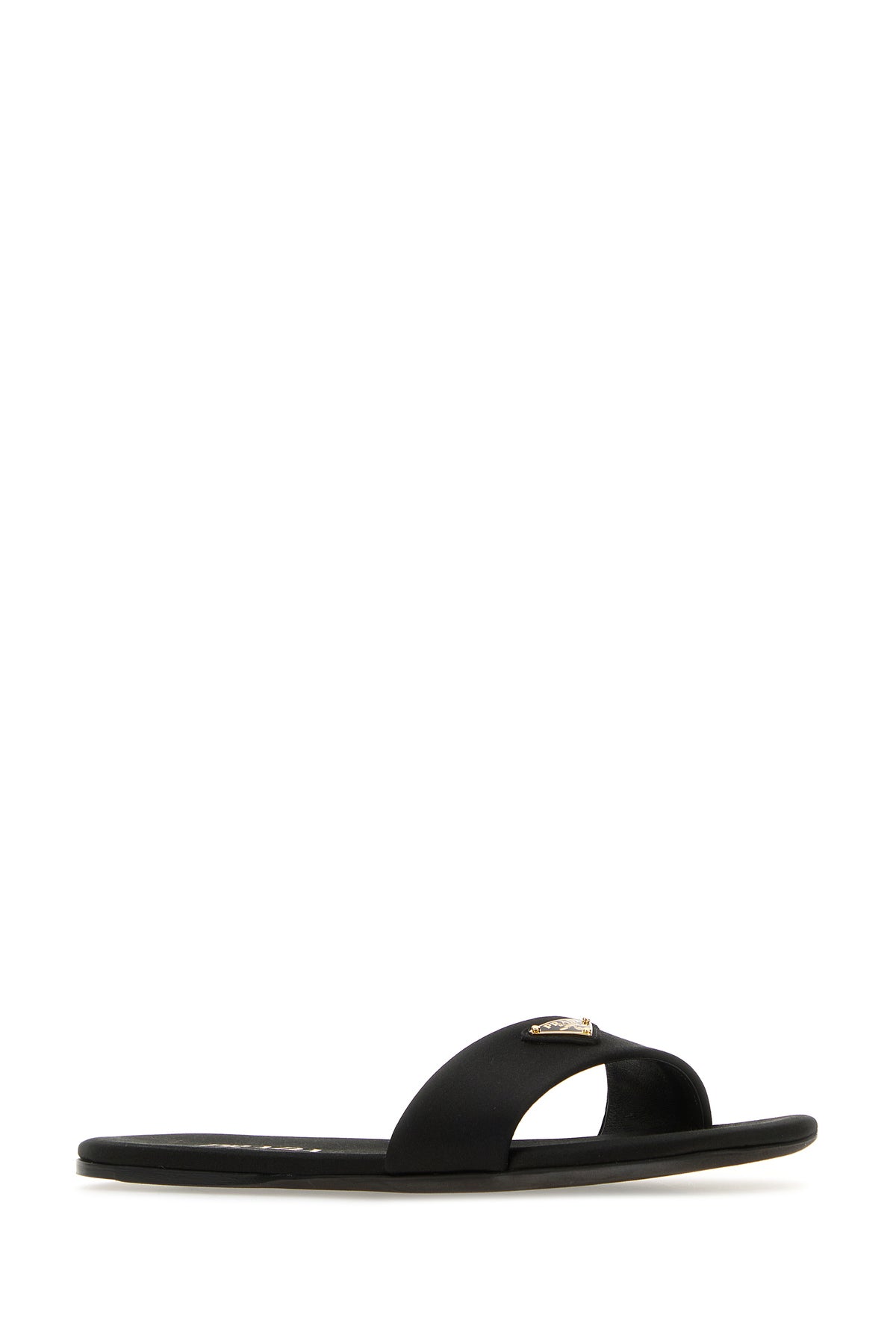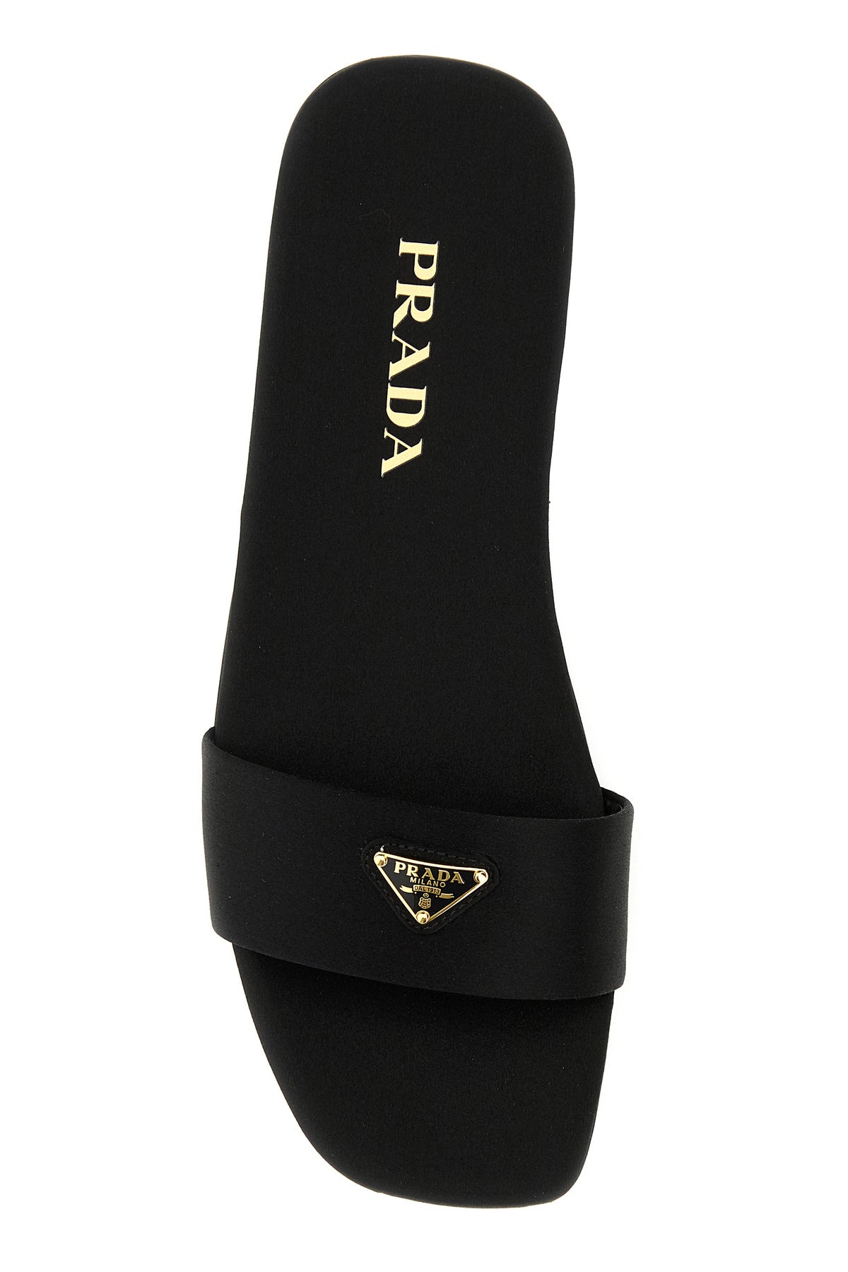 Slippers realized in satin enriched by iconic logoed metal triangle on the band.