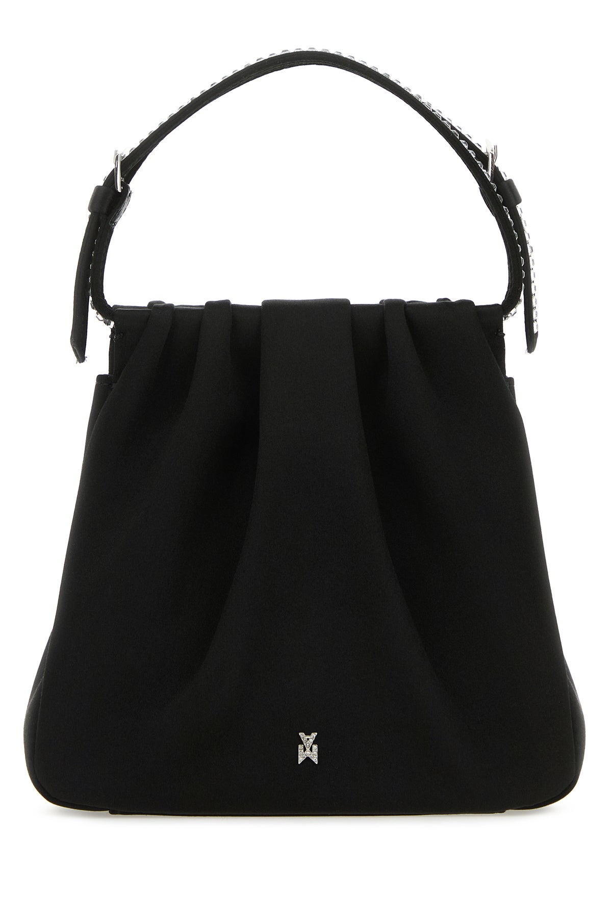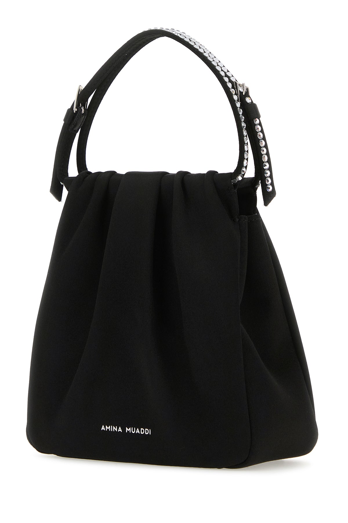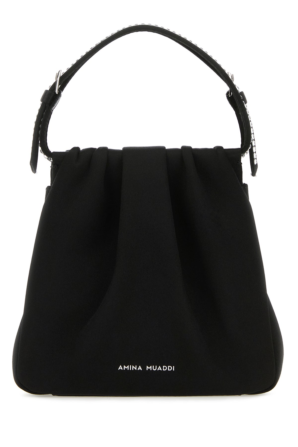 Handbag realized in satin characterized by laminated printed logo at the back enriched by rhinestone logo at the front.