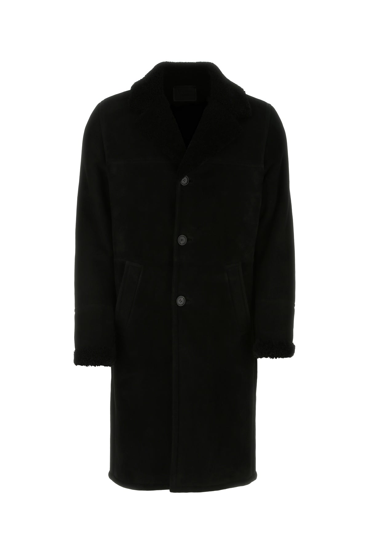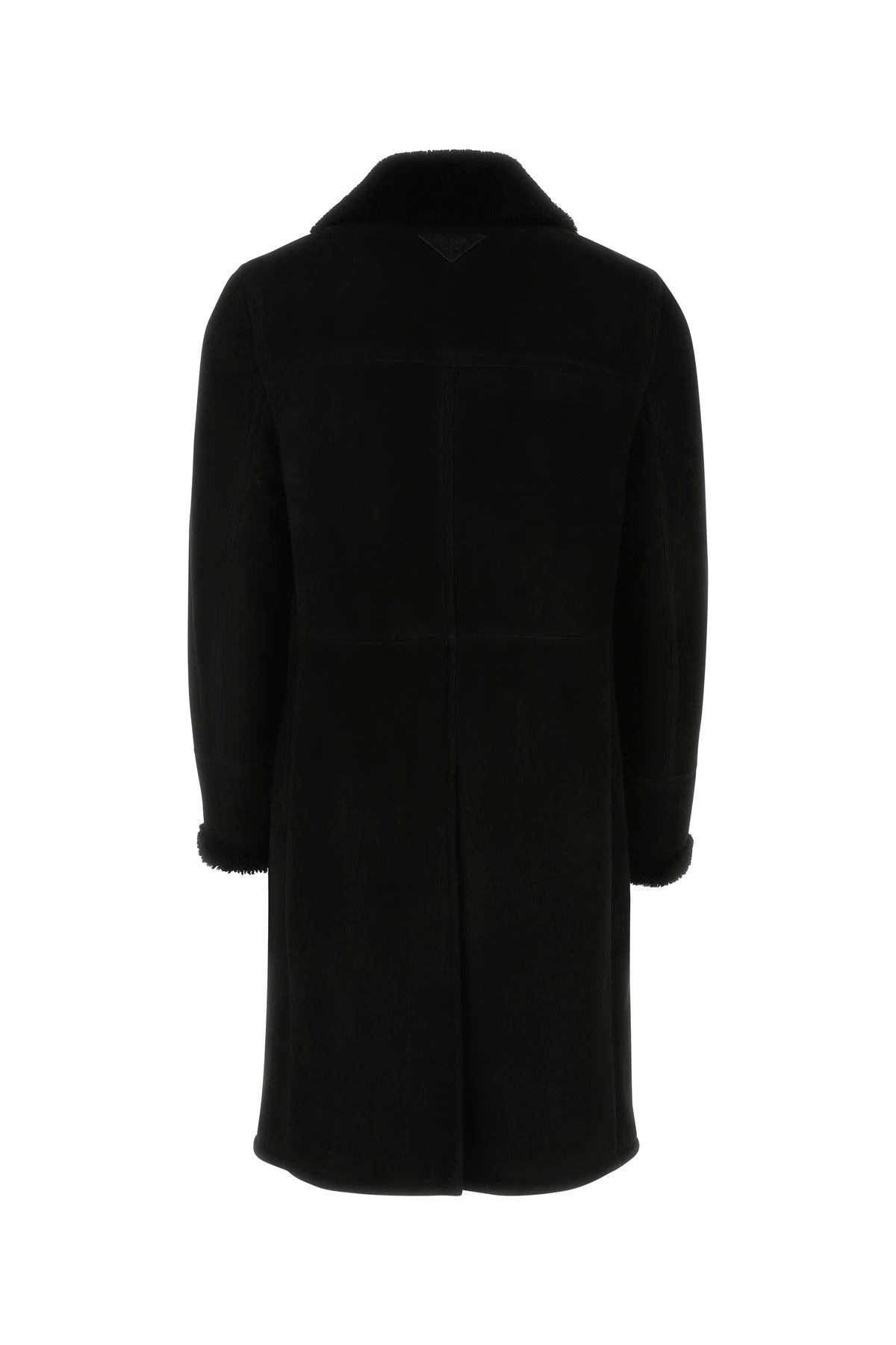 Long-cut coat realized in shearling enriched by iconic tonal logoed triangle at the back.