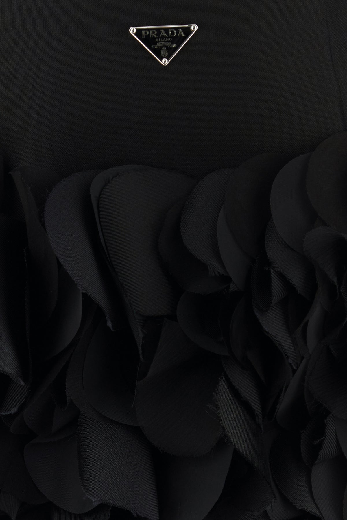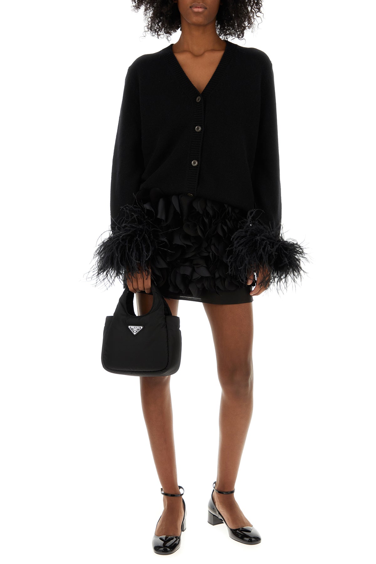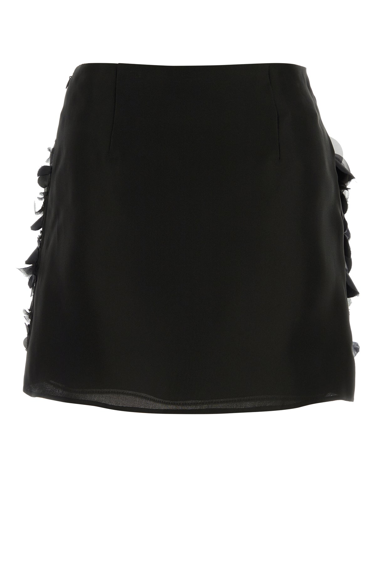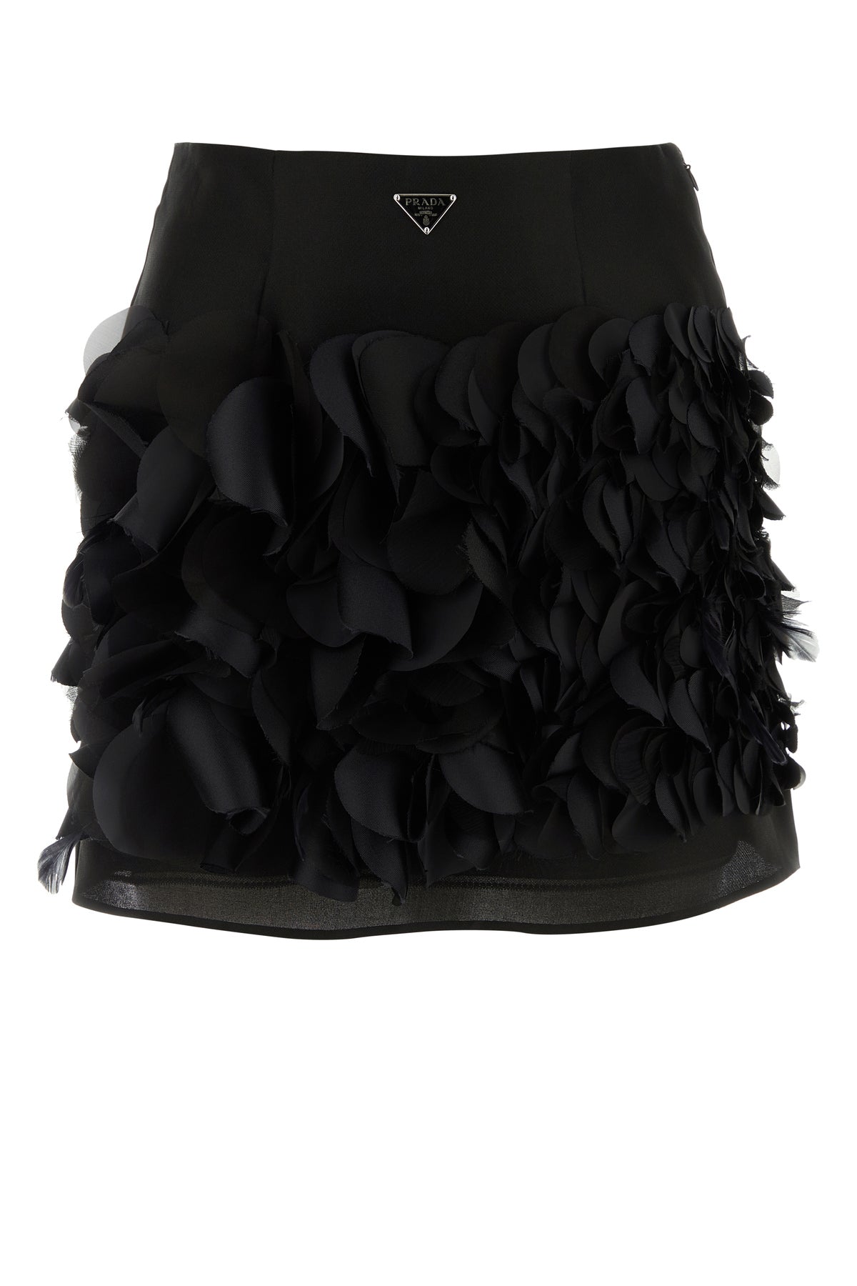 Mini skirt realized in pure silk with tonal feathers at the front enriched by tonal silk flowers and iconic logoed metal triangle at the front.