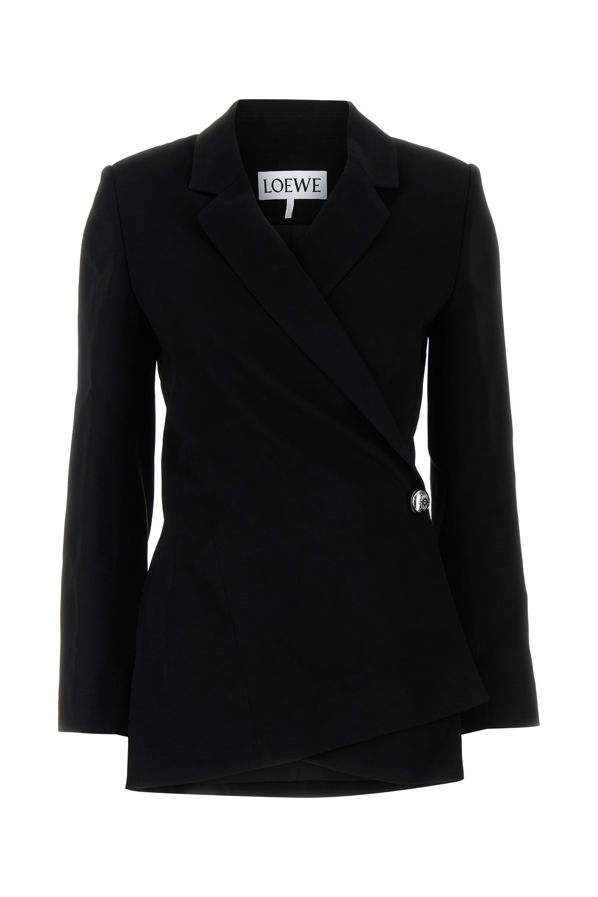Blazer realized in stretch crepe characterized by logged button closure.