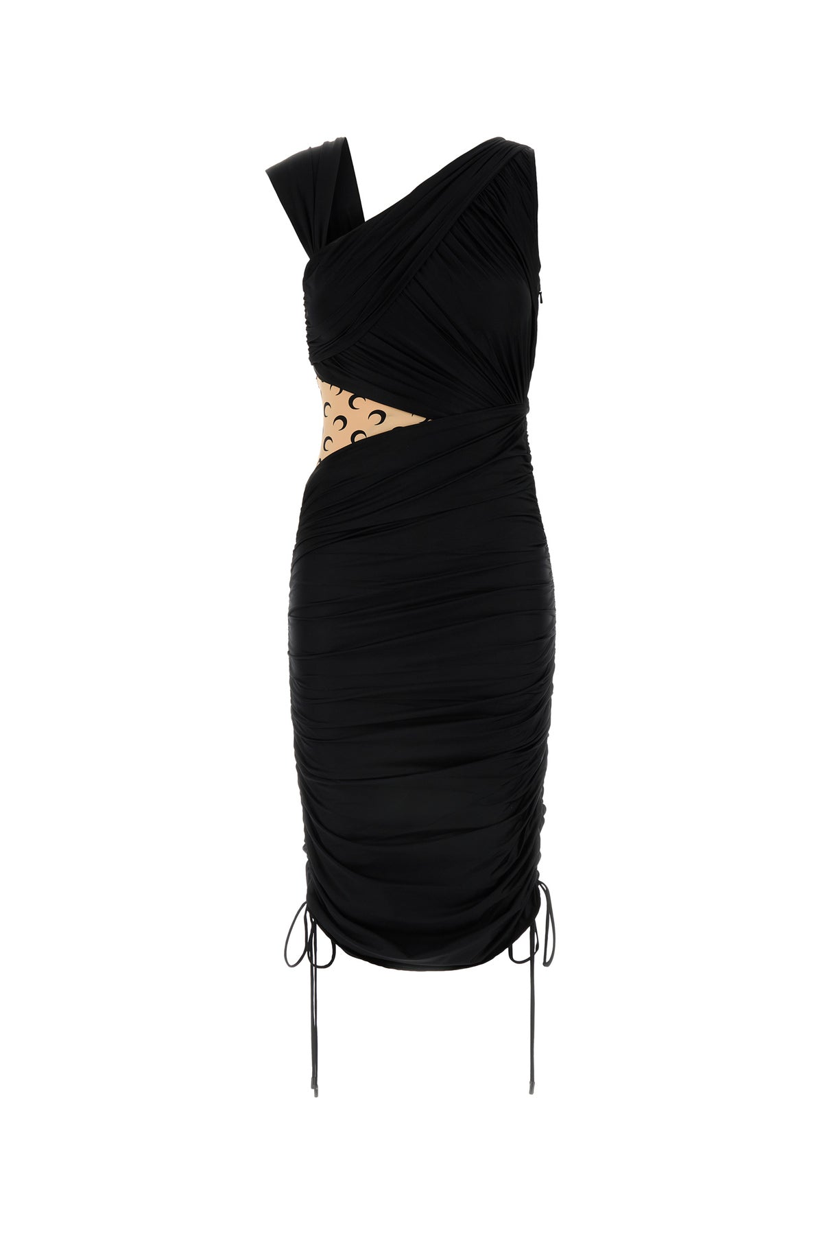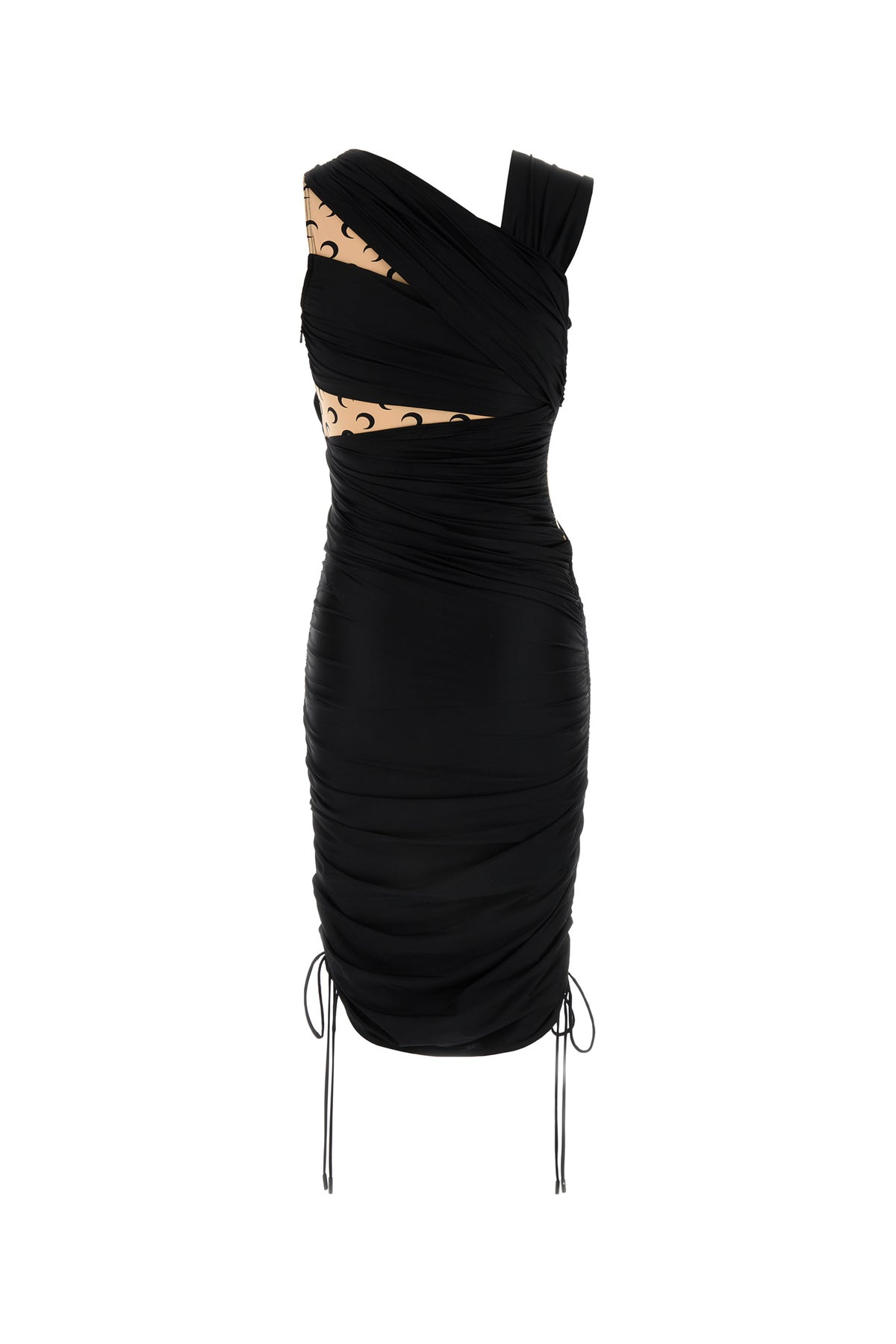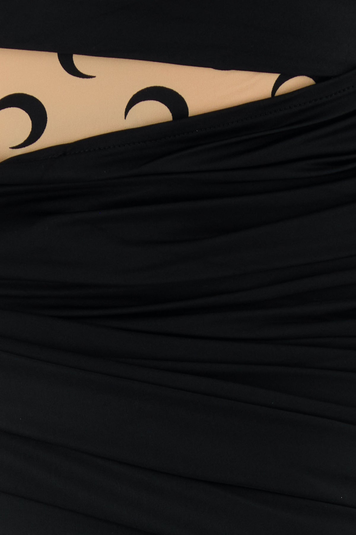 Dress realized in stretch nylon with contrasting insert at the top characterized by drapes on the entire surface.