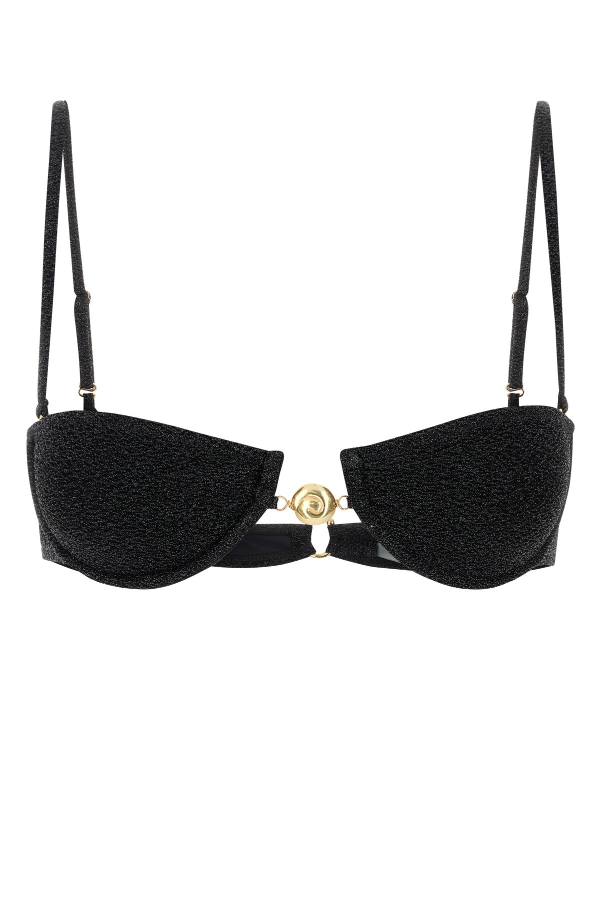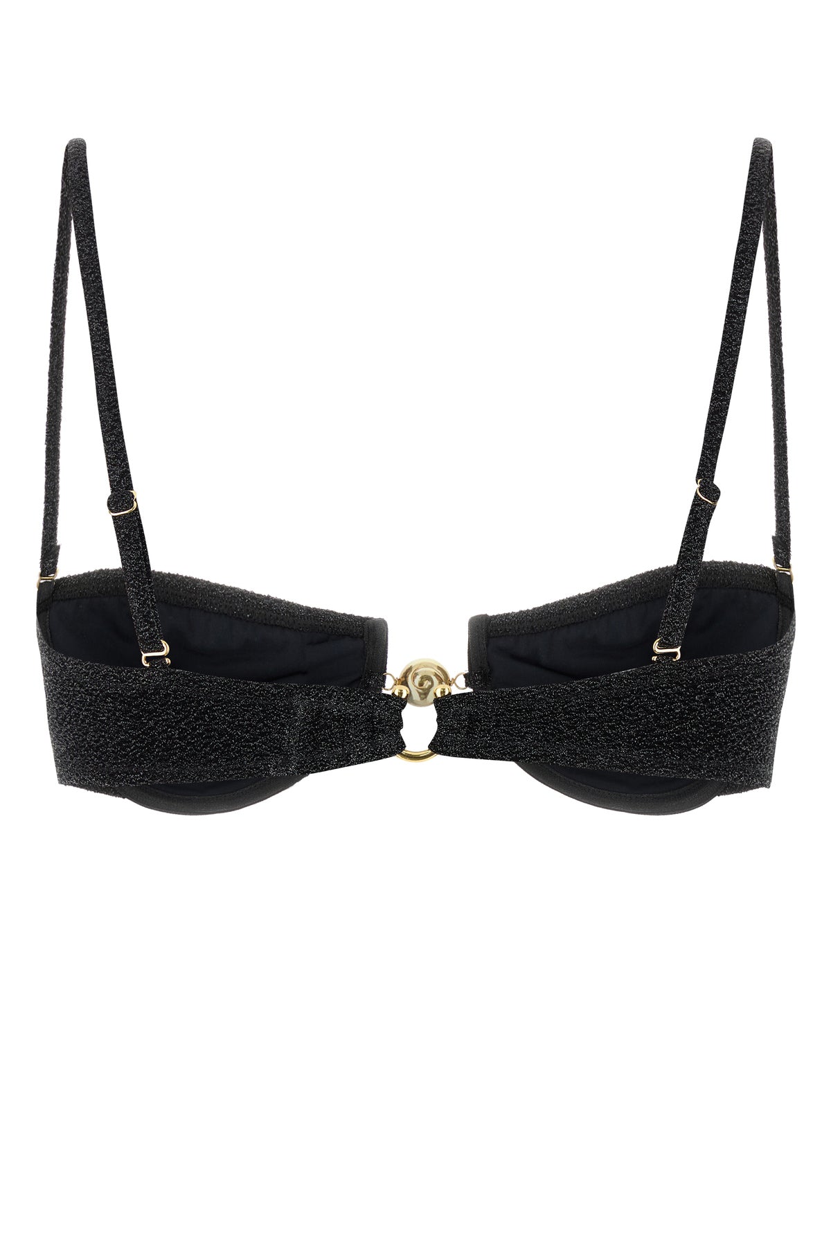 Balcony bikini top realized in stretch nylon with lurex threads.