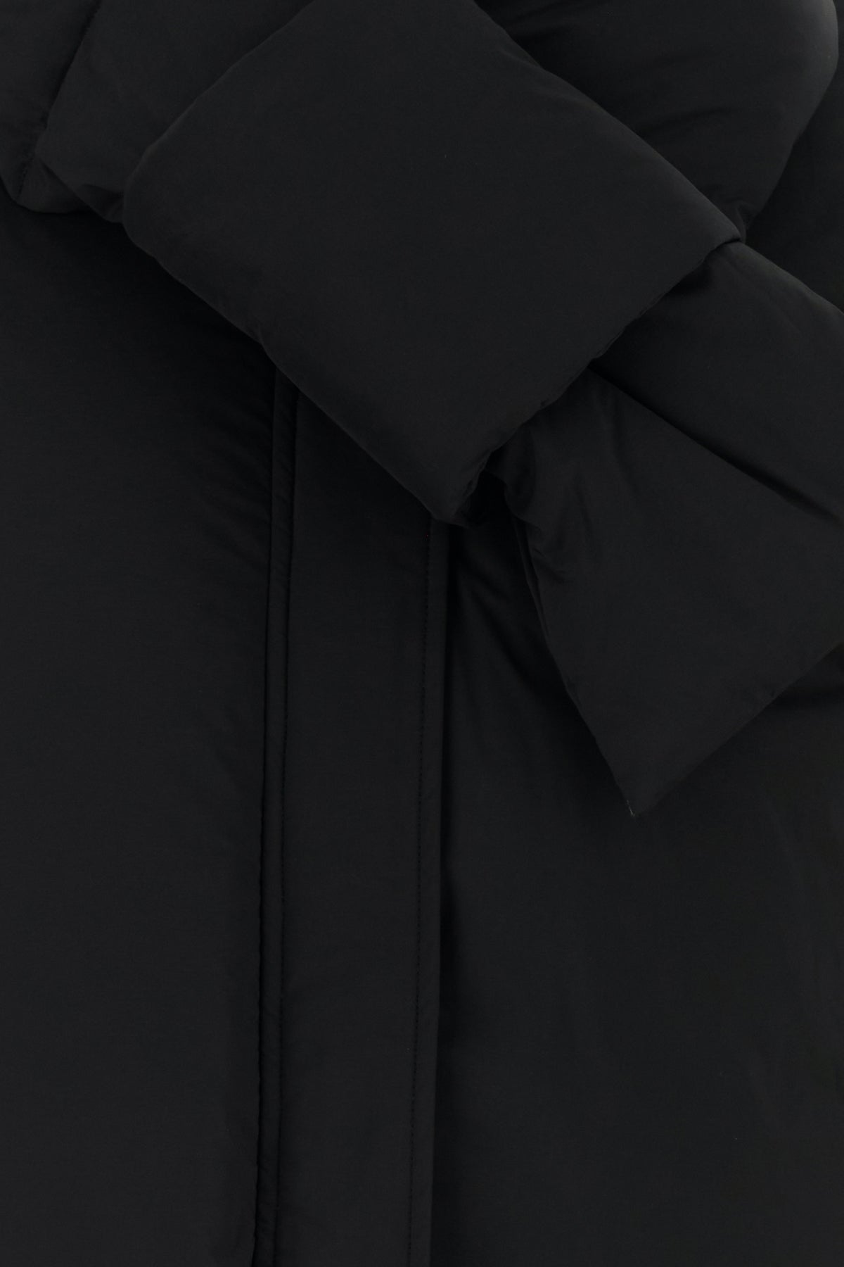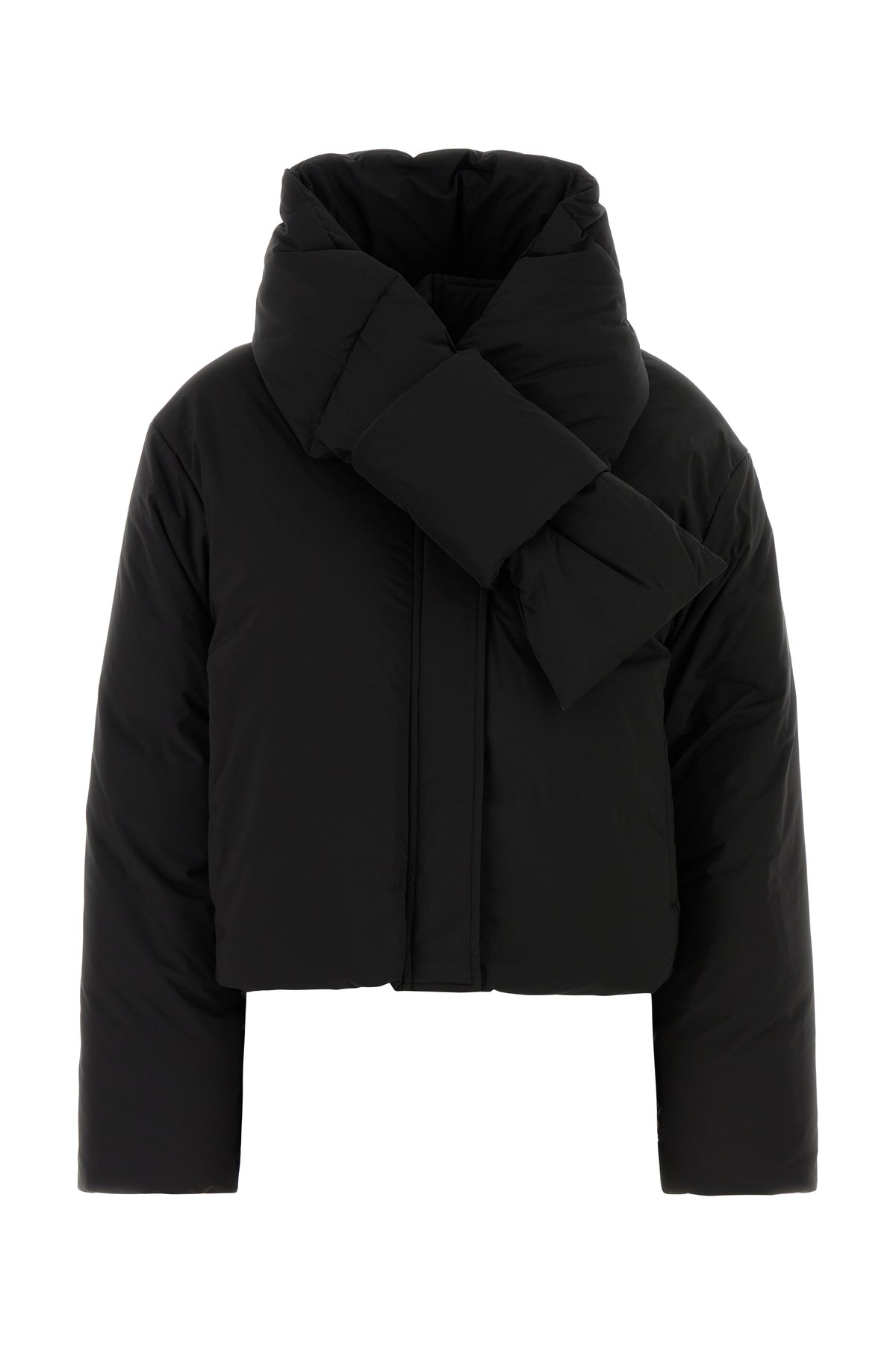 Down jacket realized in stretch polyester characterized by tonal embroidered logo on the chest enriched by detachable padded scarf to tie at the neck.