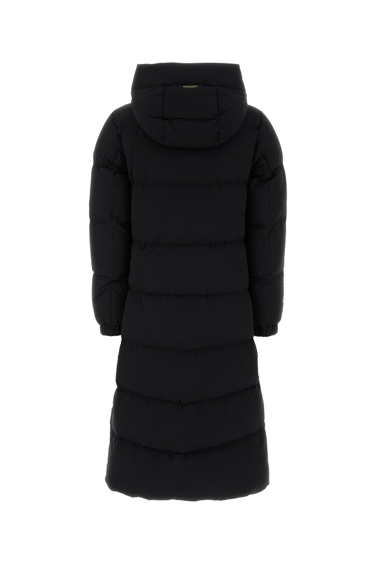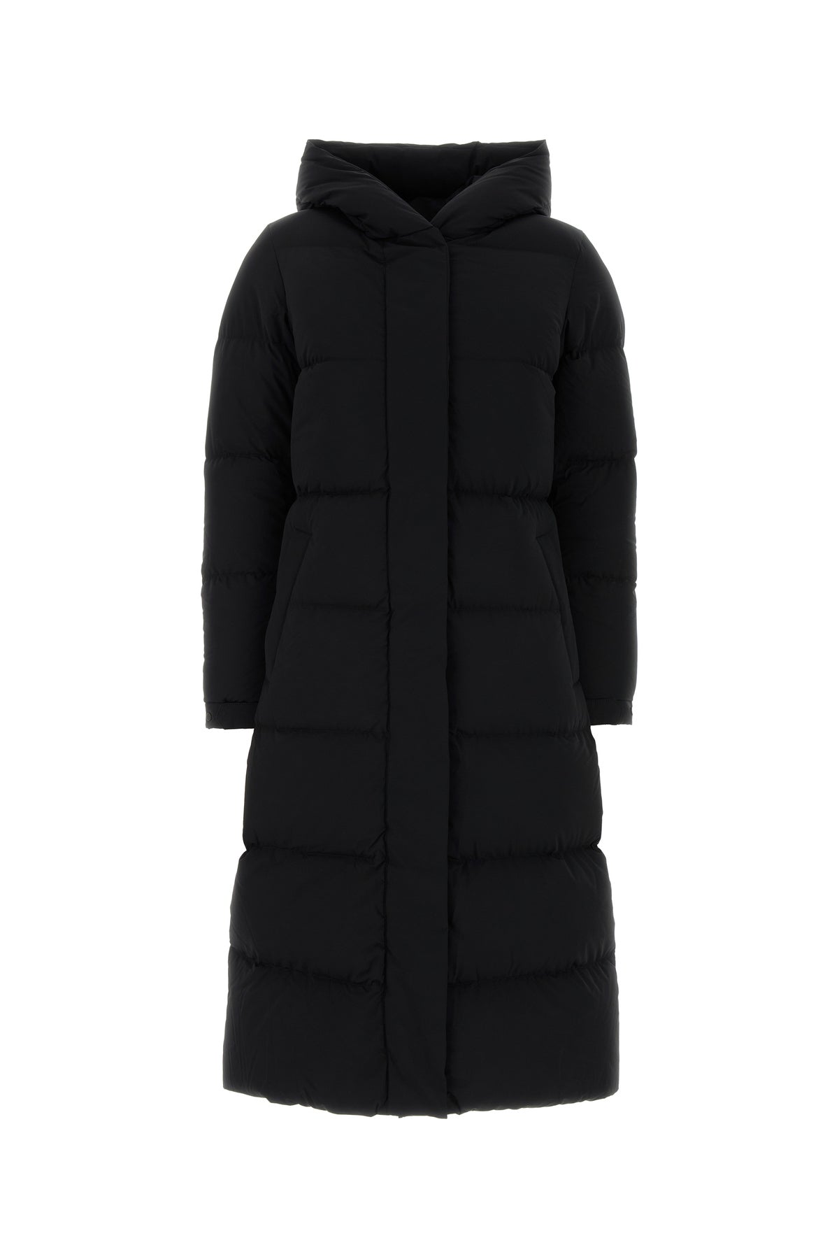 Down jacket realized in quilted stretch polyester characterized by contrasting printed logo on the hood.
