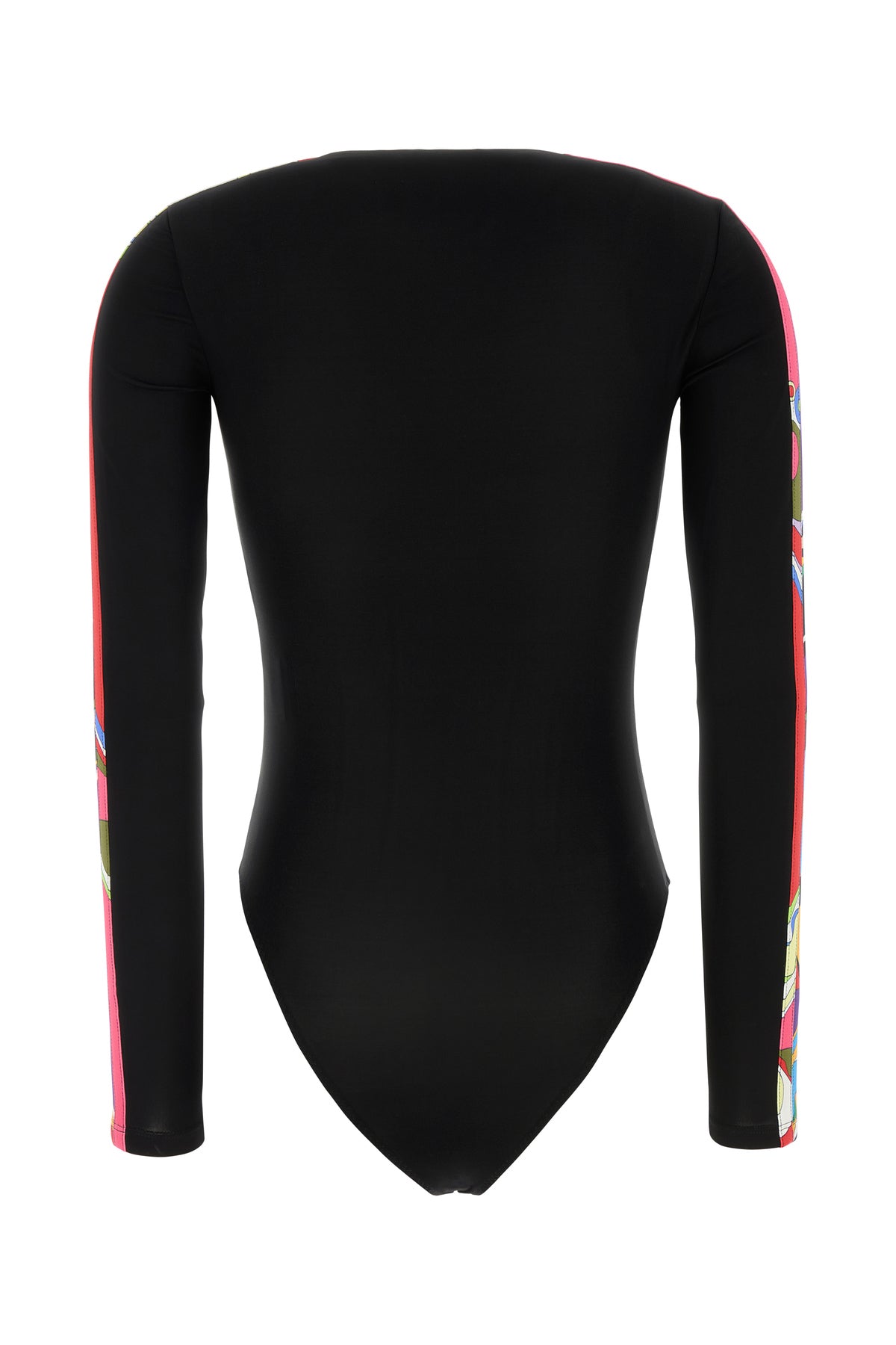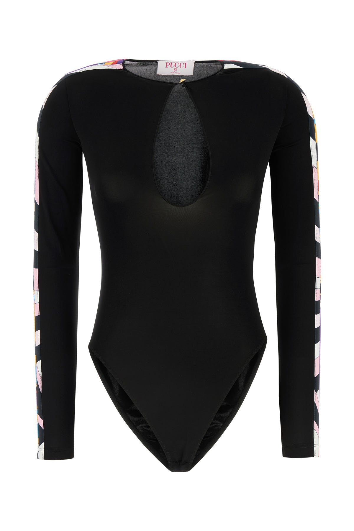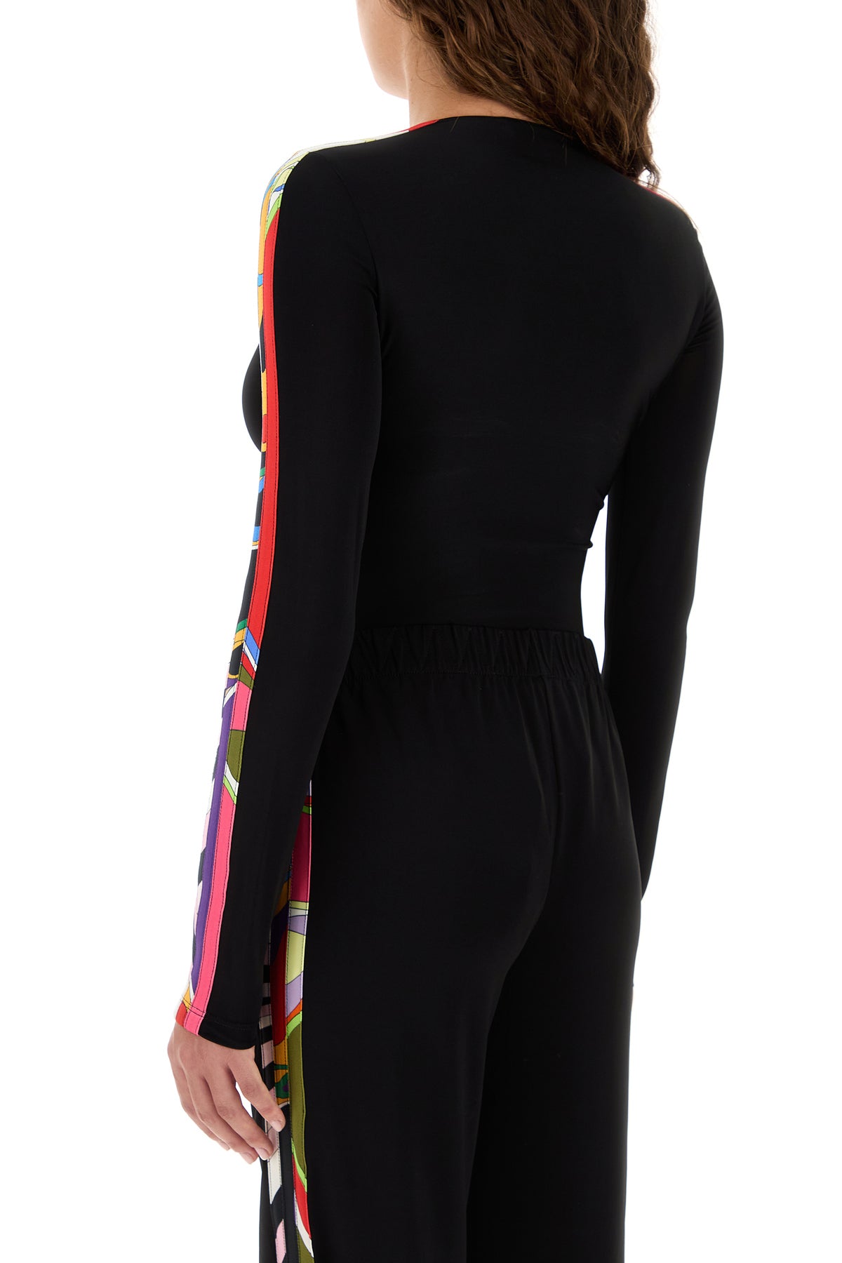 Bodysuit realized in stretch viscose enriched by bands with peculiar print on the sleeves.