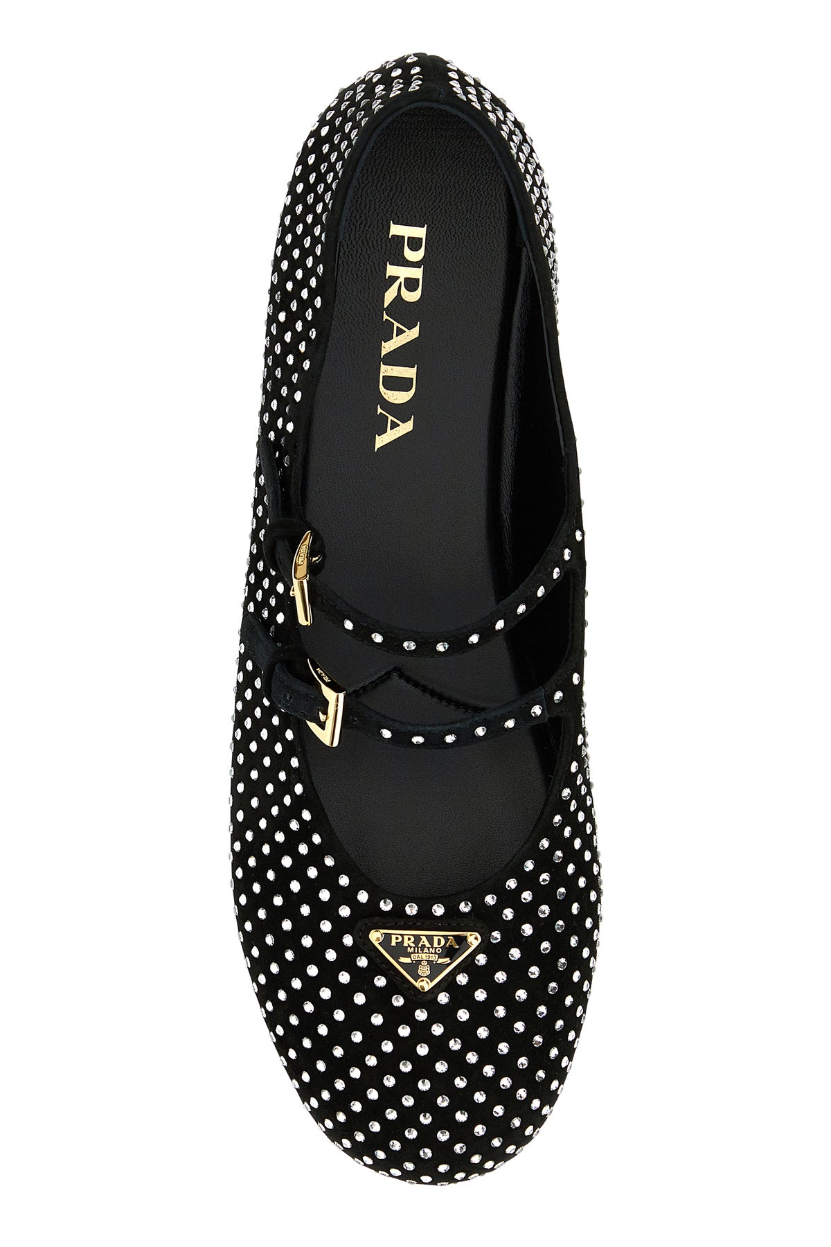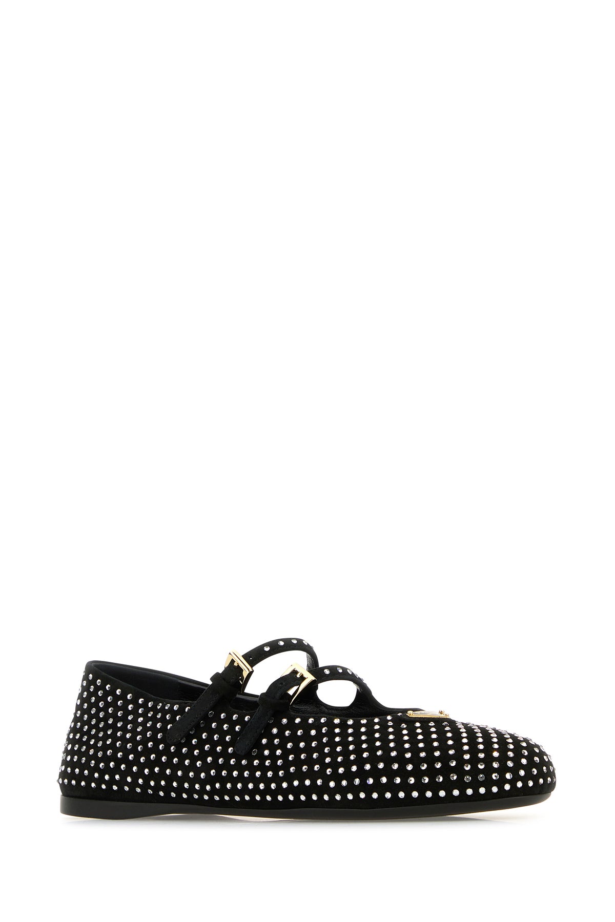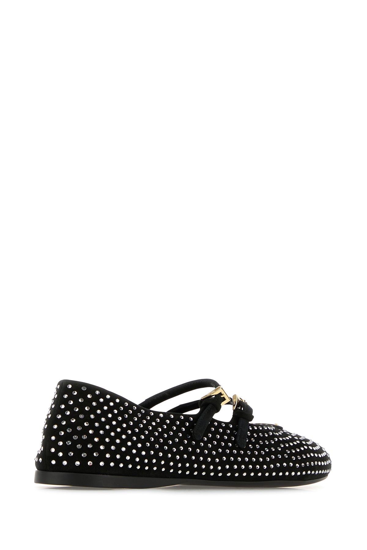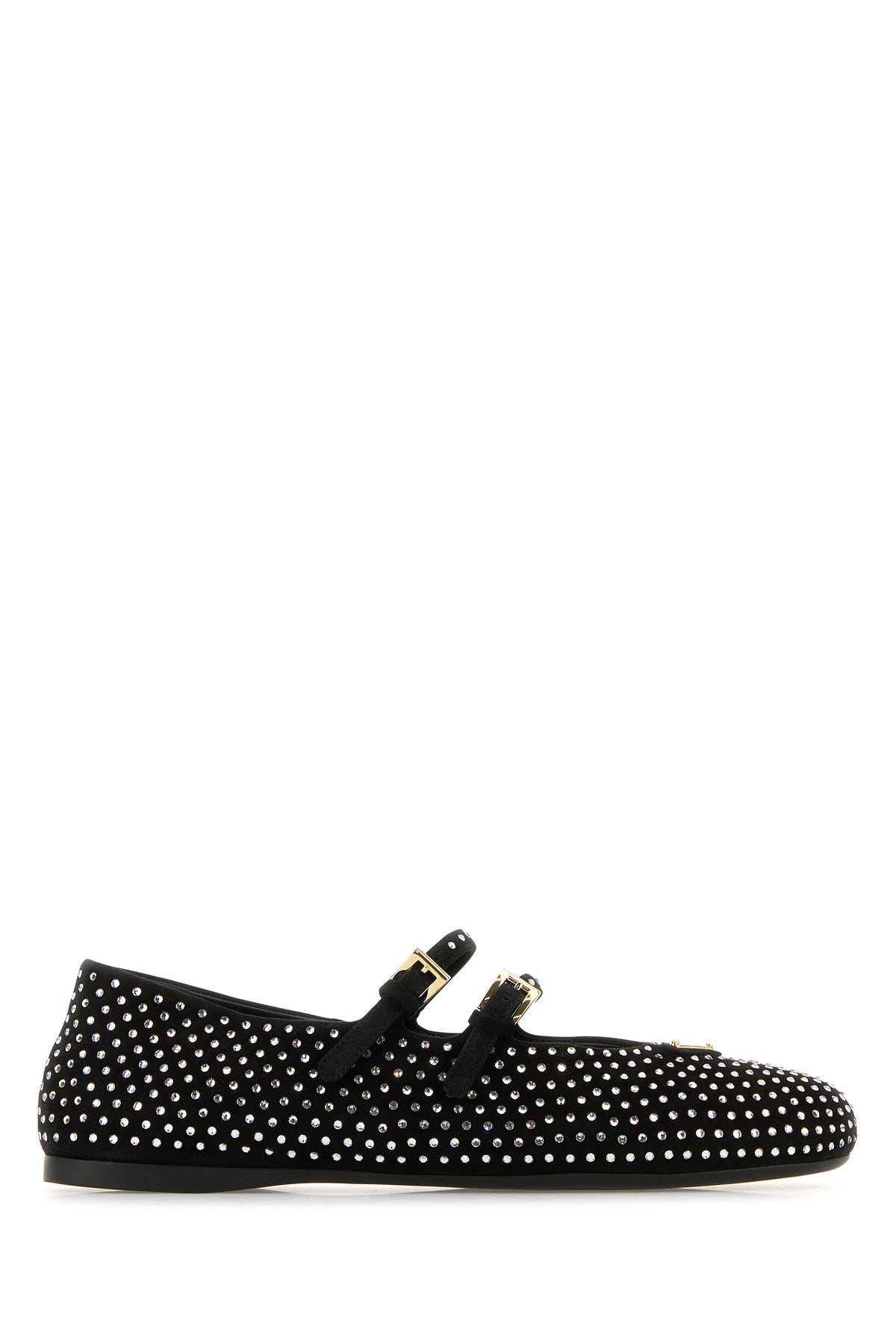 Padded ballerinas realized in suede with rhinestones on the entire surface enriched by iconic metal logoed triangle at the front.