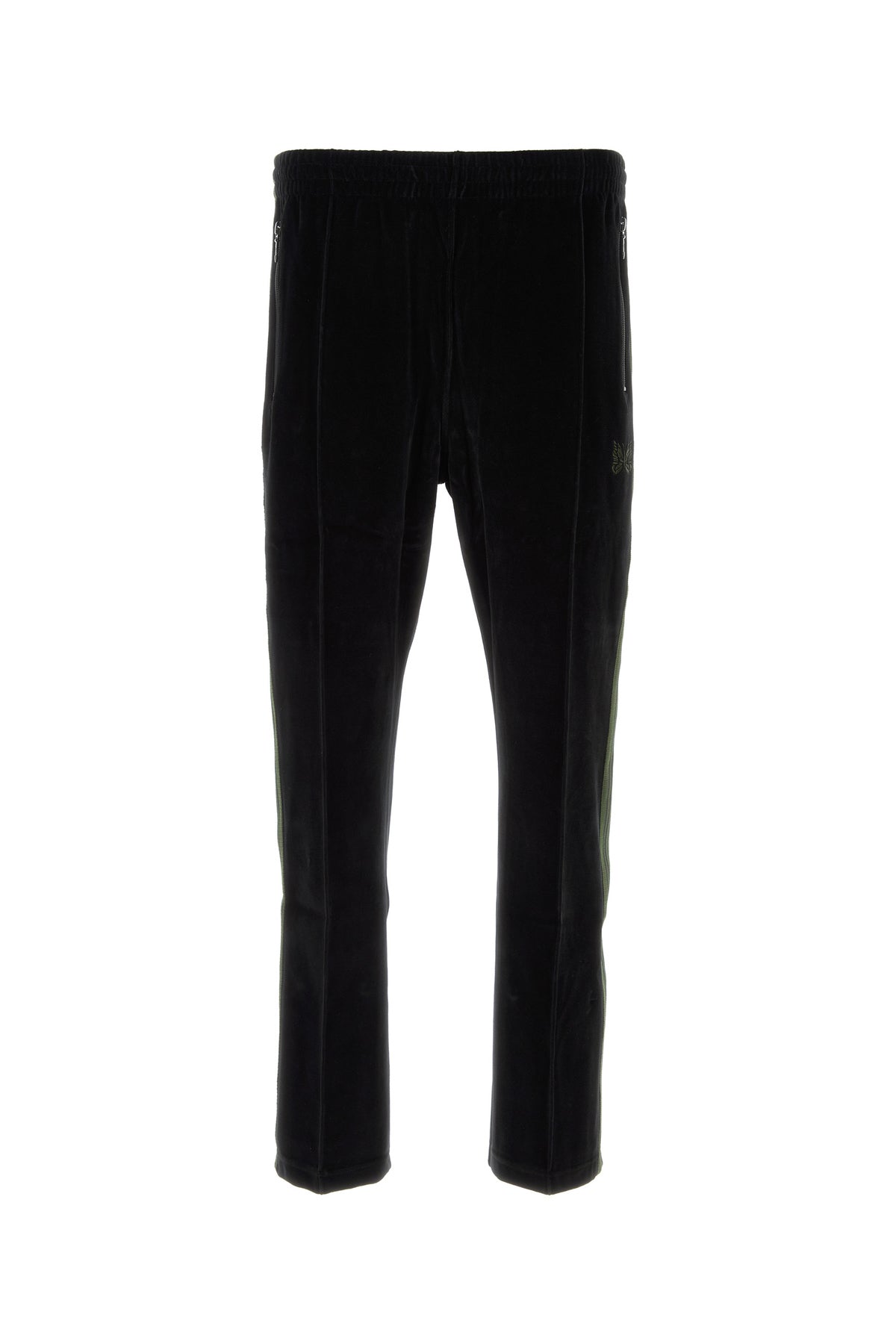 Joggers realized in velvet characterized by peculiar embroidery at the front enriched by contrasting bands on the sides.