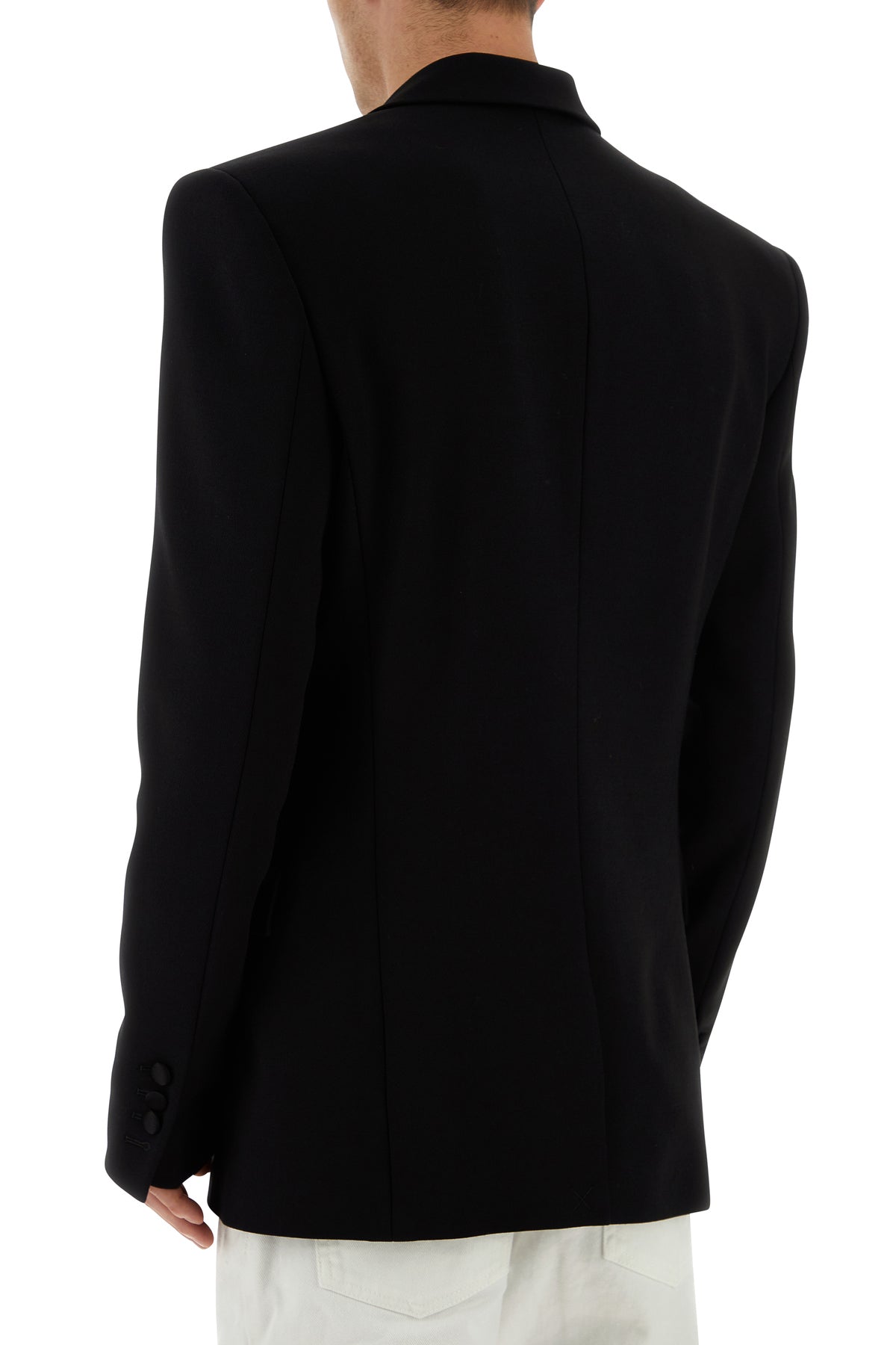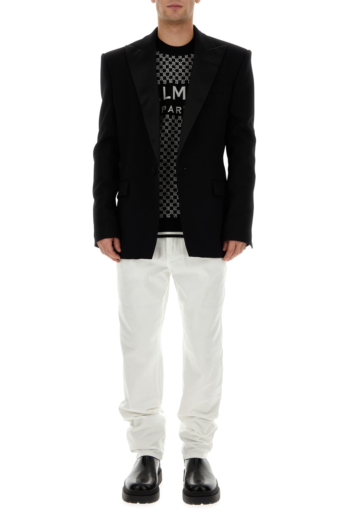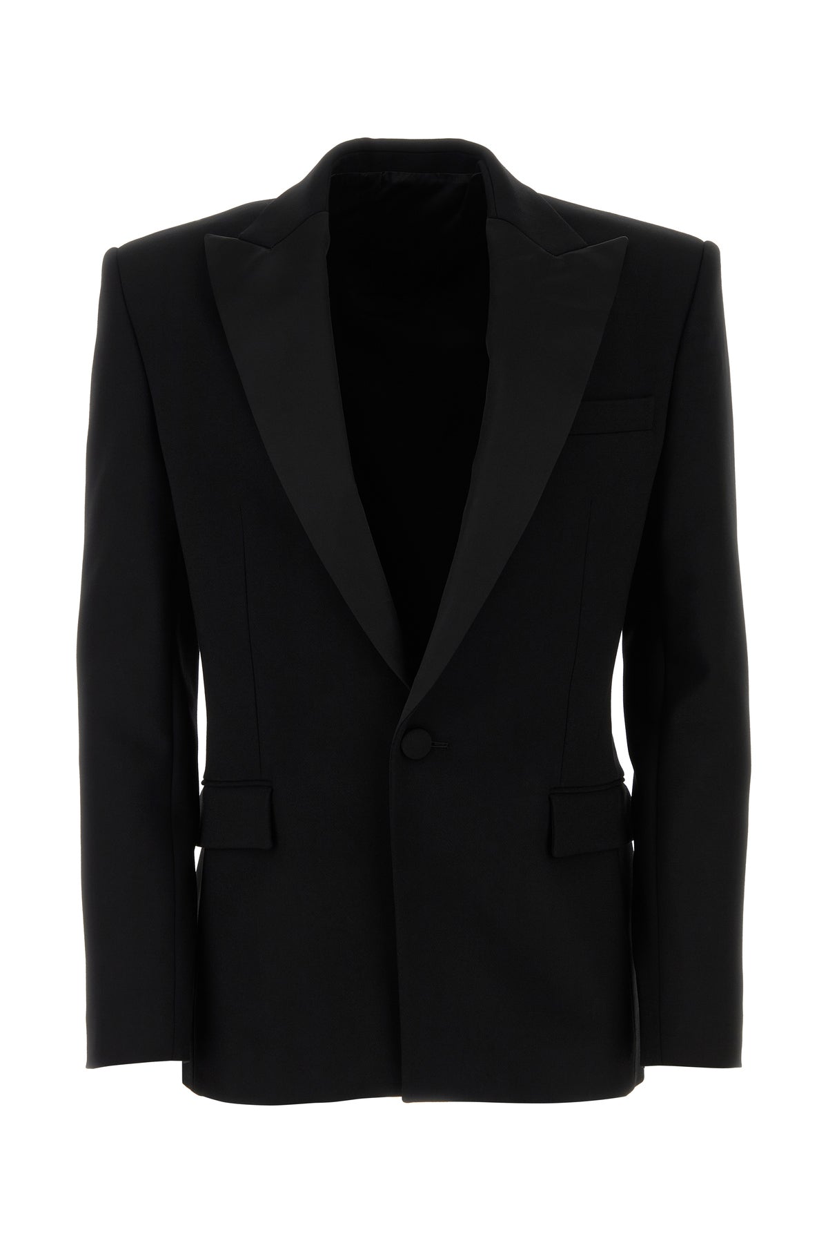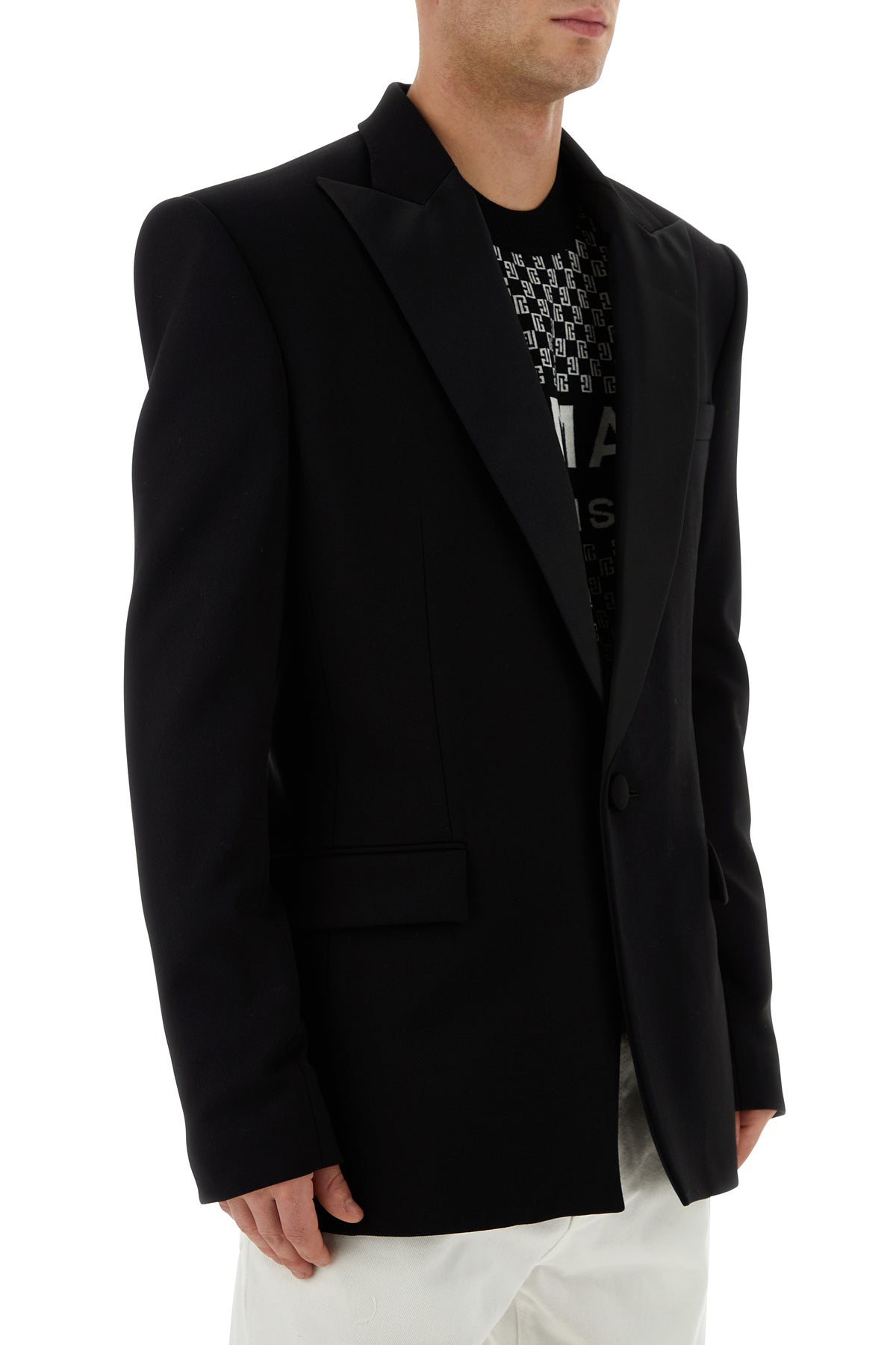 Blazer realized in viscose blend with tonal satin inserts on the lapels.