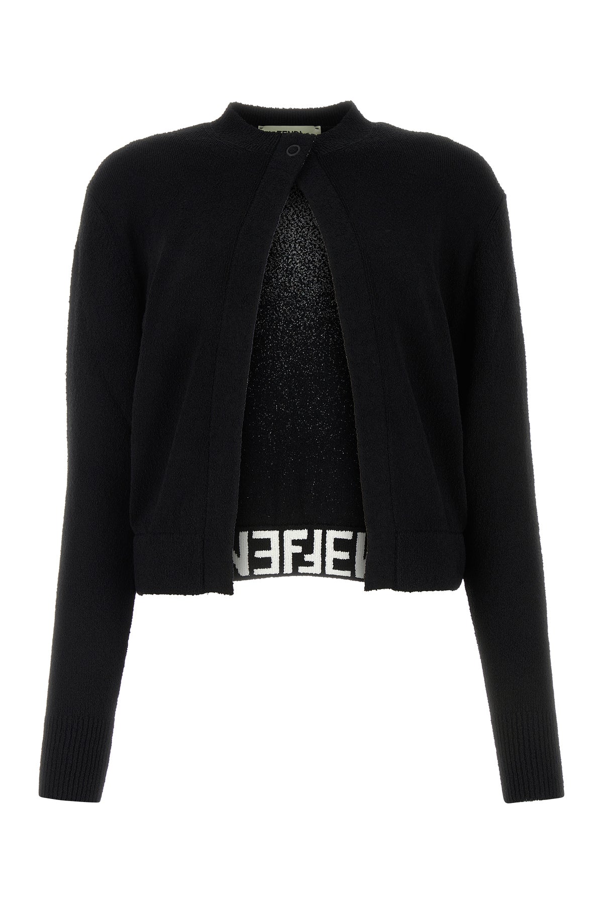 Cardigan realized in viscose blend characterized by single visible snap button closure.