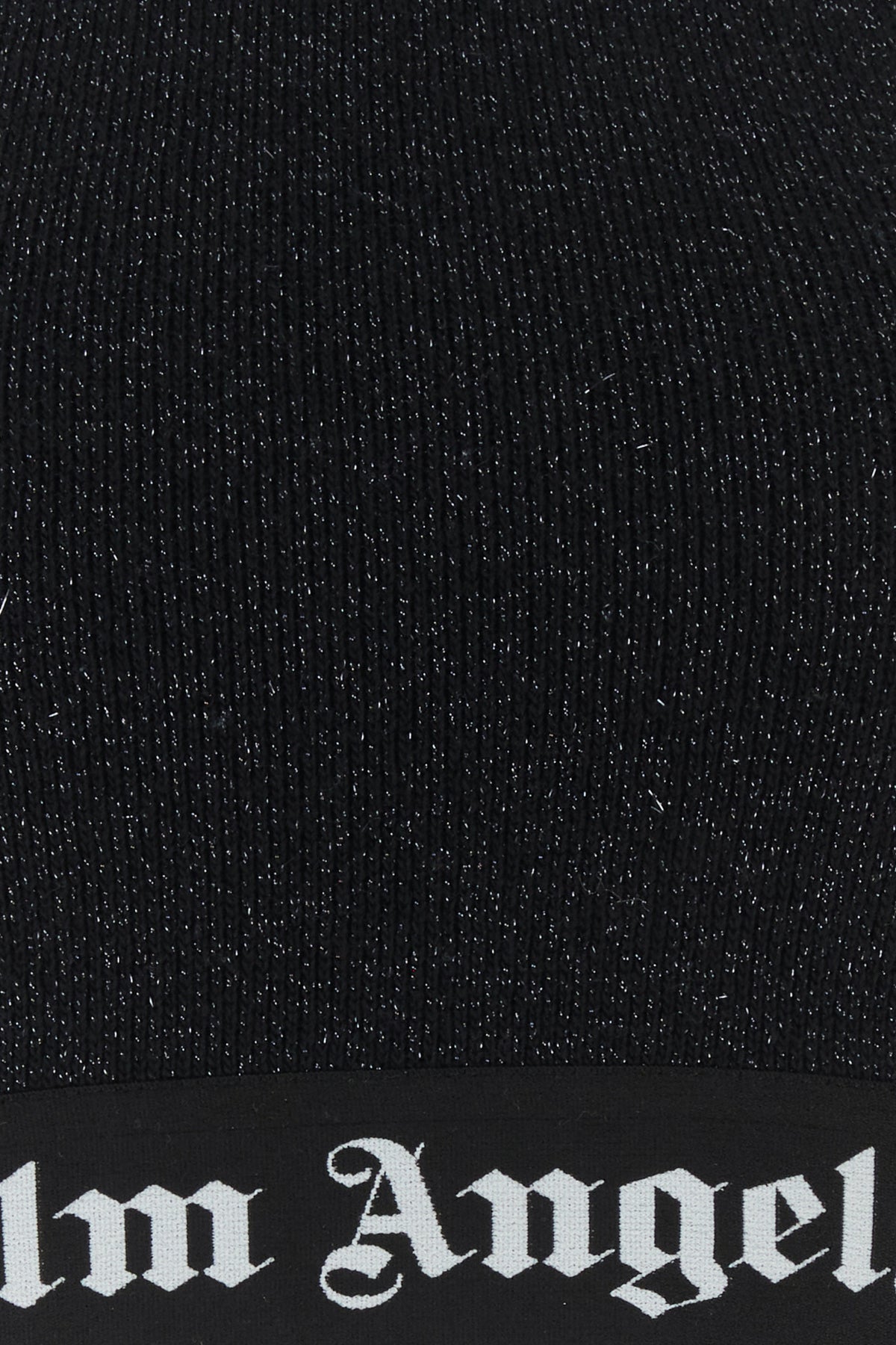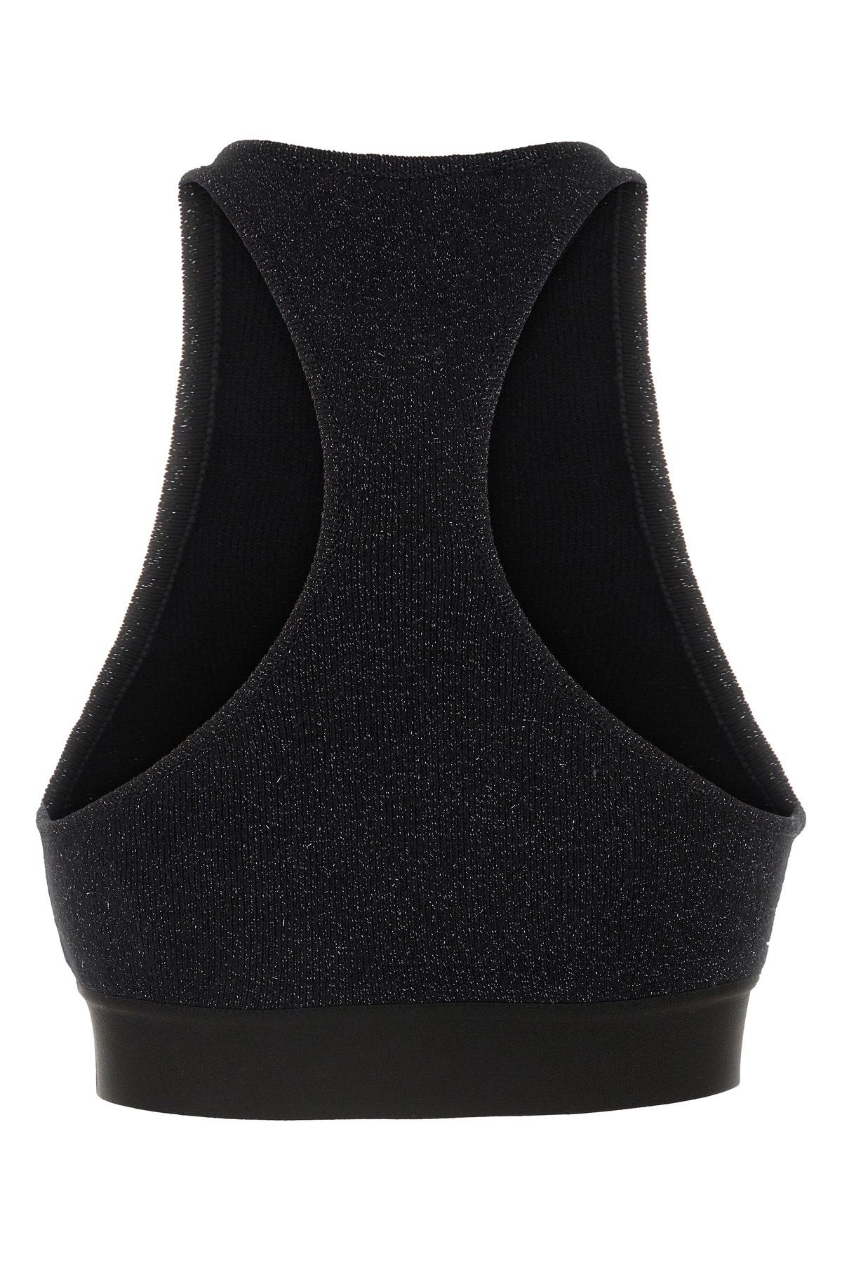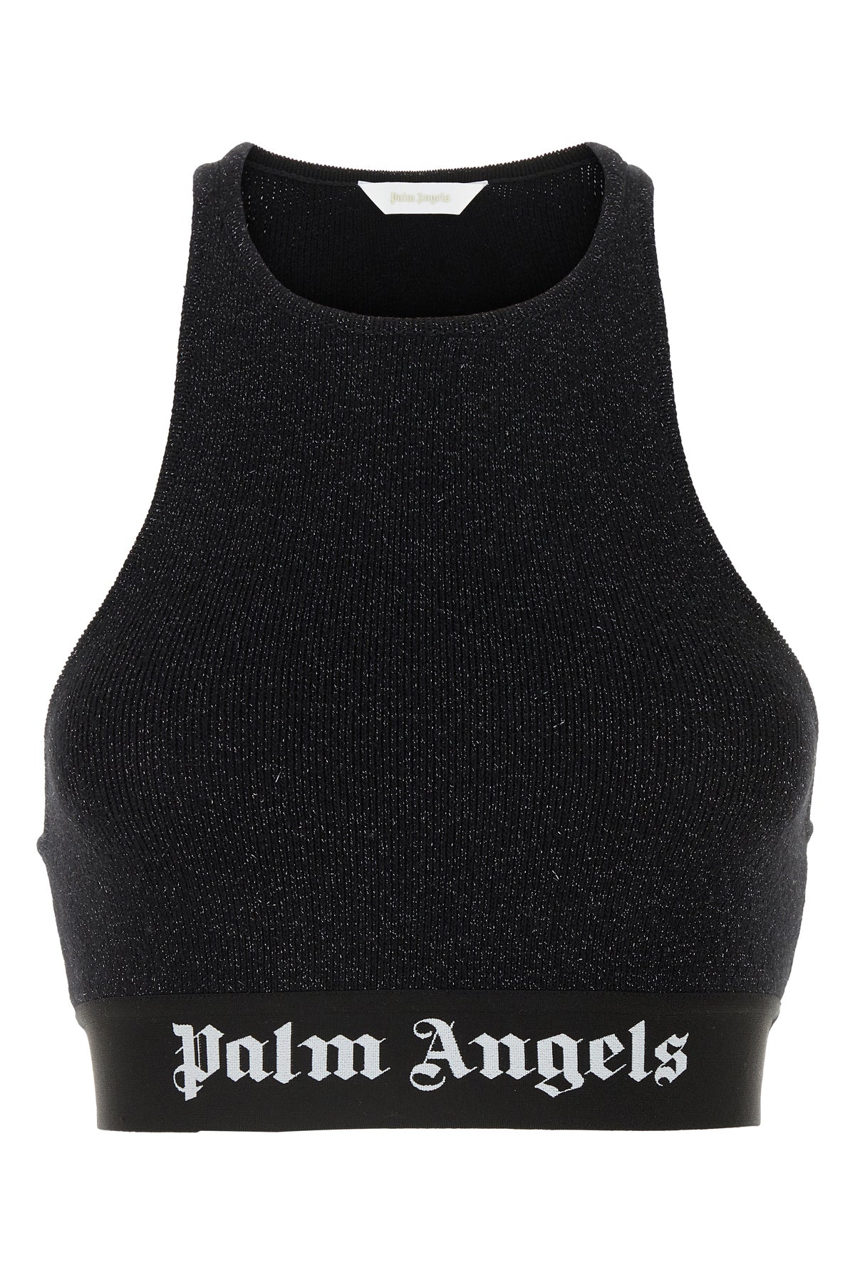 Crop-top realized in viscose blend with lurex threads characterized by contrasting embroidered logo on the elastic band on the hemline.