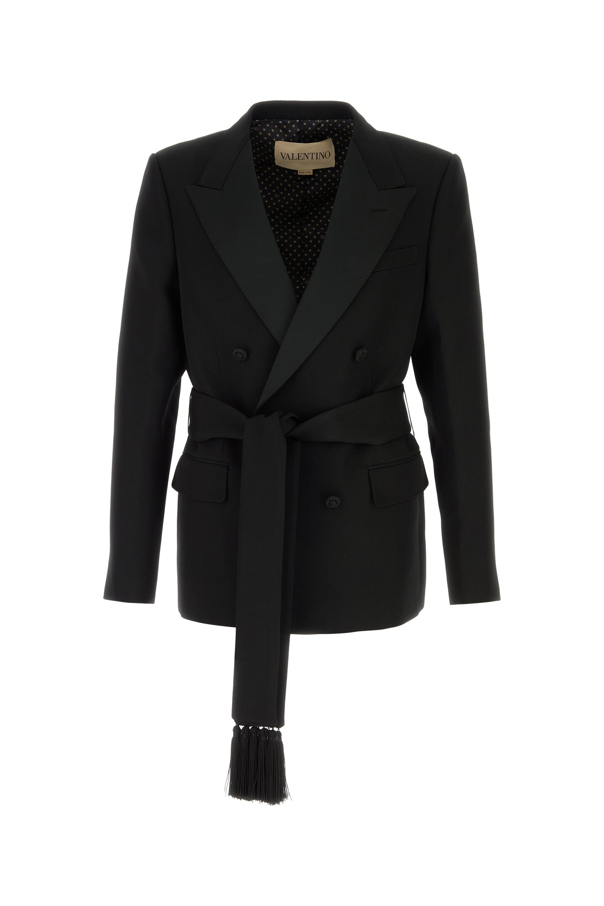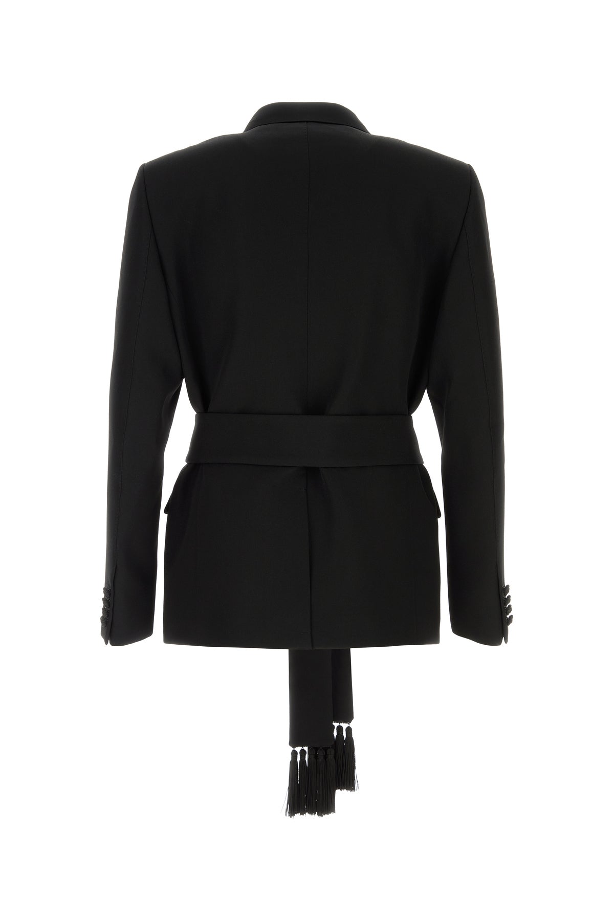 Blazer realized in pure virgin wool enriched by detachable belt with tassels to tie at the waist.