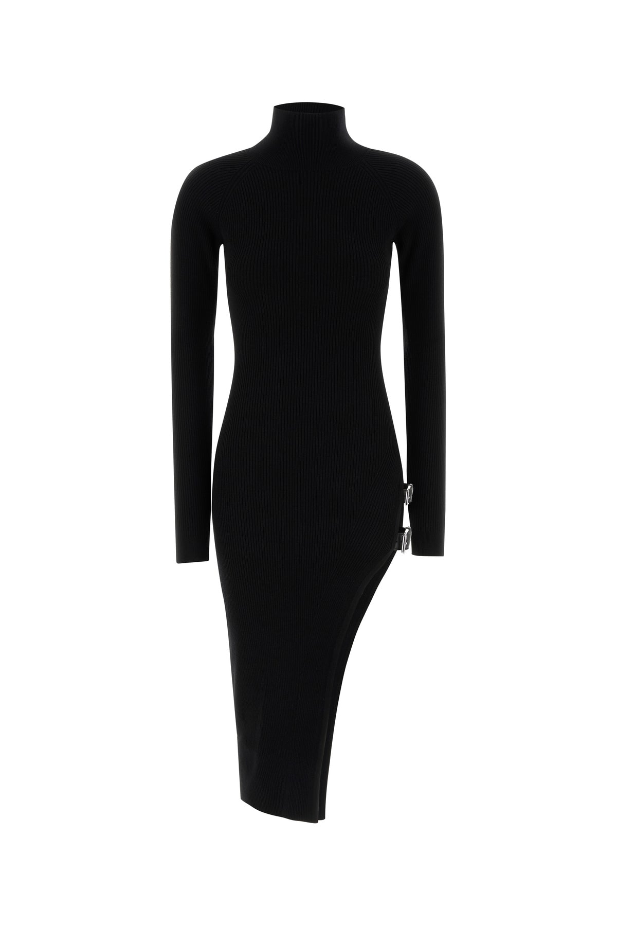 Fitted midi-length dress realized in ribbed pure virgin wool enriched by adjustable leather straps with metal details on the side.