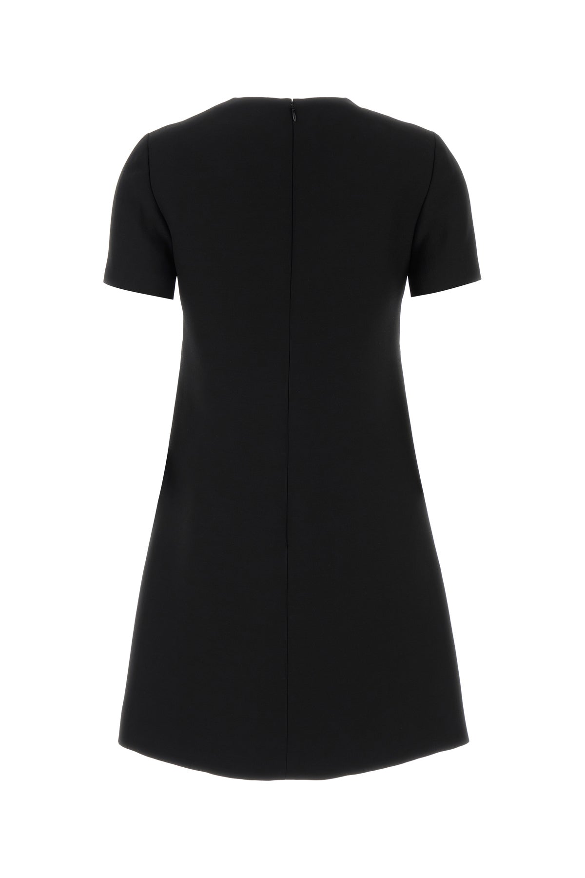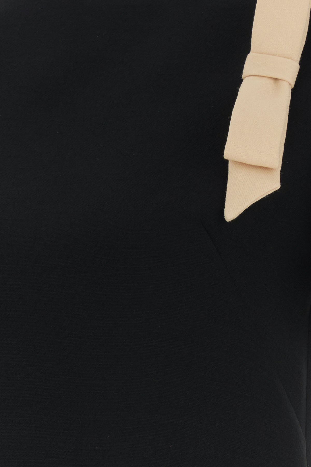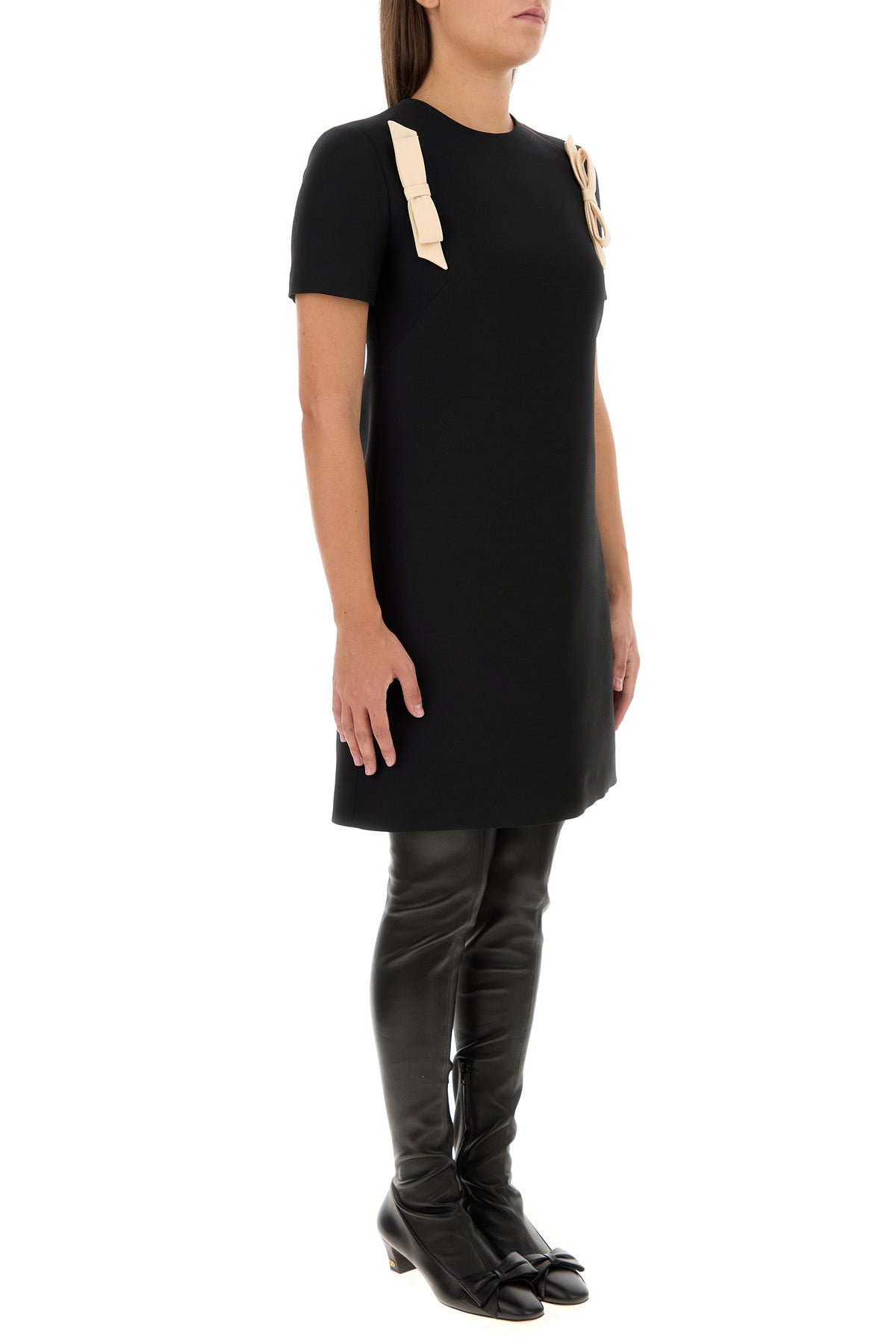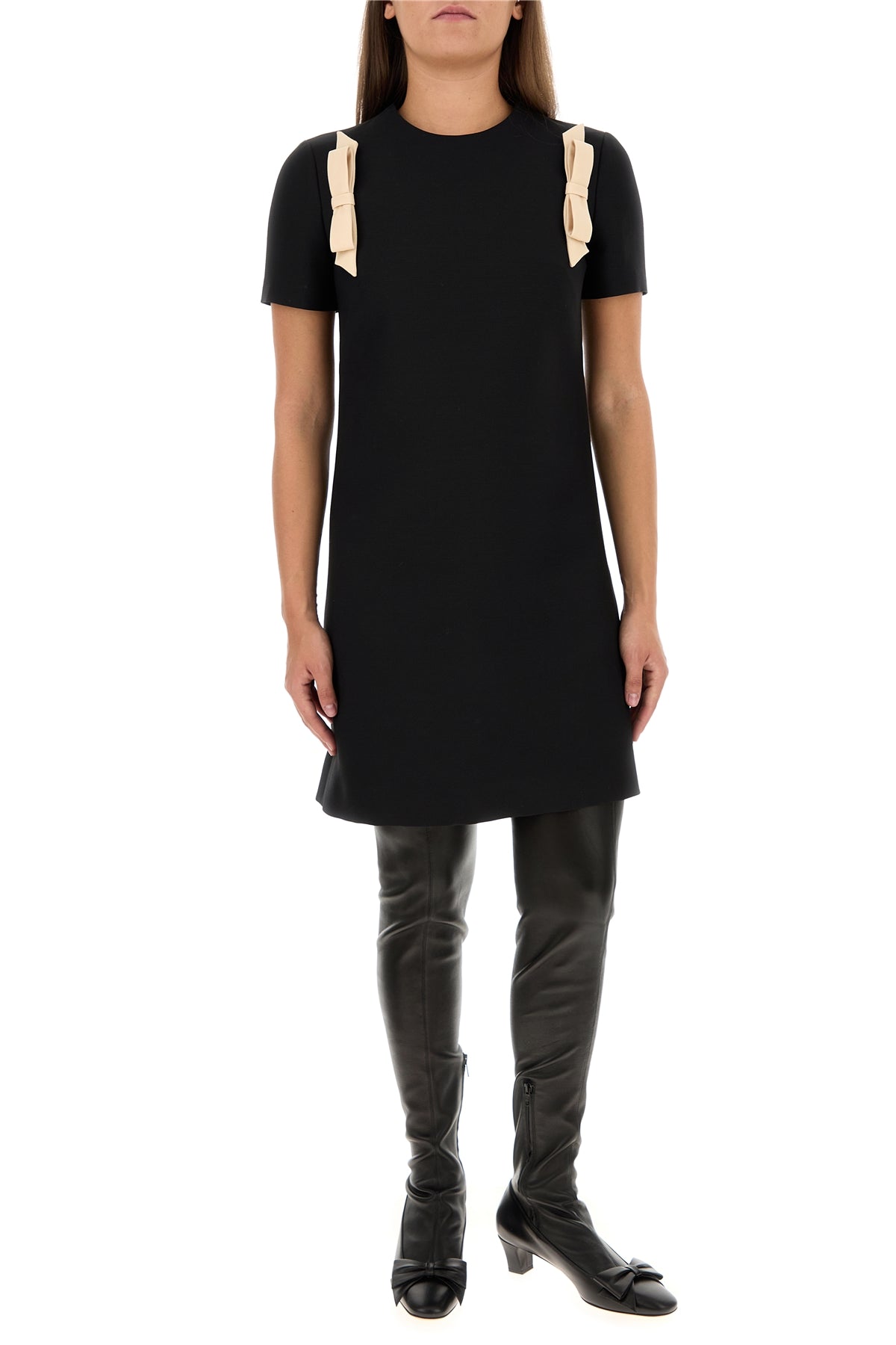 Dress realized in virgin wool and silk enriched by decorative bows at the top.