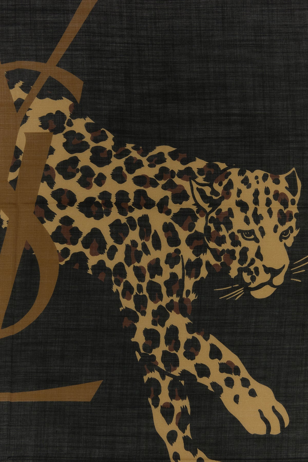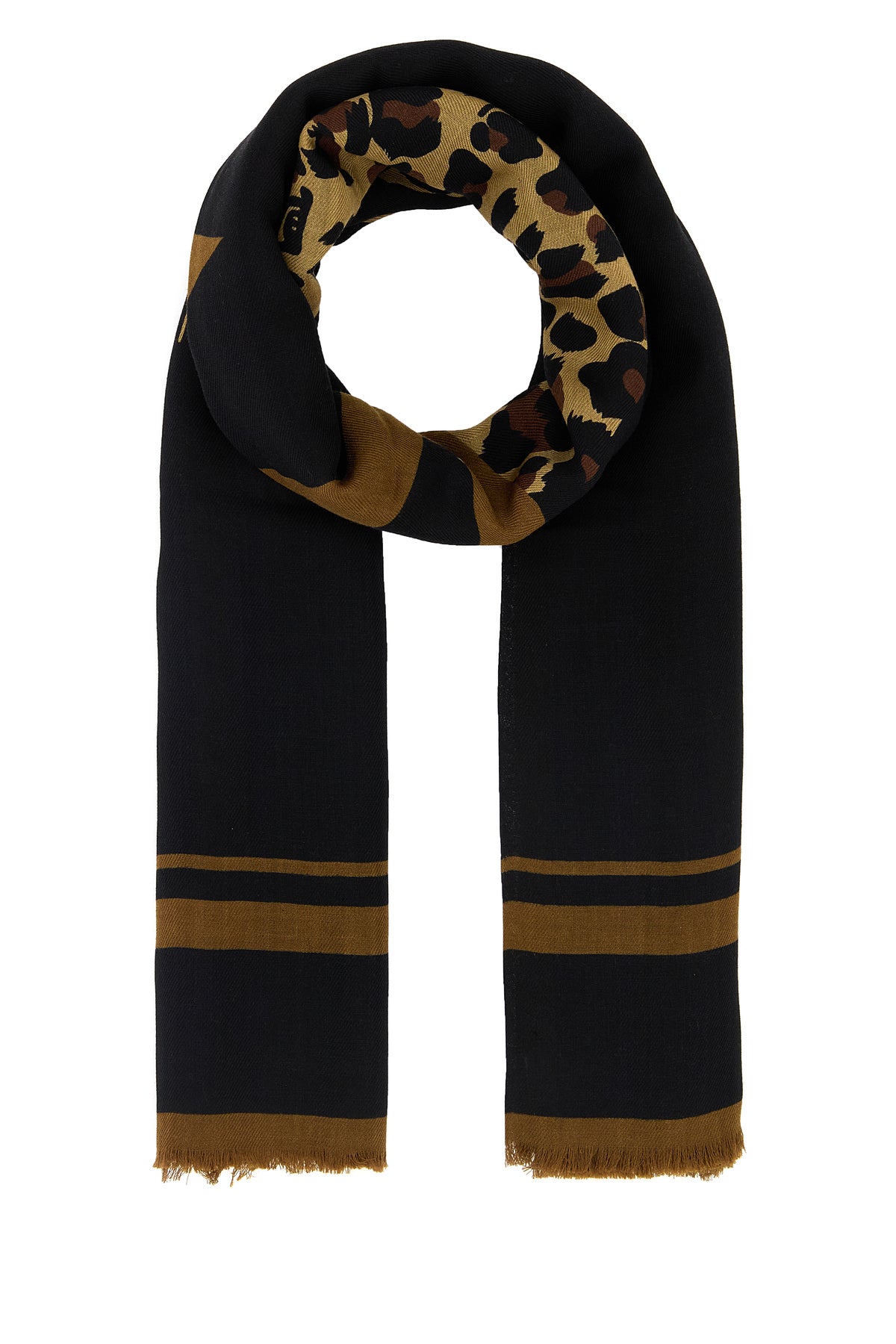 Foulard realized in pure wool characterized by Leopard print and Cassandre print at the front.