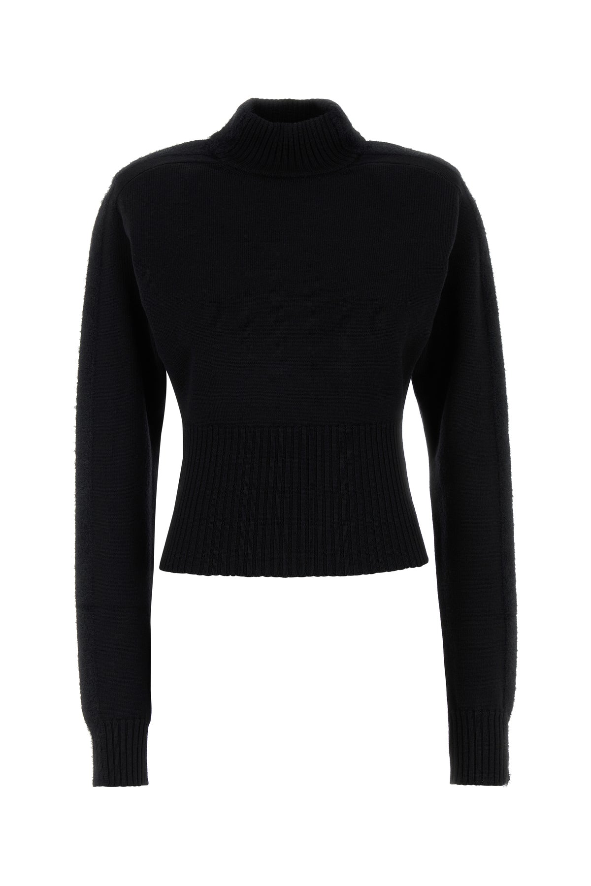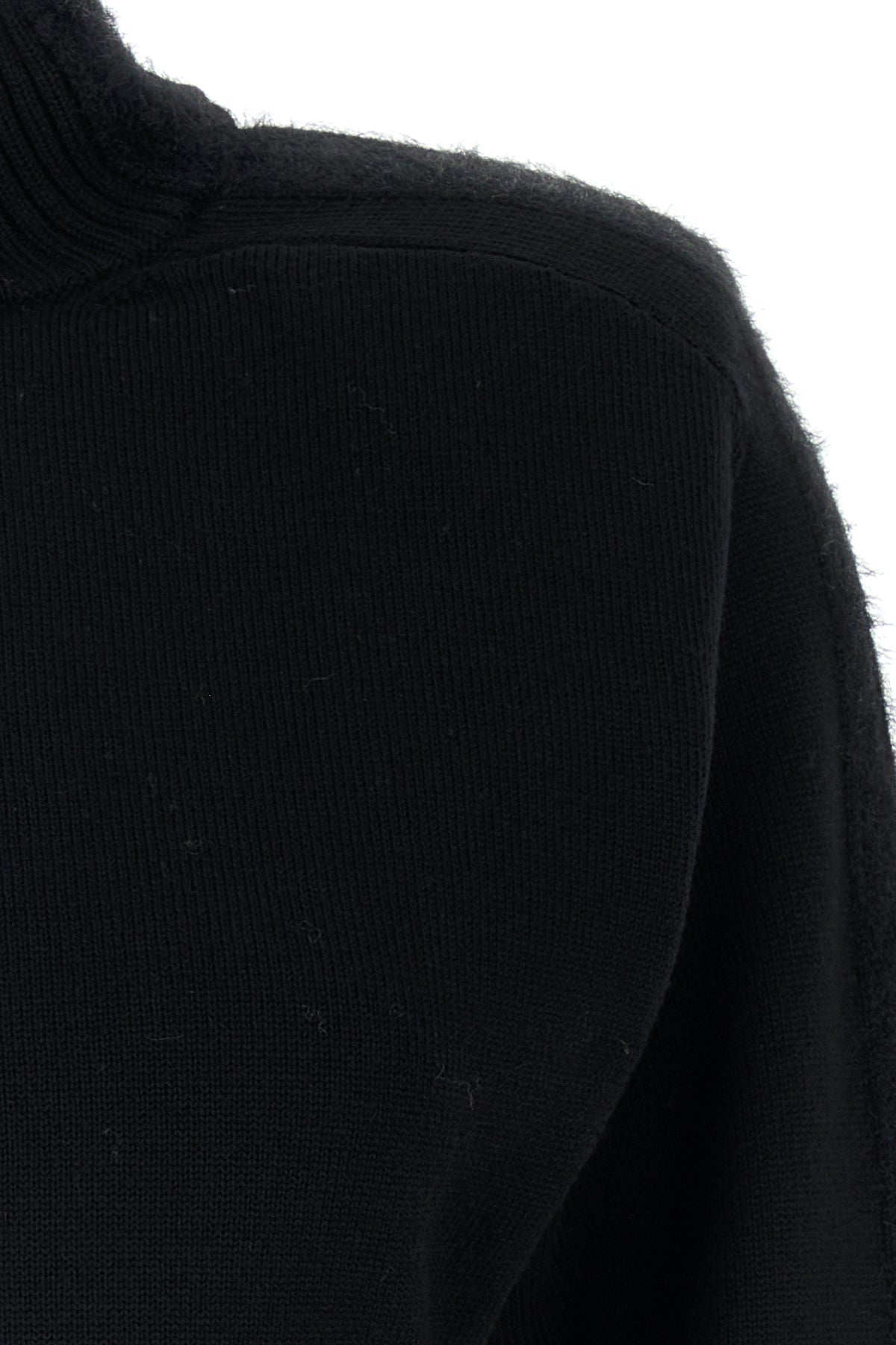 Sweater realized in pure virgin wool characterized by padded shoulders.