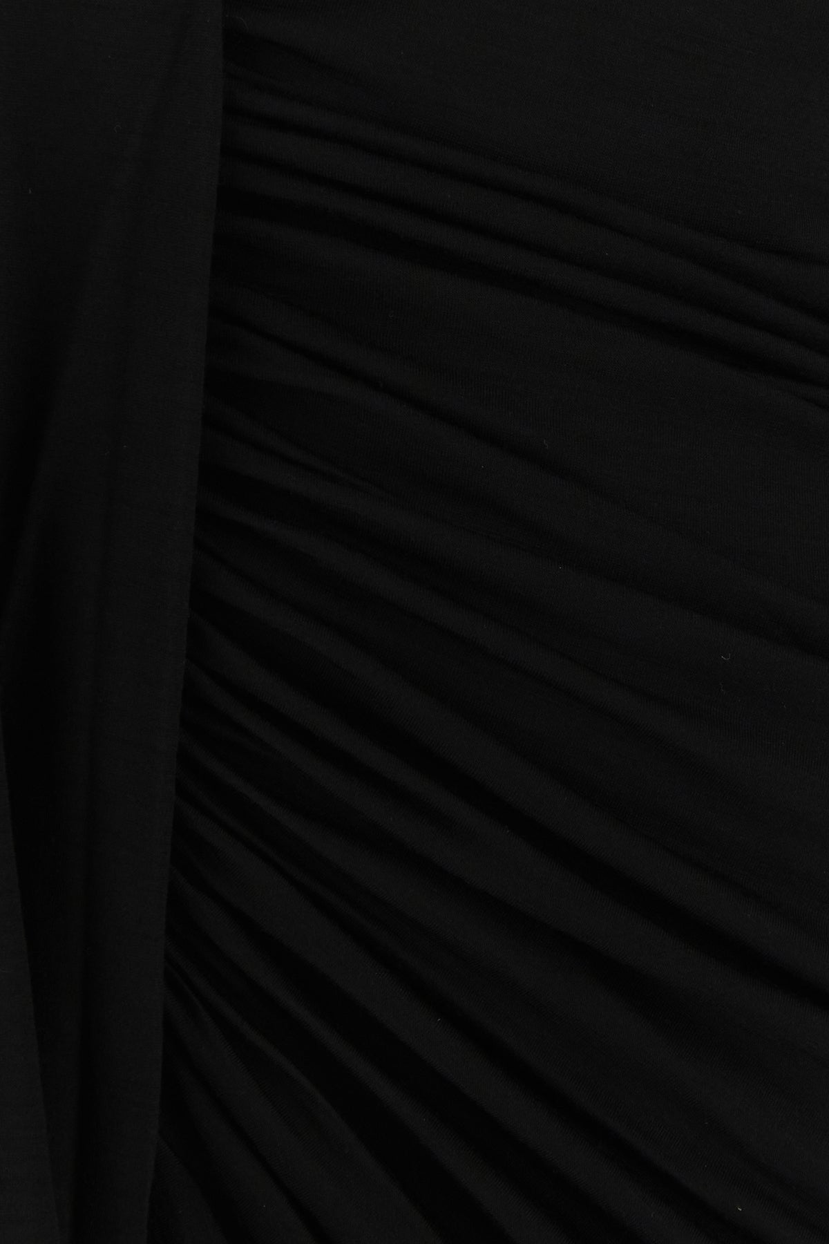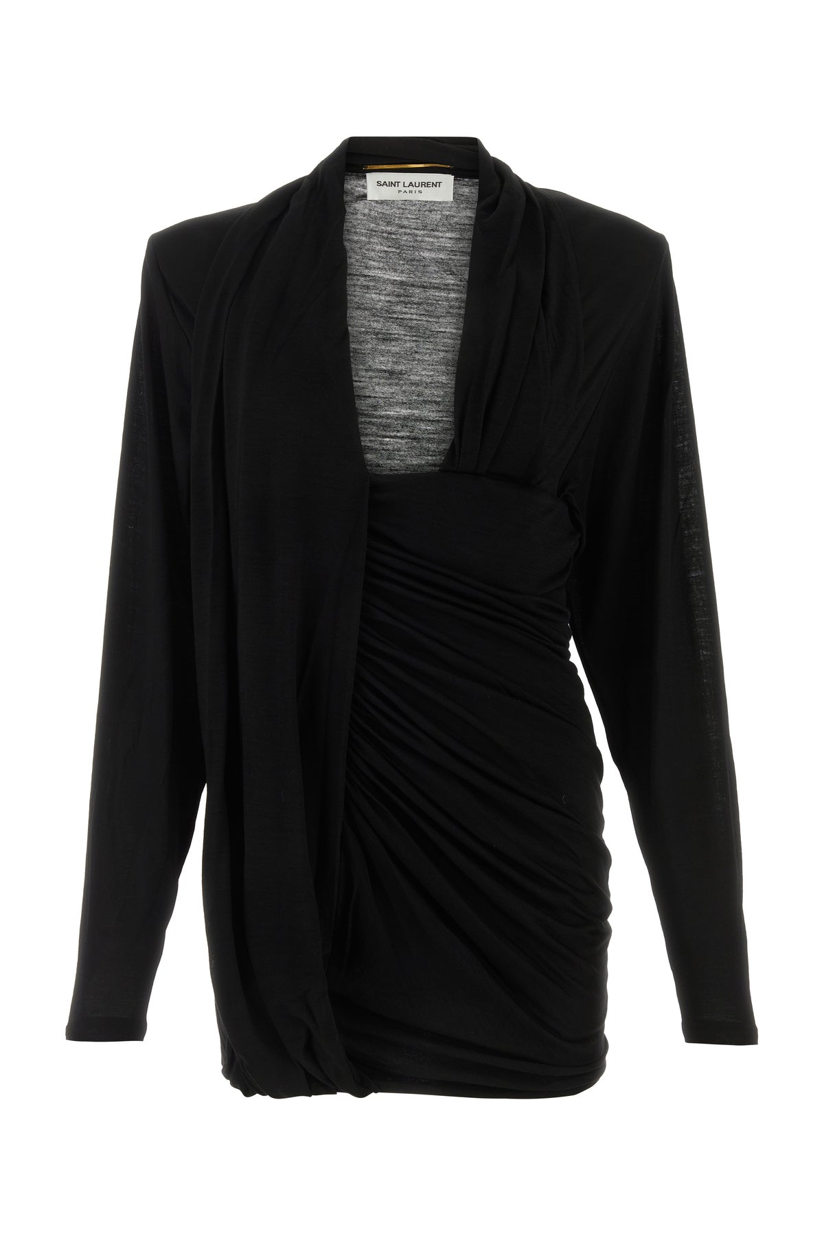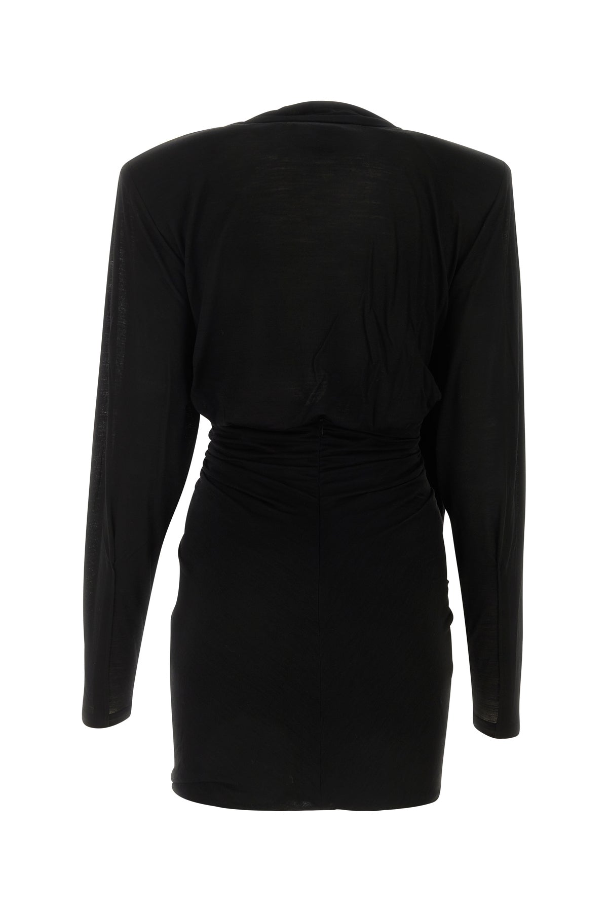 Draped mini dress realized in pure wool characterized by deep V neckline.