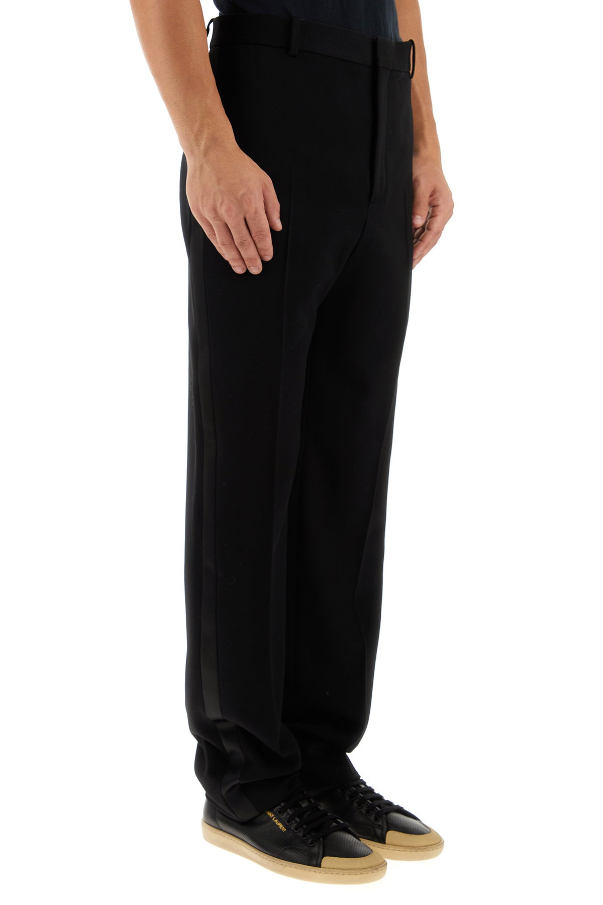Pant realized in pure wool characterized by ironed central pleats enriched by tonal fabric bands on the sides.