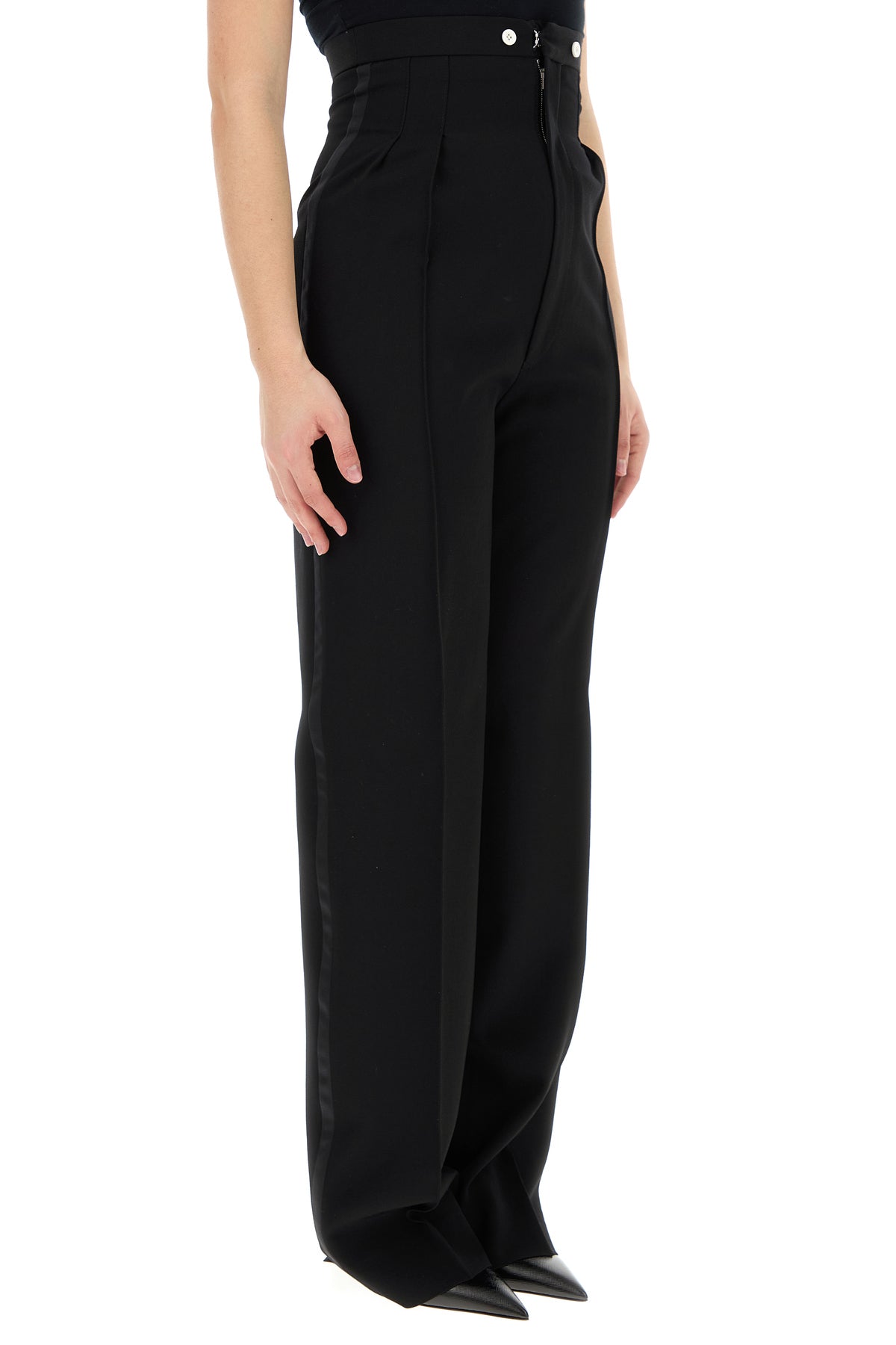 High waist pant realized in pure wool enriched by contrasting iconic stitchings at the back.