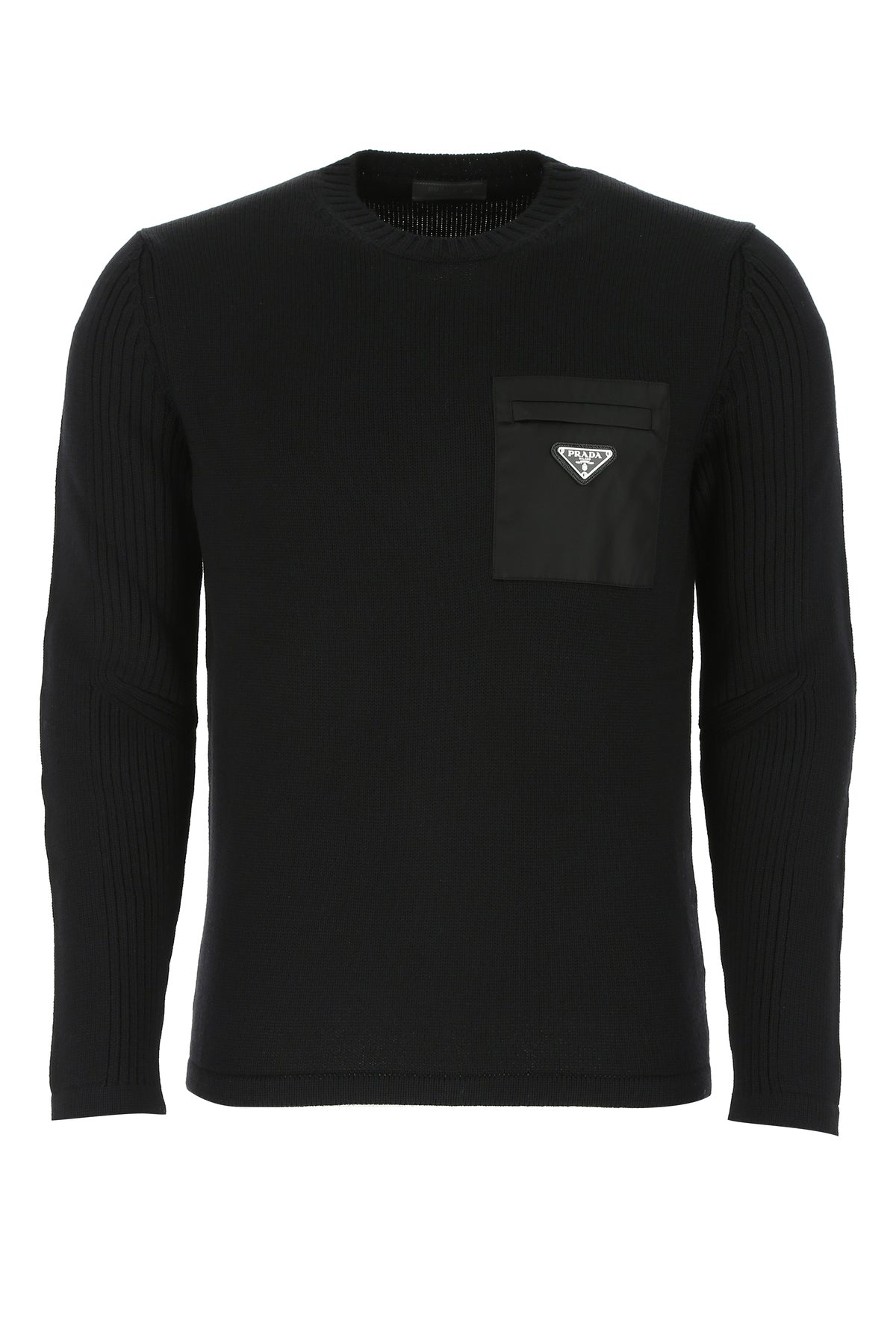 Sweater realized in pure virgin wool enriched by iconic metal triangle on the chest.