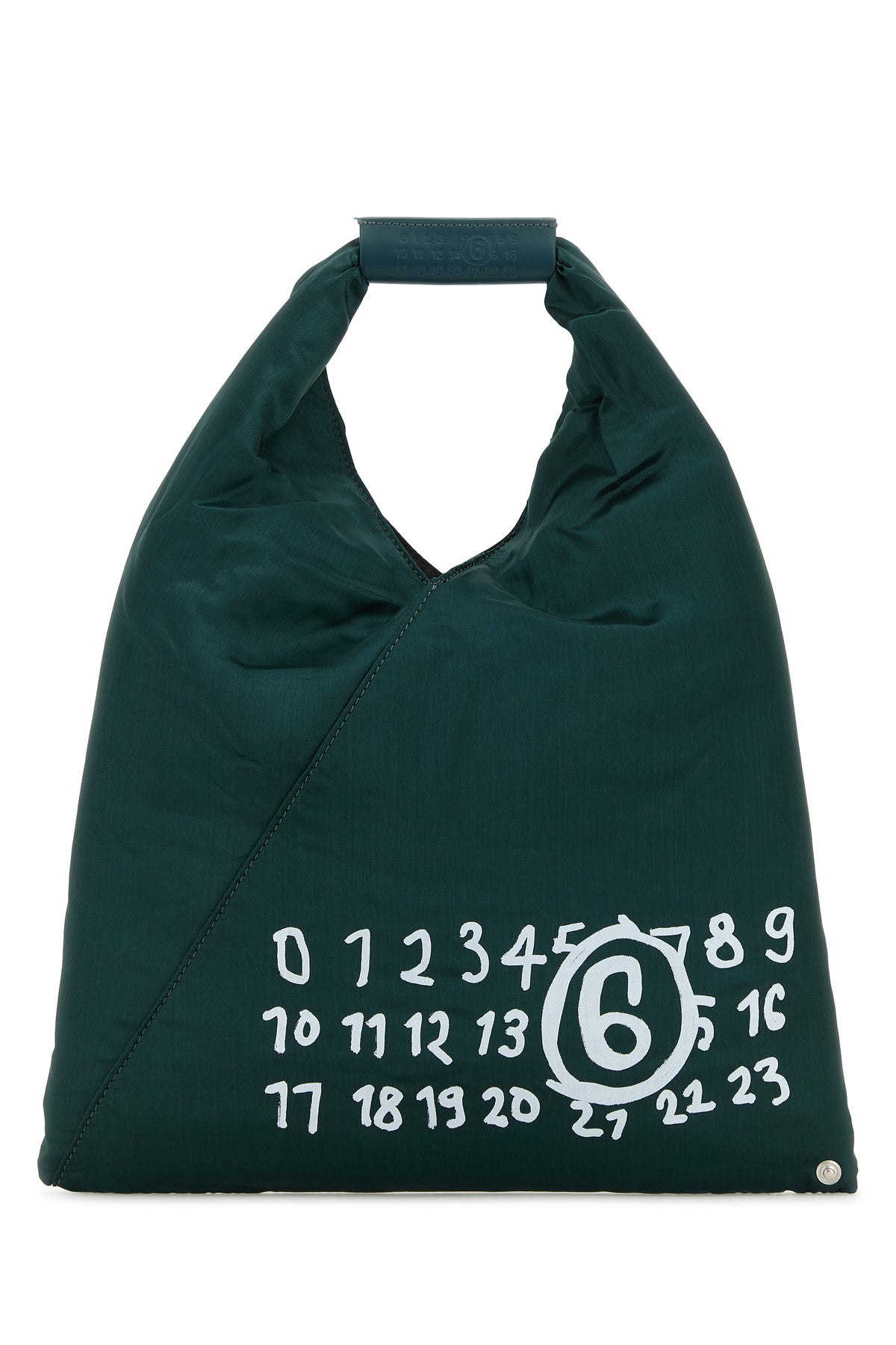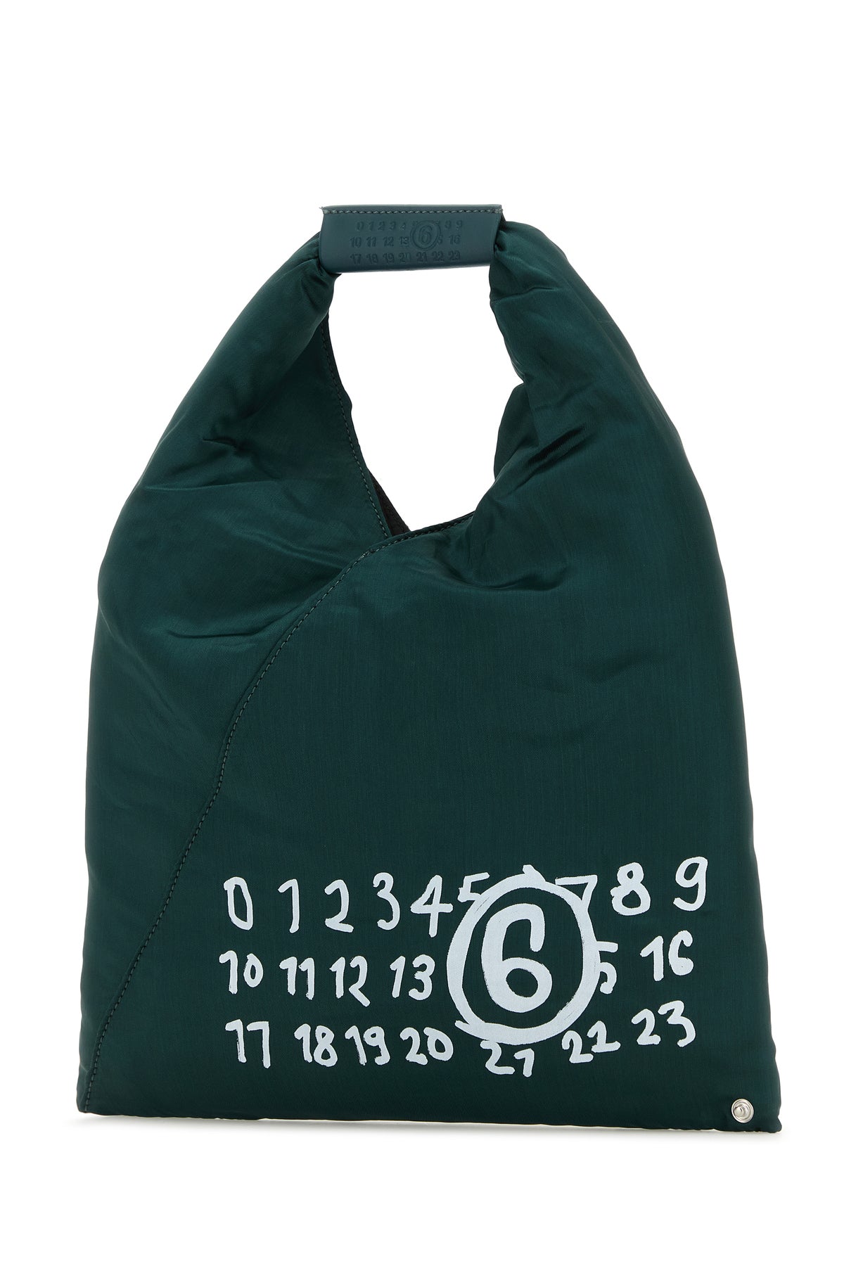 Handbag realized in rayon characterized by contrasting printed logo at the front, embossed logo on the handle and contrasting stitching at the back.