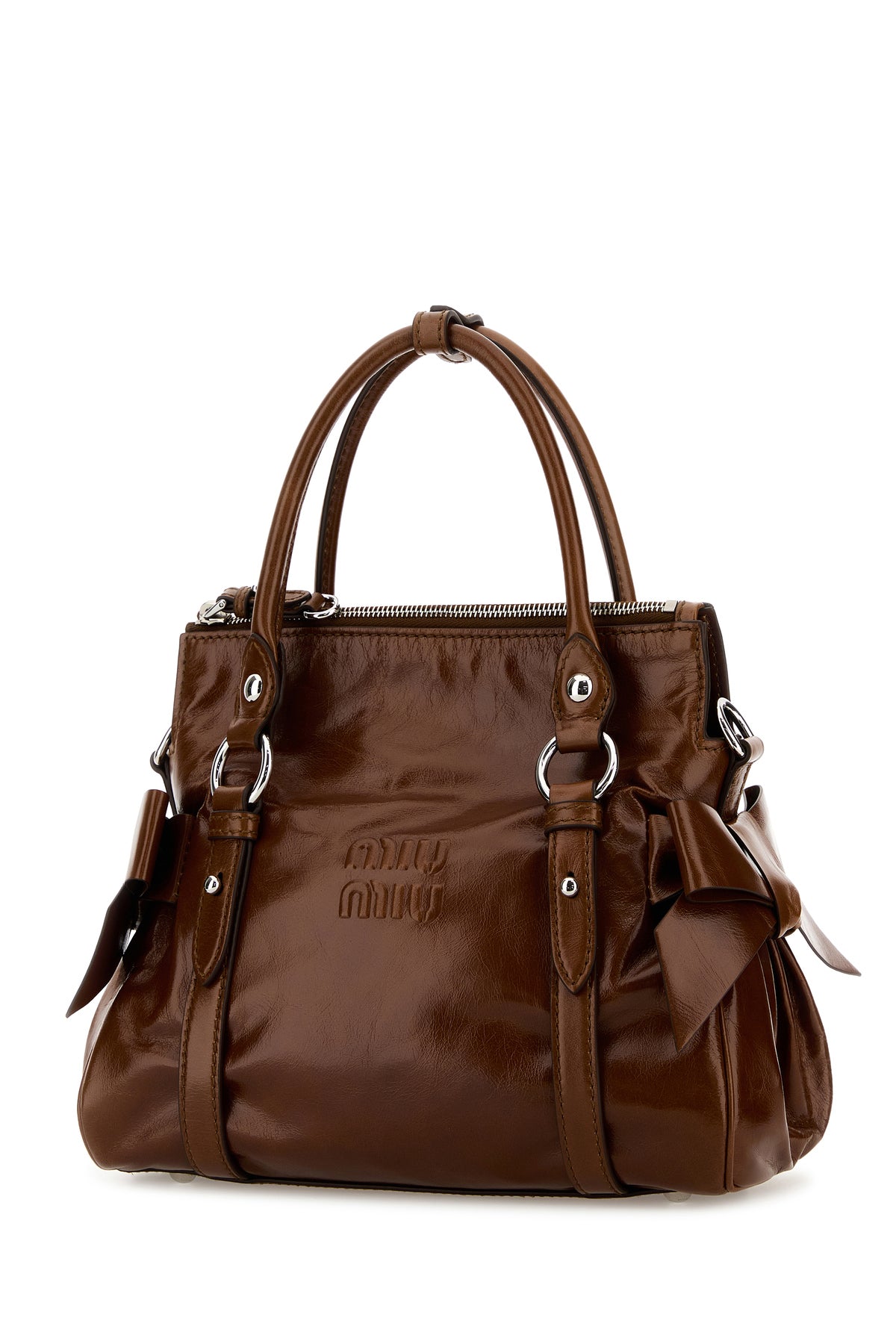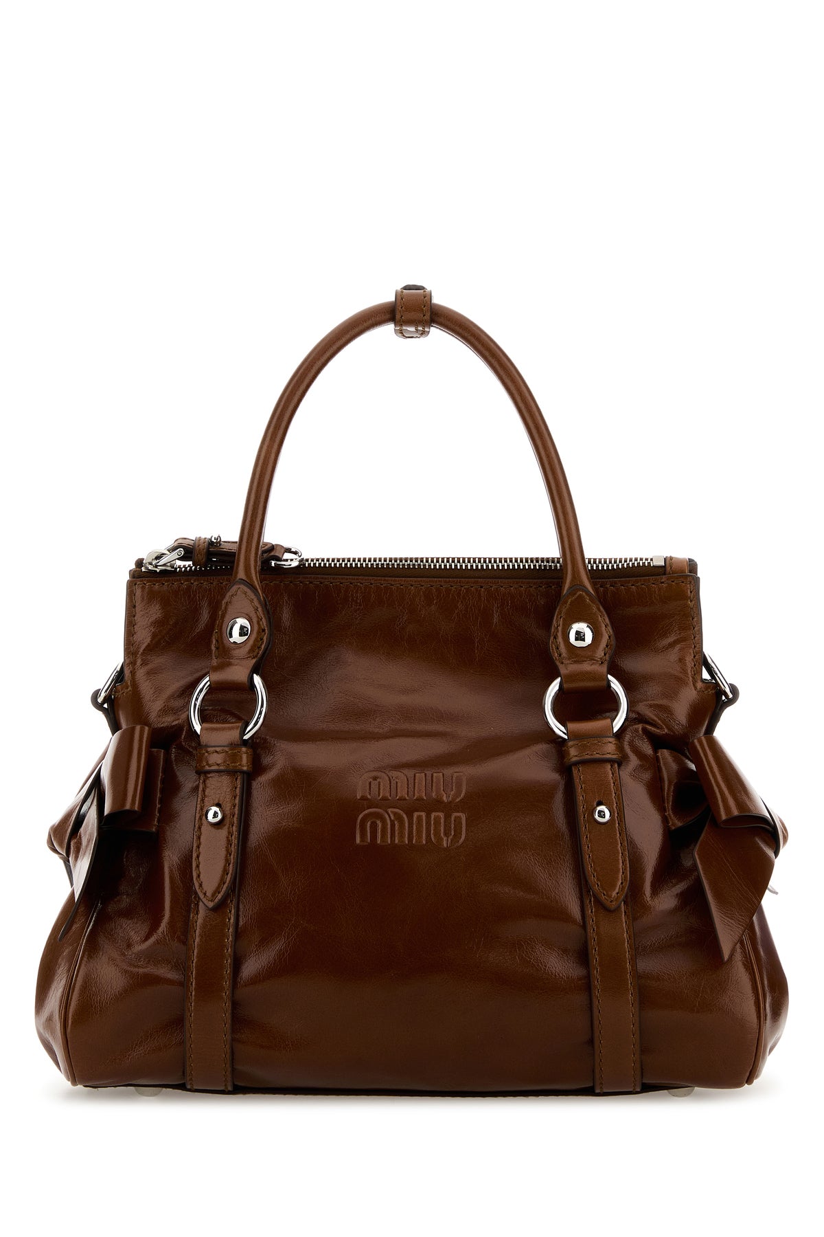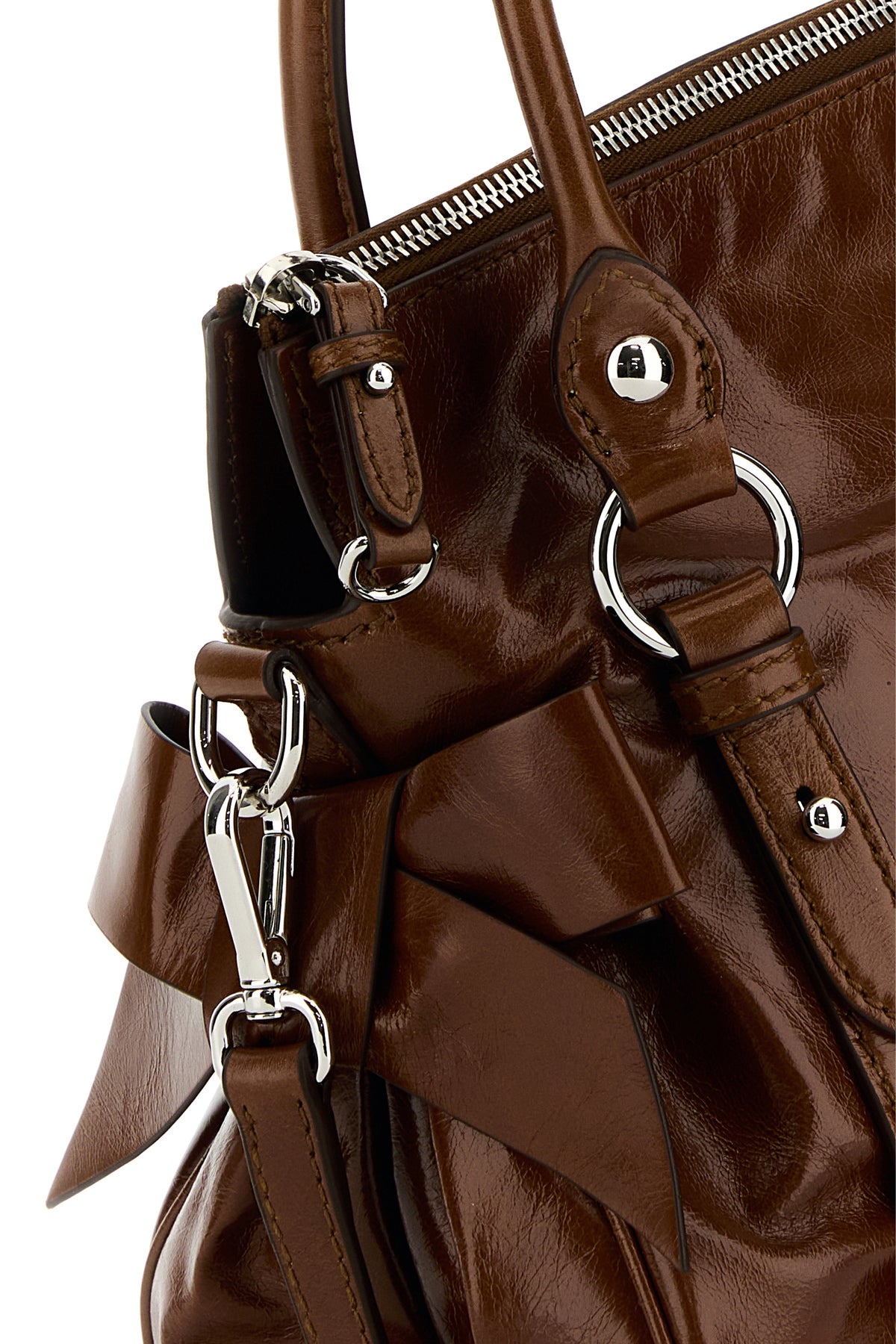 Handbag realized in calf leather characterized by logo in relief at the front enriched by decorative bows on the sides.