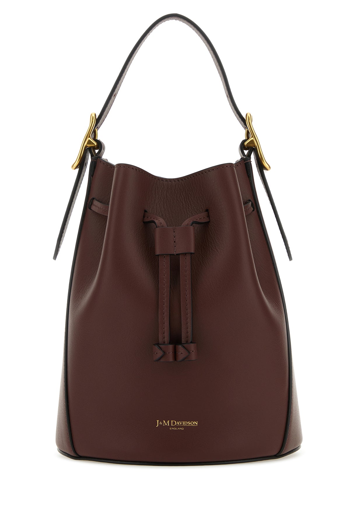Bucket bag realized in smooth calf leather characterized by contrasting printed logo at the front.