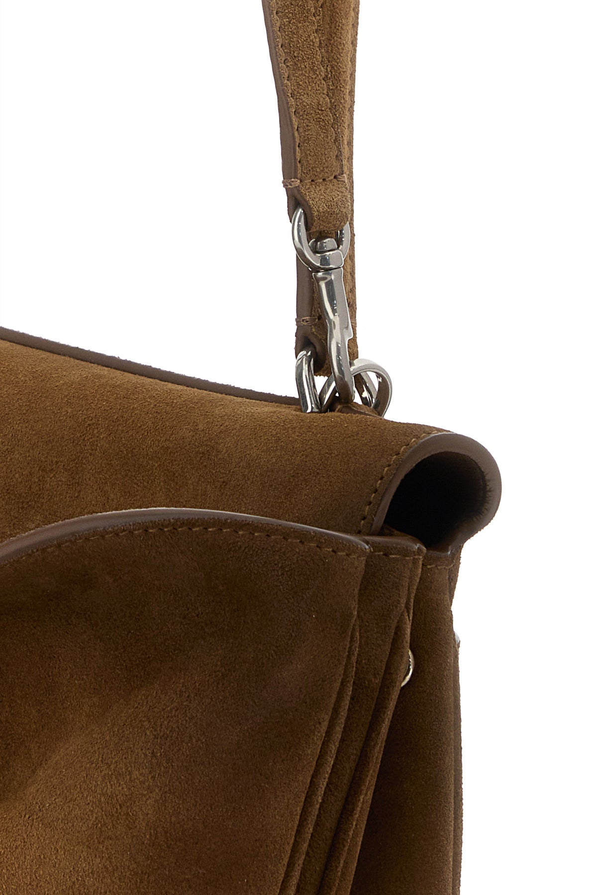 Handbag realized in vintage effect calf suede enriched by detachable tonal leather accessory with metal rings.