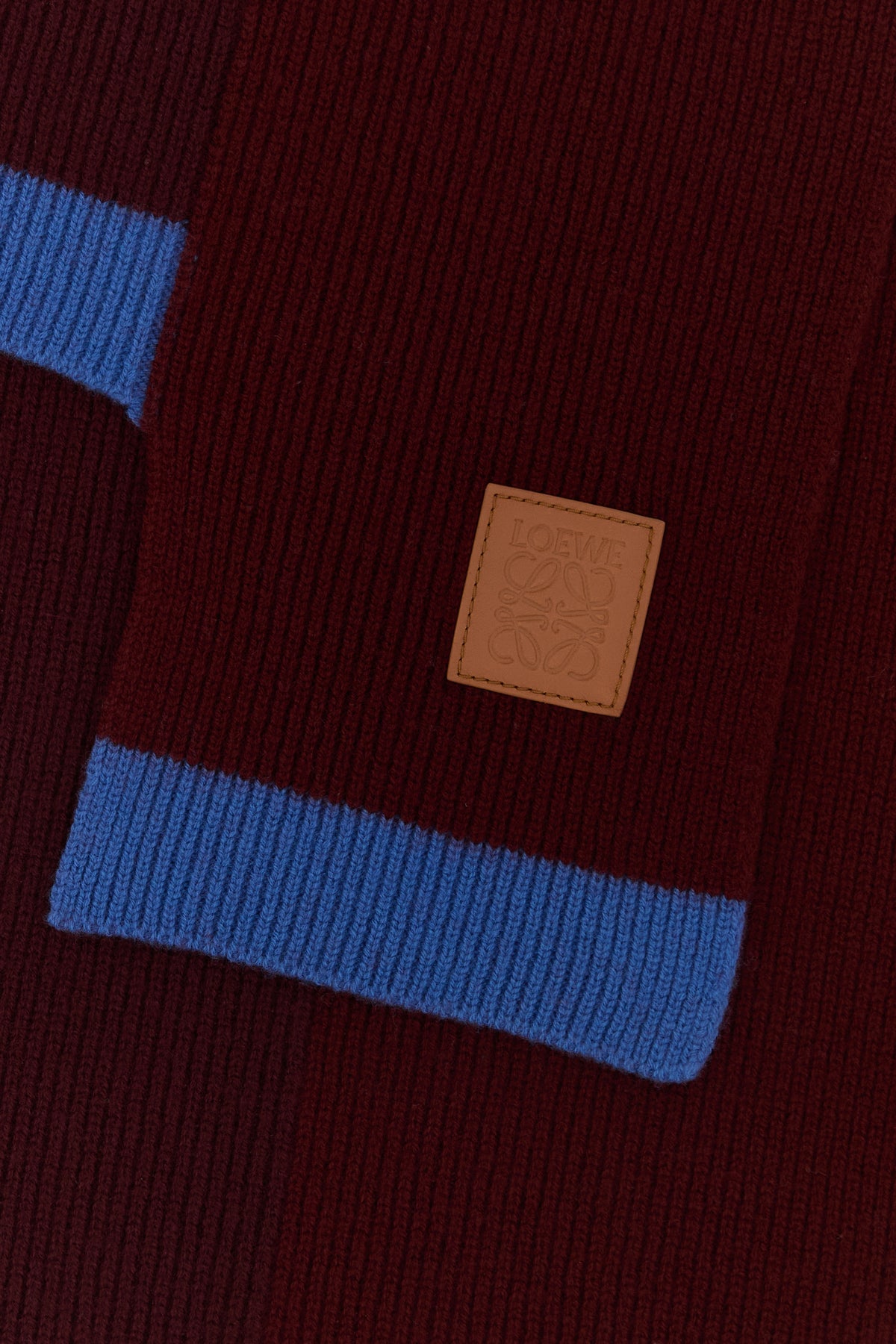 Asymmetric scarf realized in pure wool with contrasting trimmings enriched by leather Anagram LOEWE patch on the hemline.