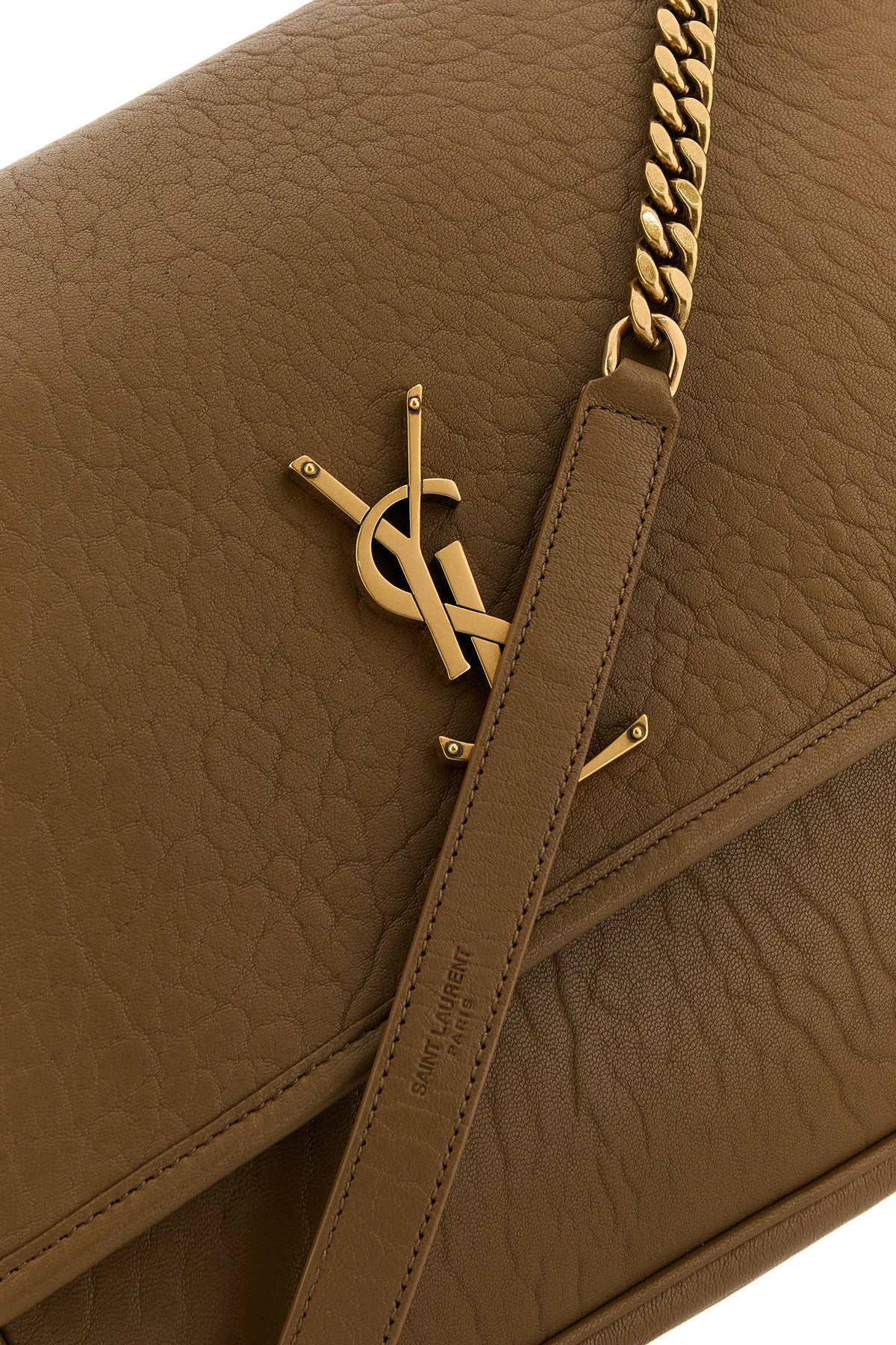 - Two metal chain handles with tonal leather shoulder pads