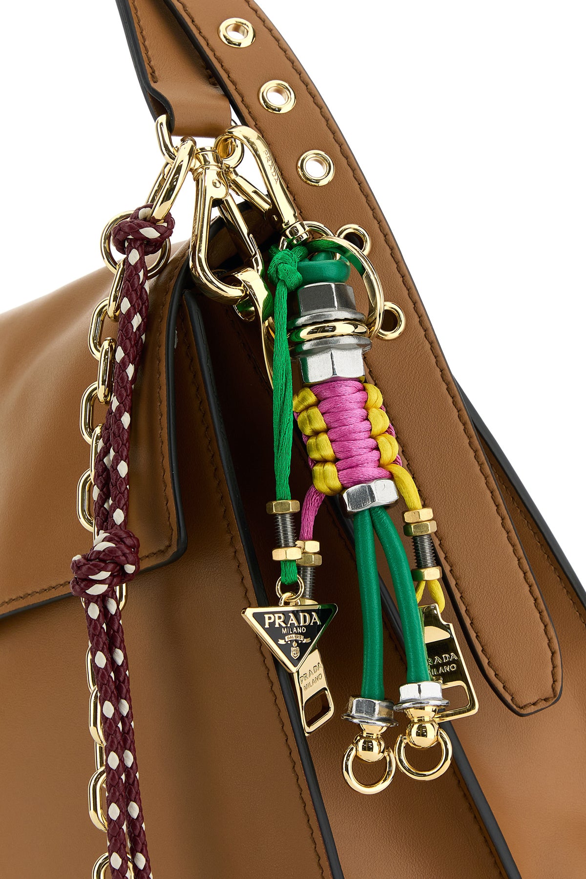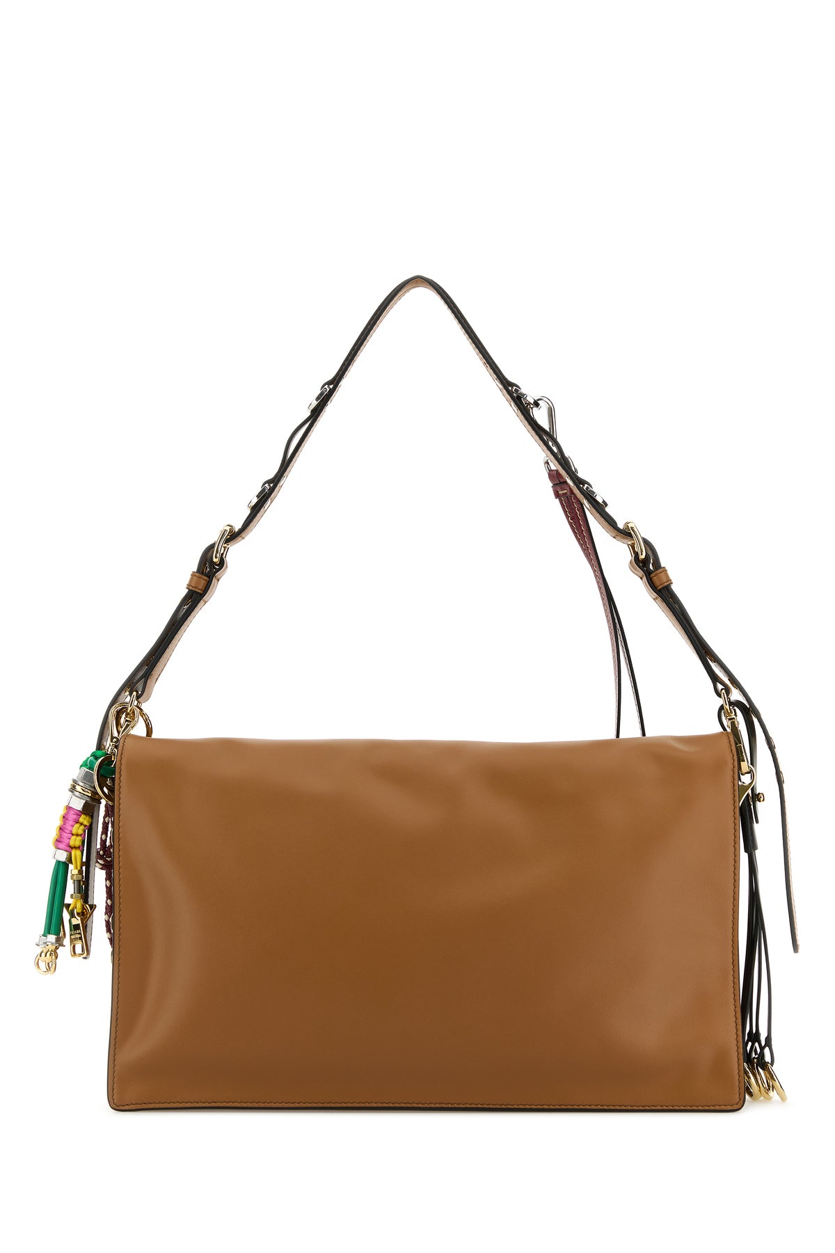 Shoulder bag realized in slightly pebble leather enriched by logoed metal detail at the front and detachable peculiar accessories on the shoulder strap.