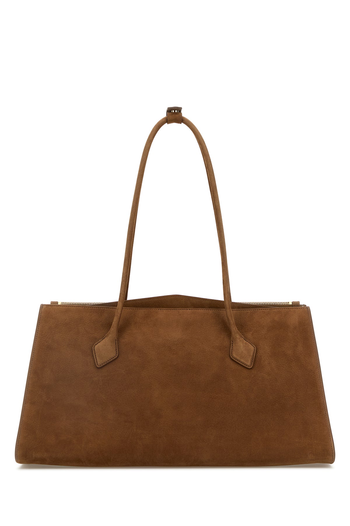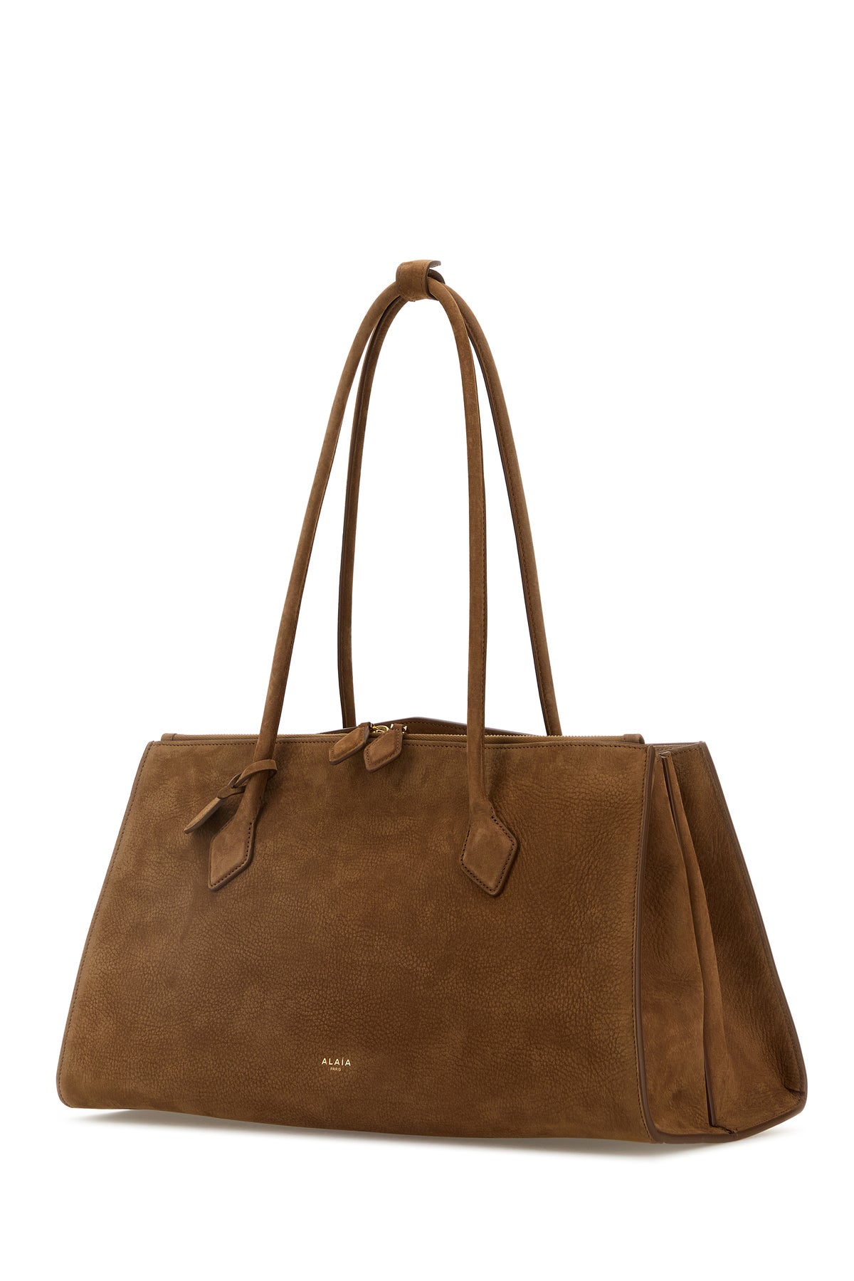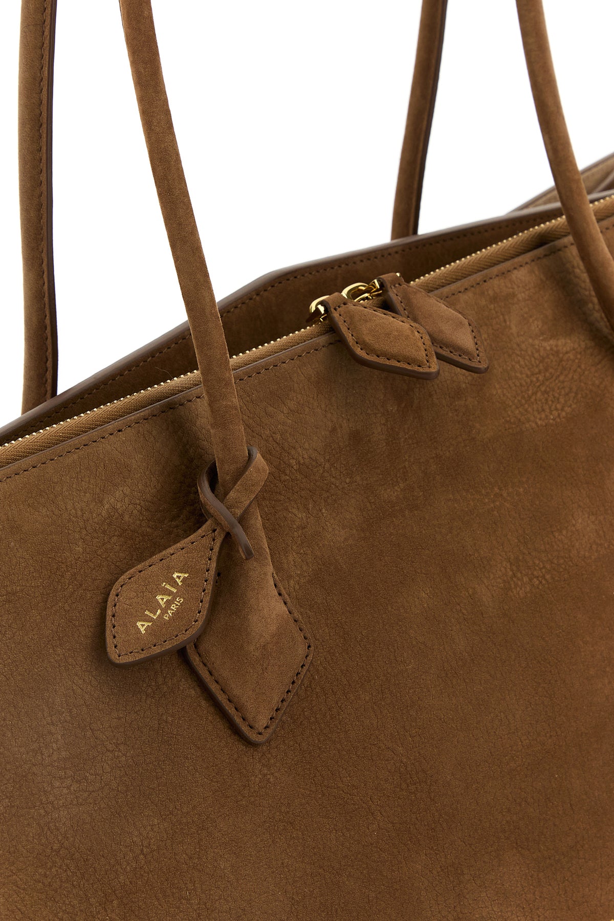 Shopping bag realized in nubuck characterized by laminated printed logo at the front enriched by detachable tonal leather logoed accessory.