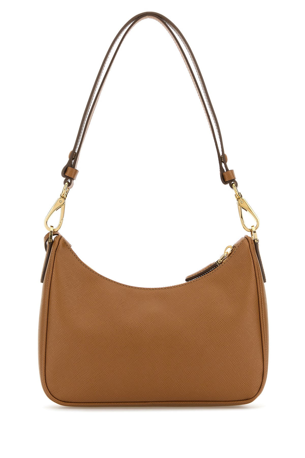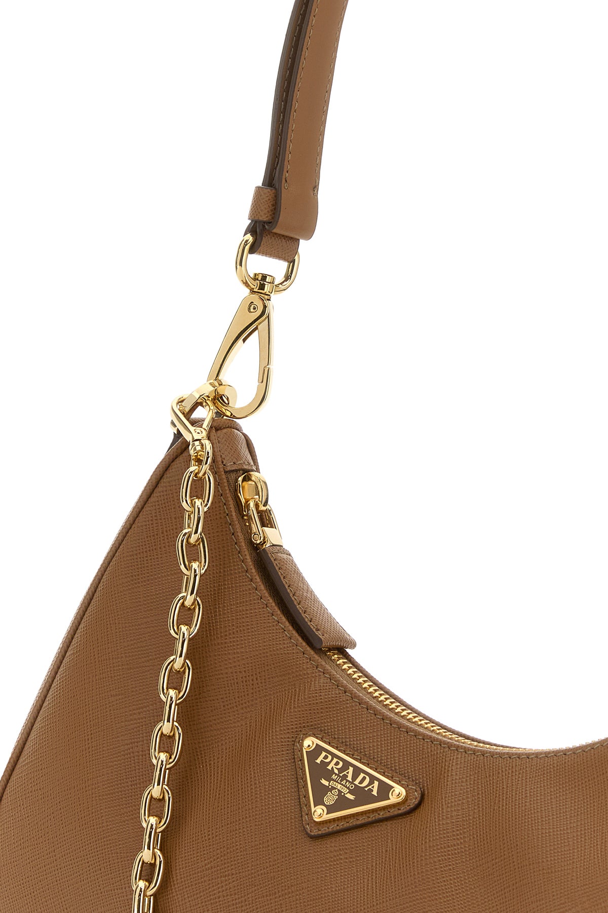 Shoulder bag realized in Saffiano leather enriched by iconic logoed triangle at the front and detachable leather logoed accessory with metal key ring.