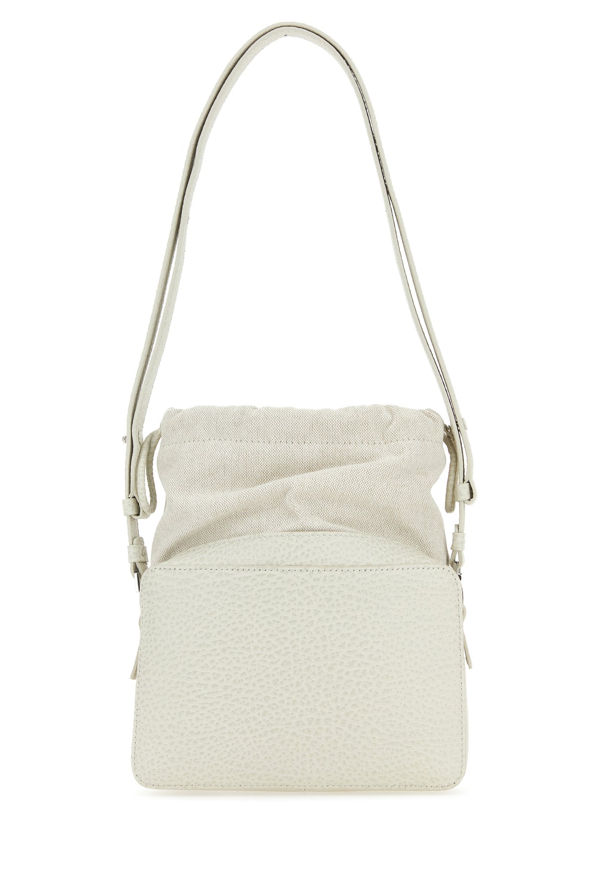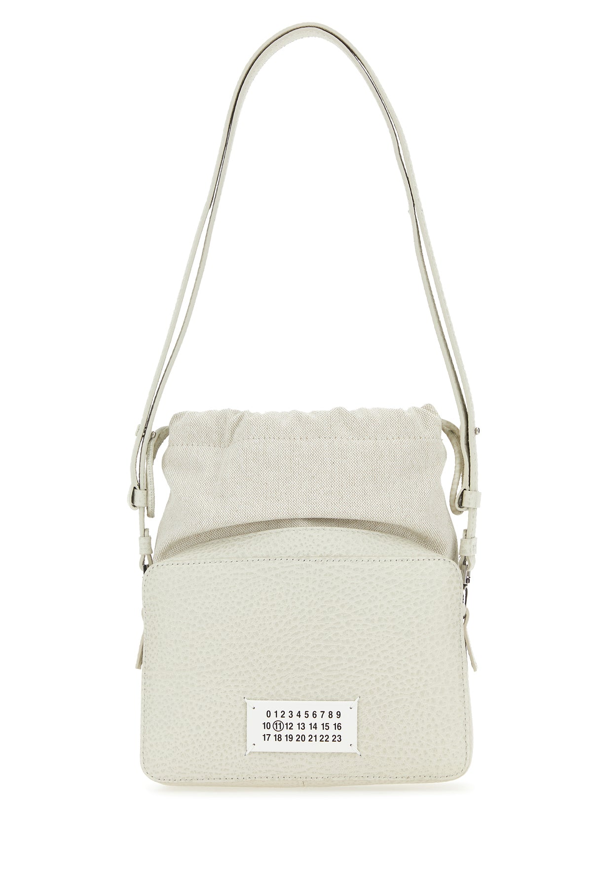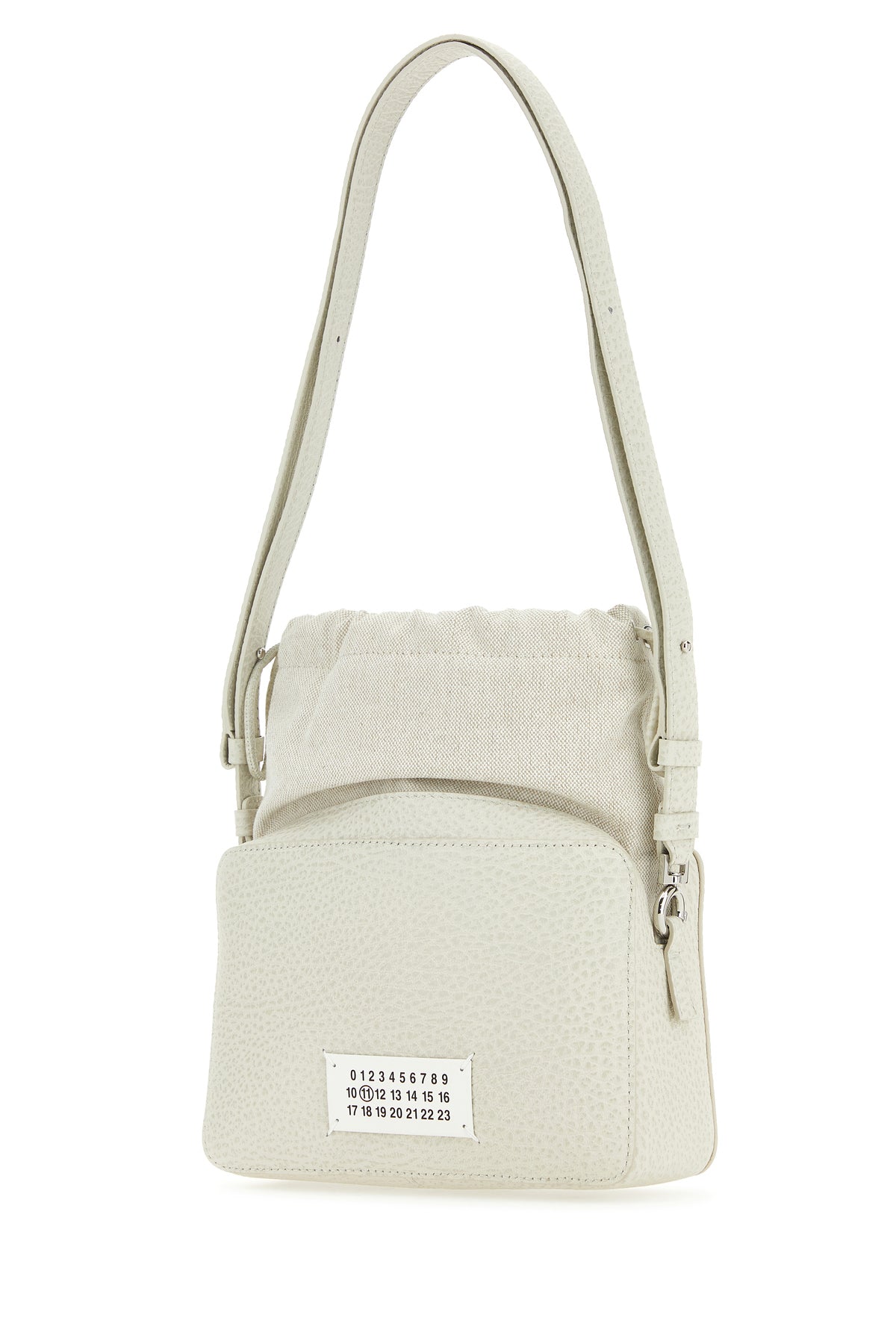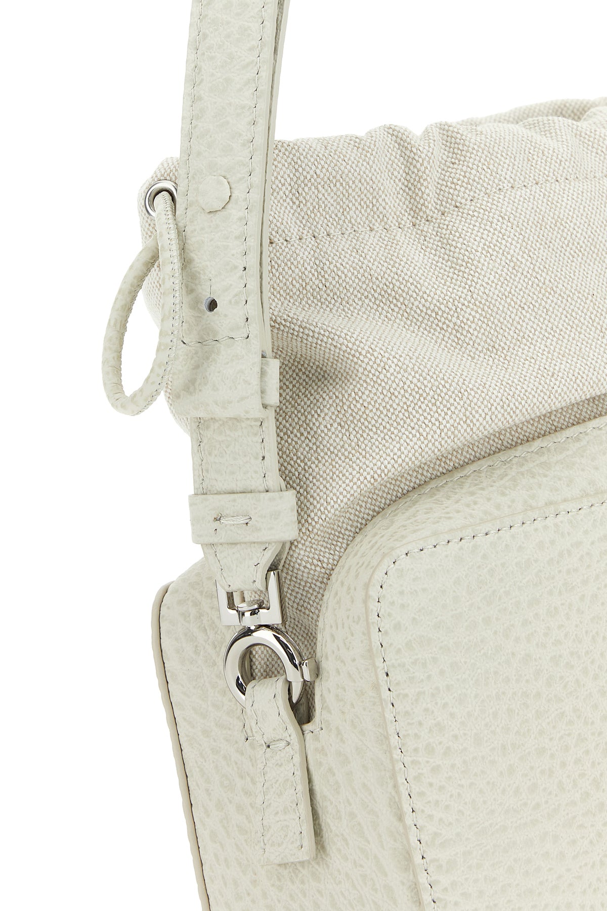 Bucket bag realized in pebble bovine leather and fabric enriched by contrasting leather logoed label at the front.