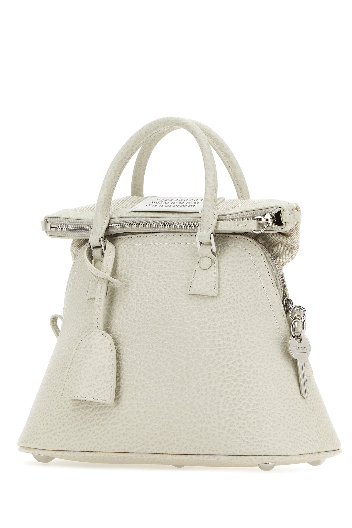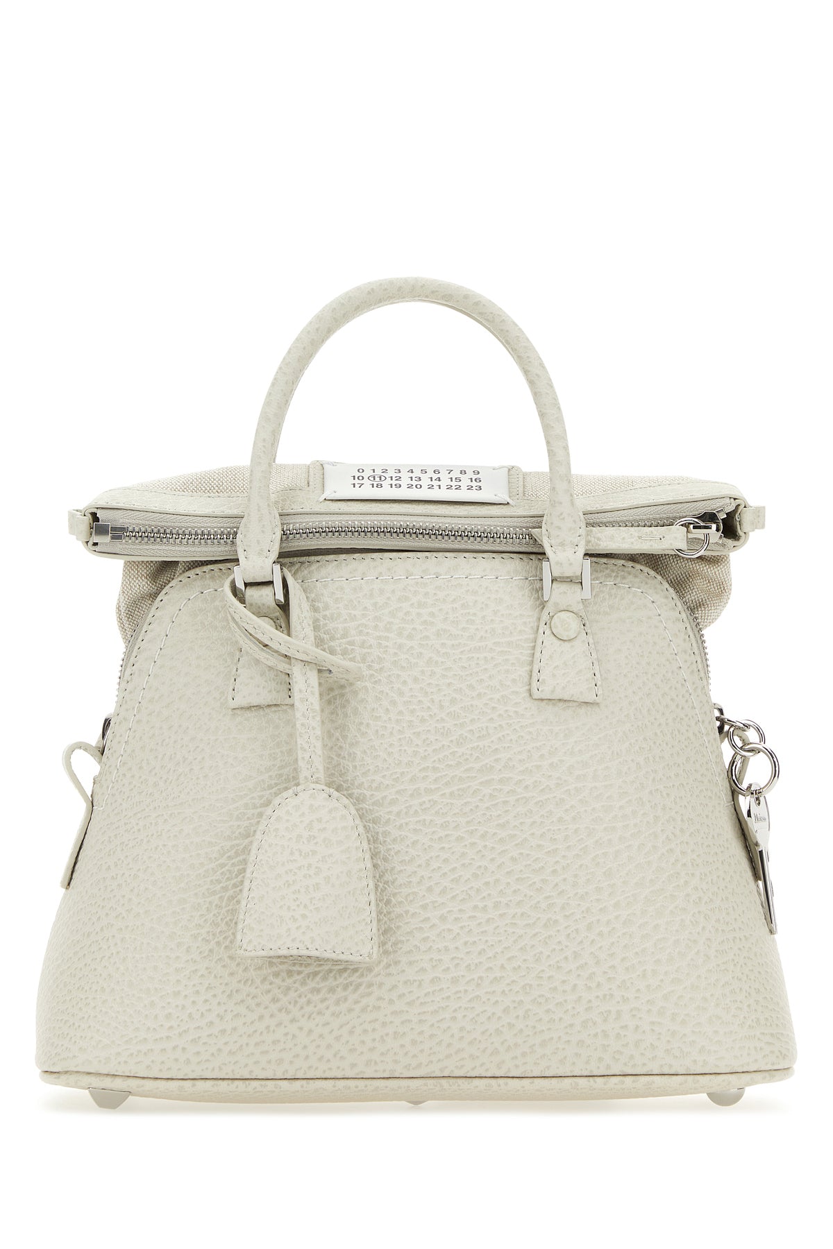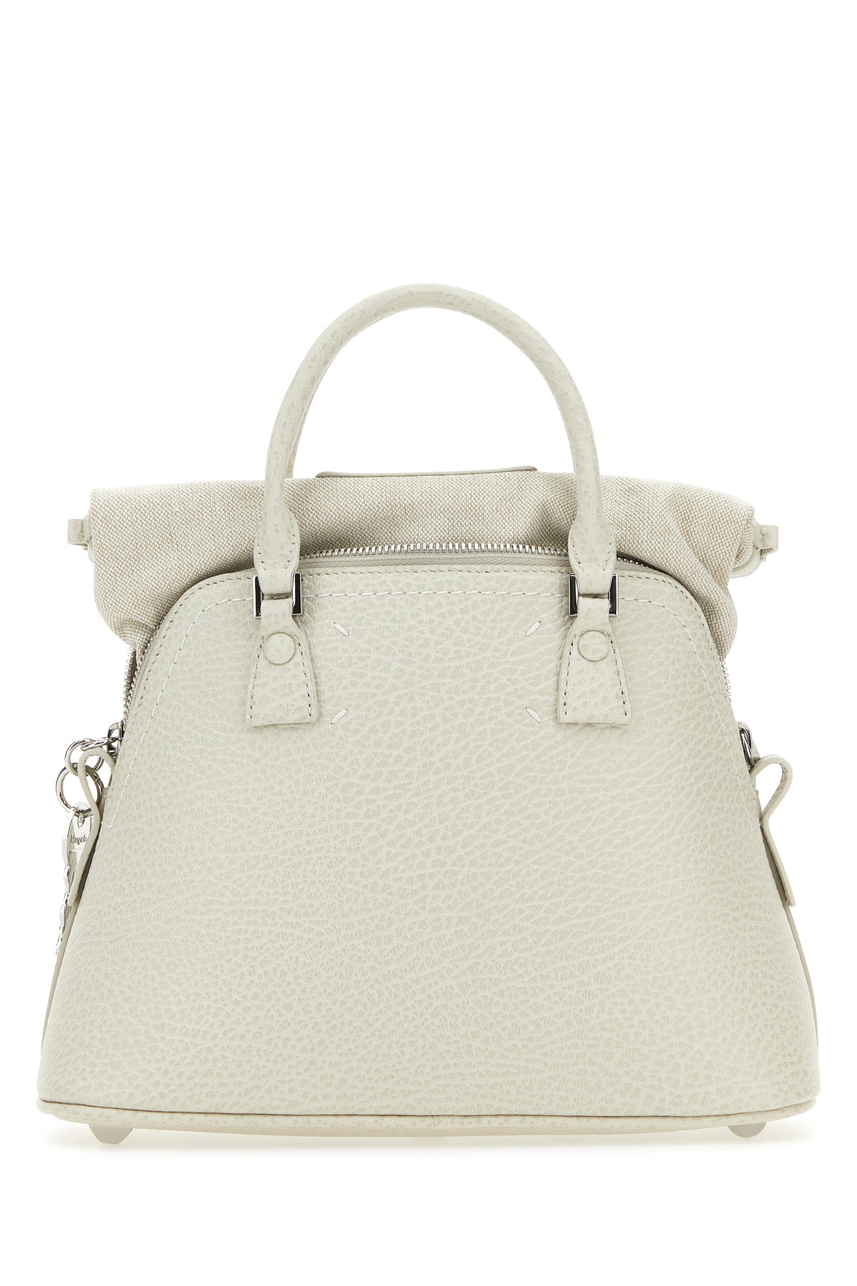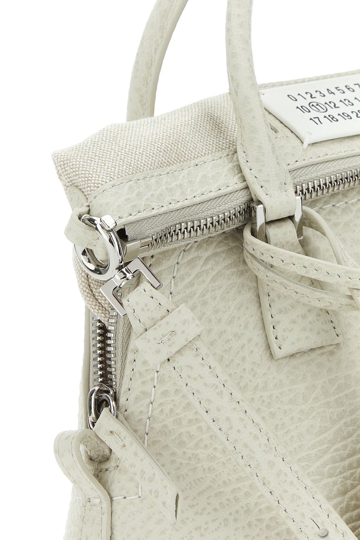 Handbag realized in pebble bovine leather with by tonal fabric insert enriched by contrasting logoed label at the front.