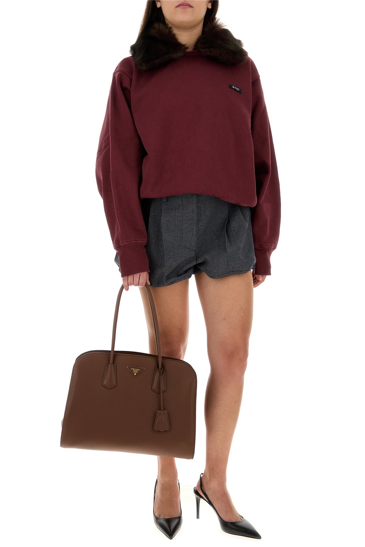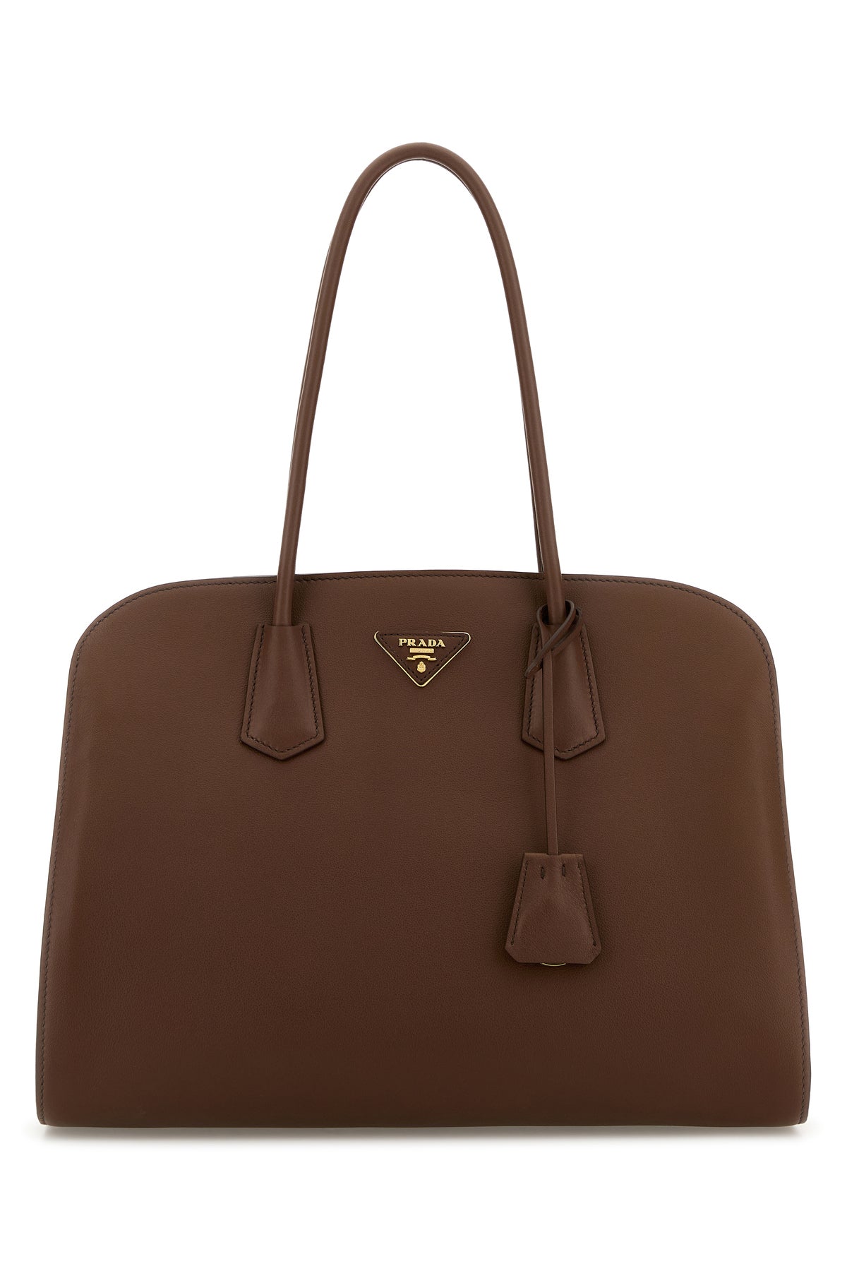 Shopping bag realized in pebble leather enriched by iconic logoed metal triangle at the front.
