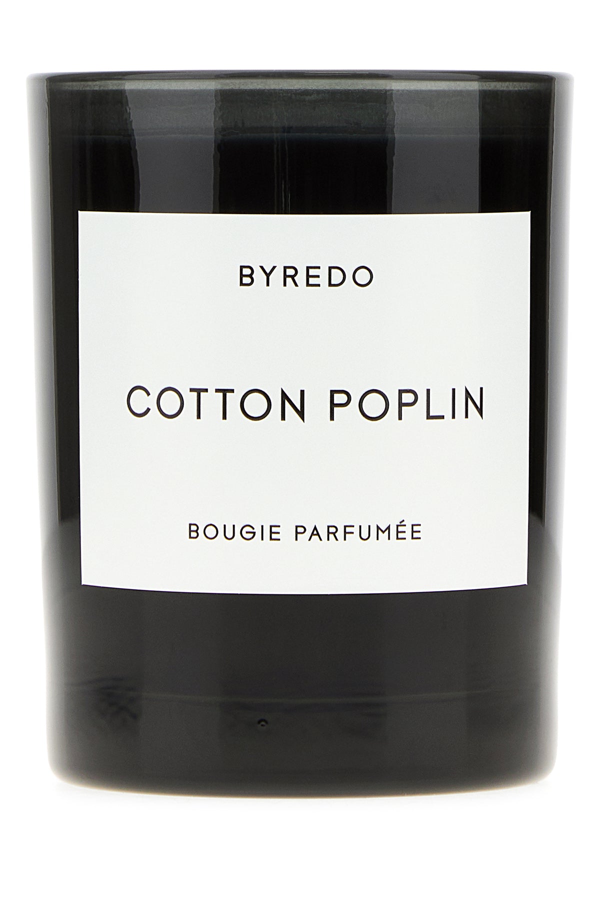 Candle characterized by charcoal glass vessel with contrasting logoed label.