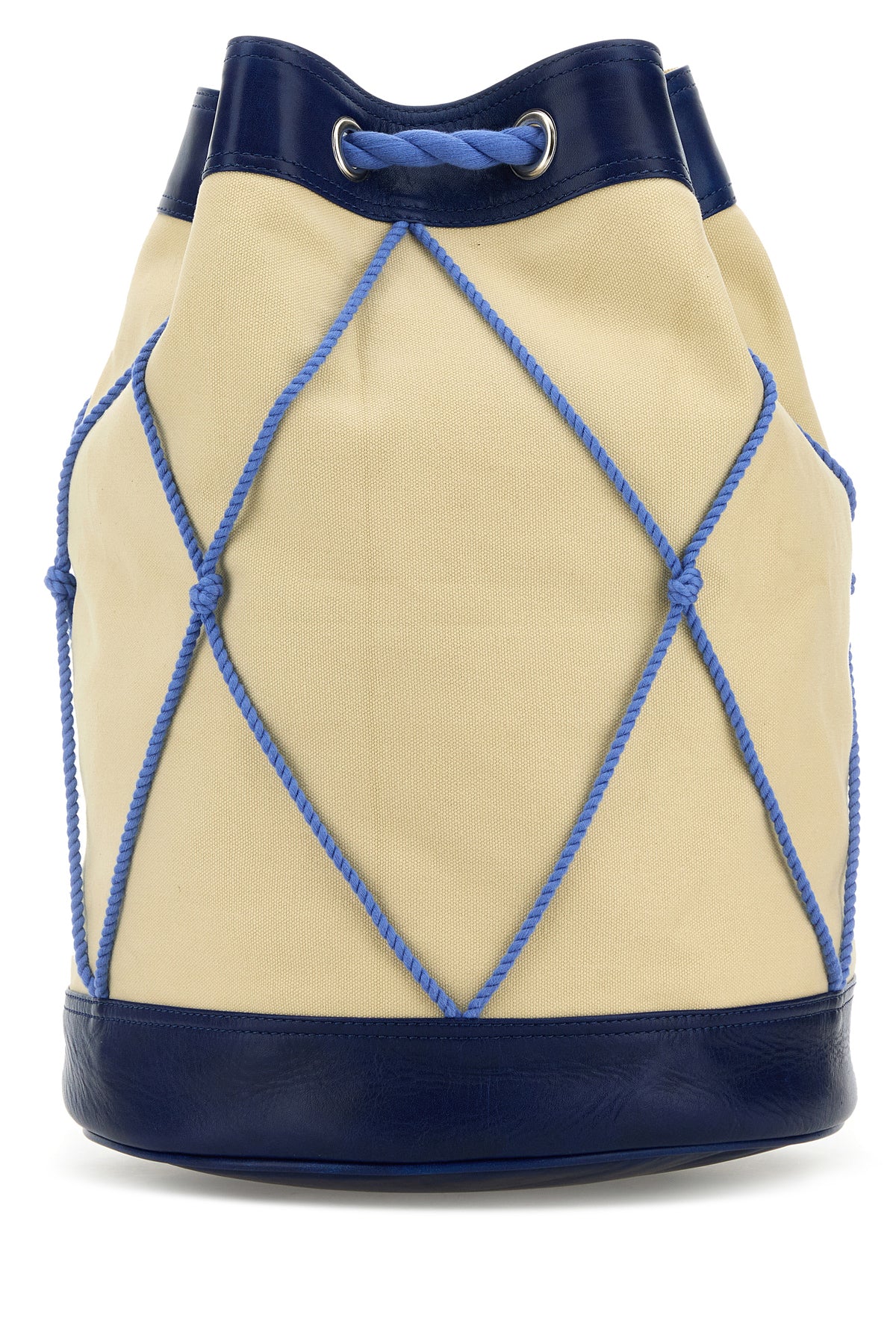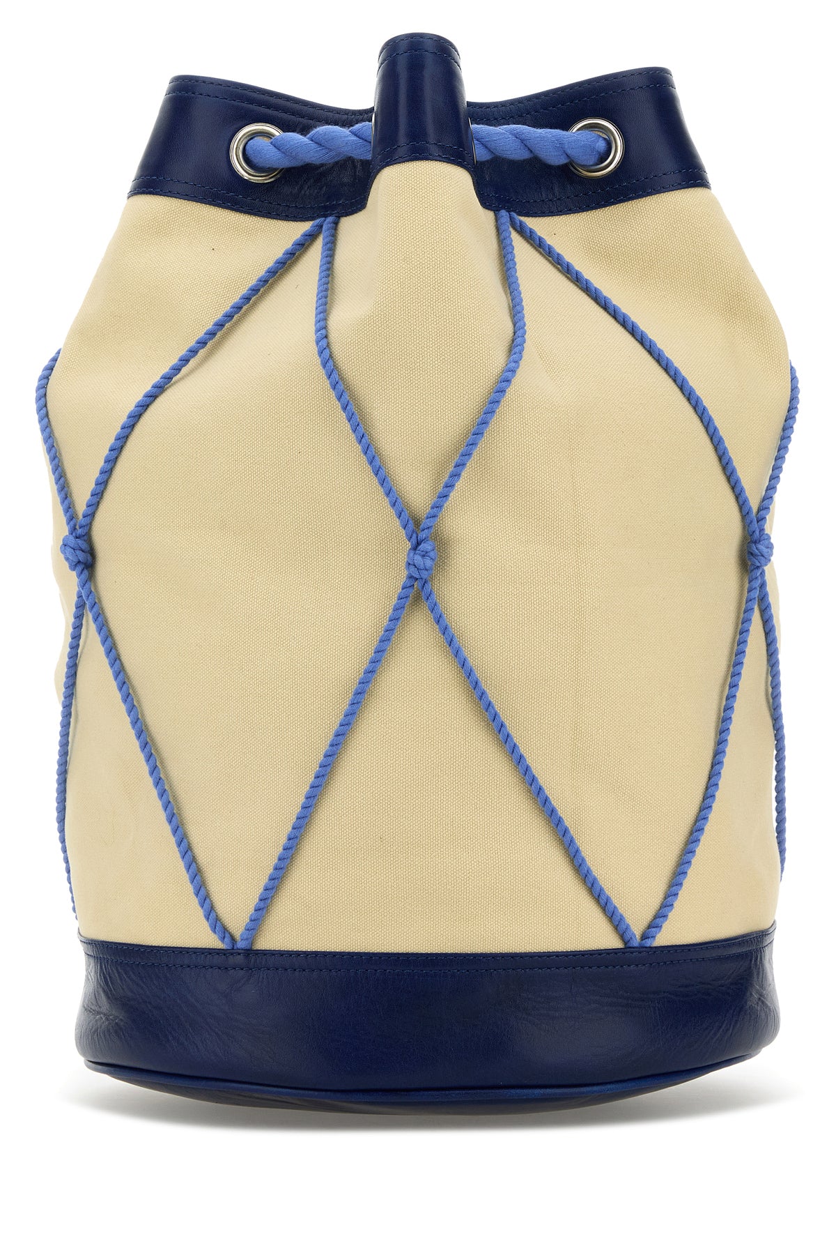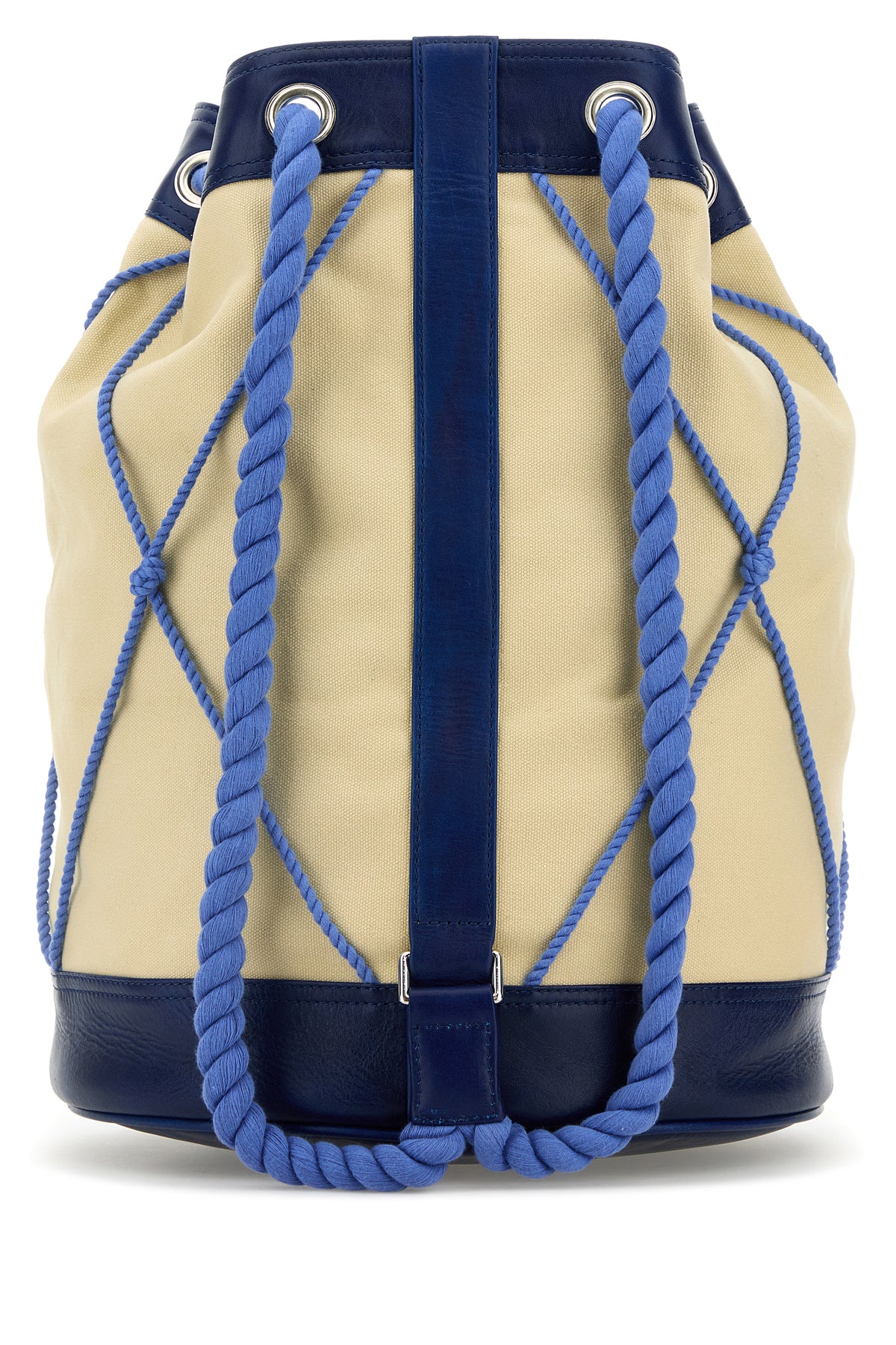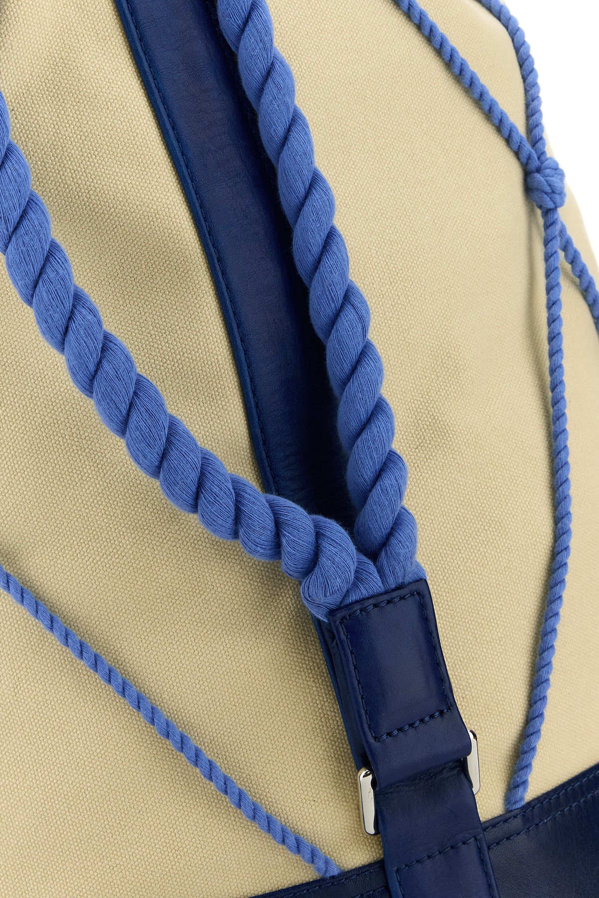 Backpack realized in pure cotton canvas with contrasting bovine leather trimming at the top and on the hemline enriched by contrasting peculiar embellishment on te entire surface.