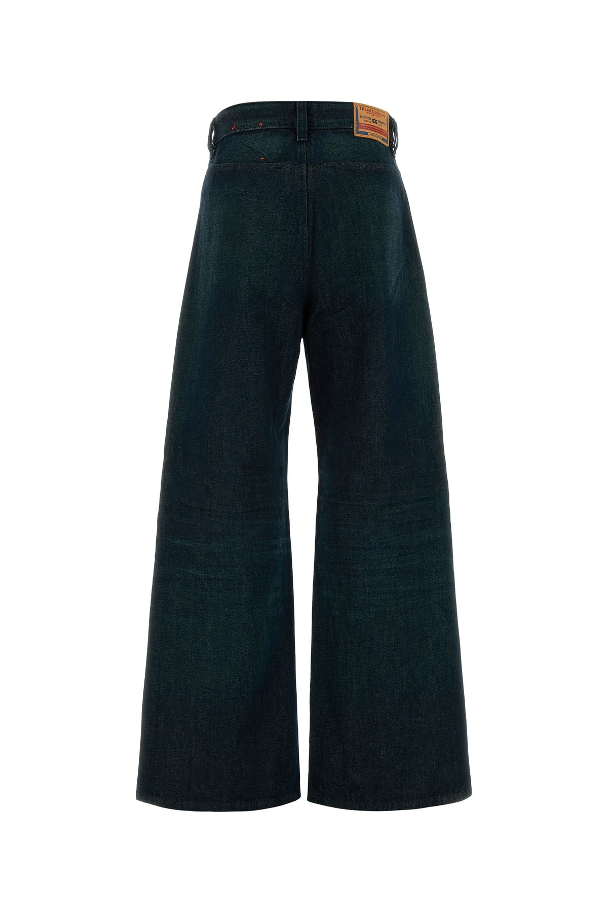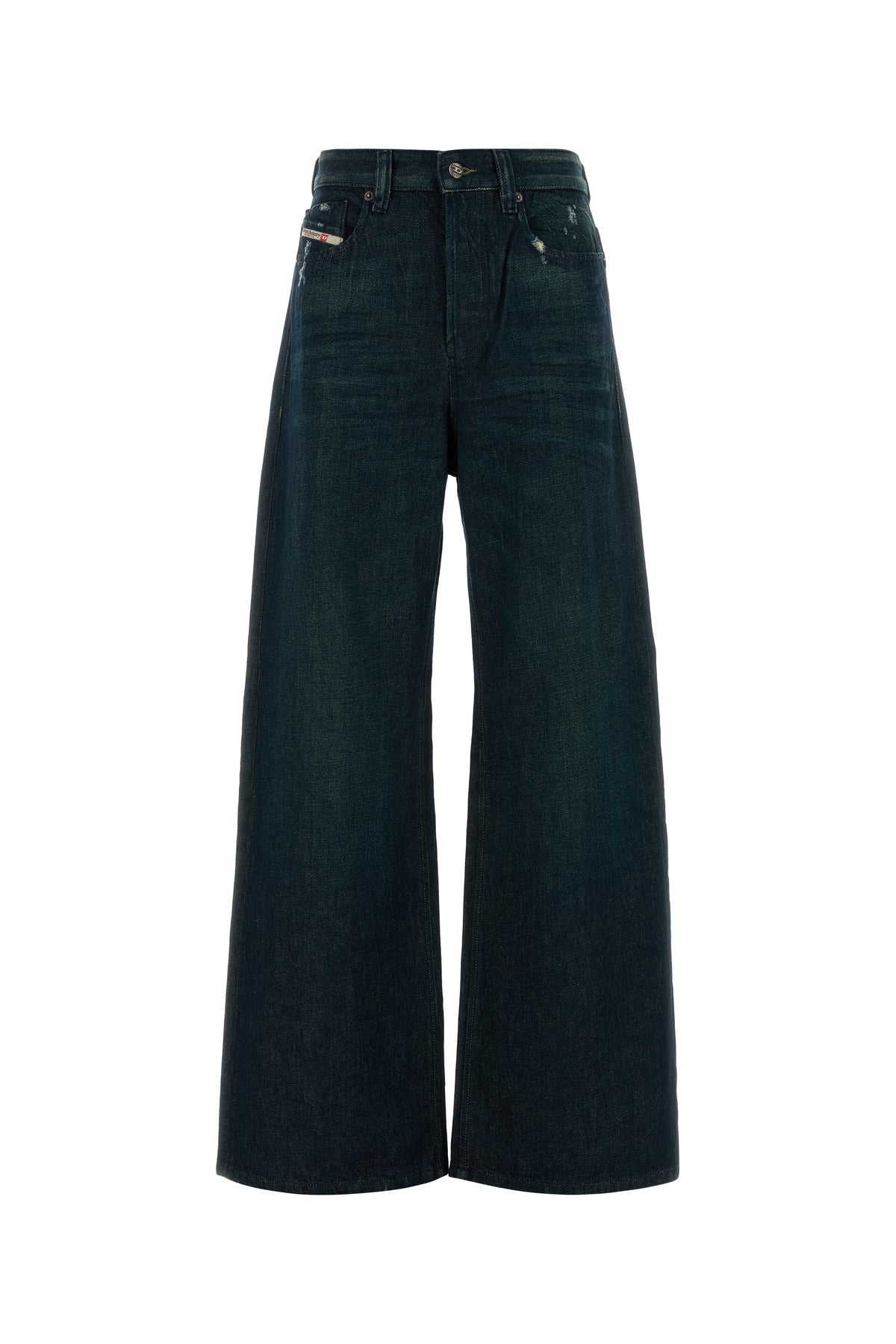 Wide-leg jeans realized in slightly stonewashed and distressed pure cotton denim enriched by logoed label at the front and at the back.
