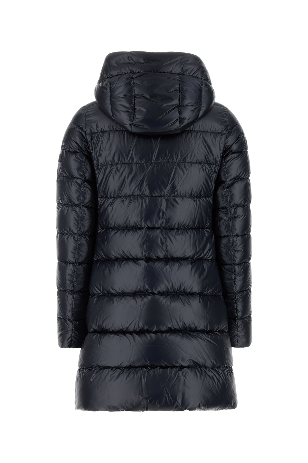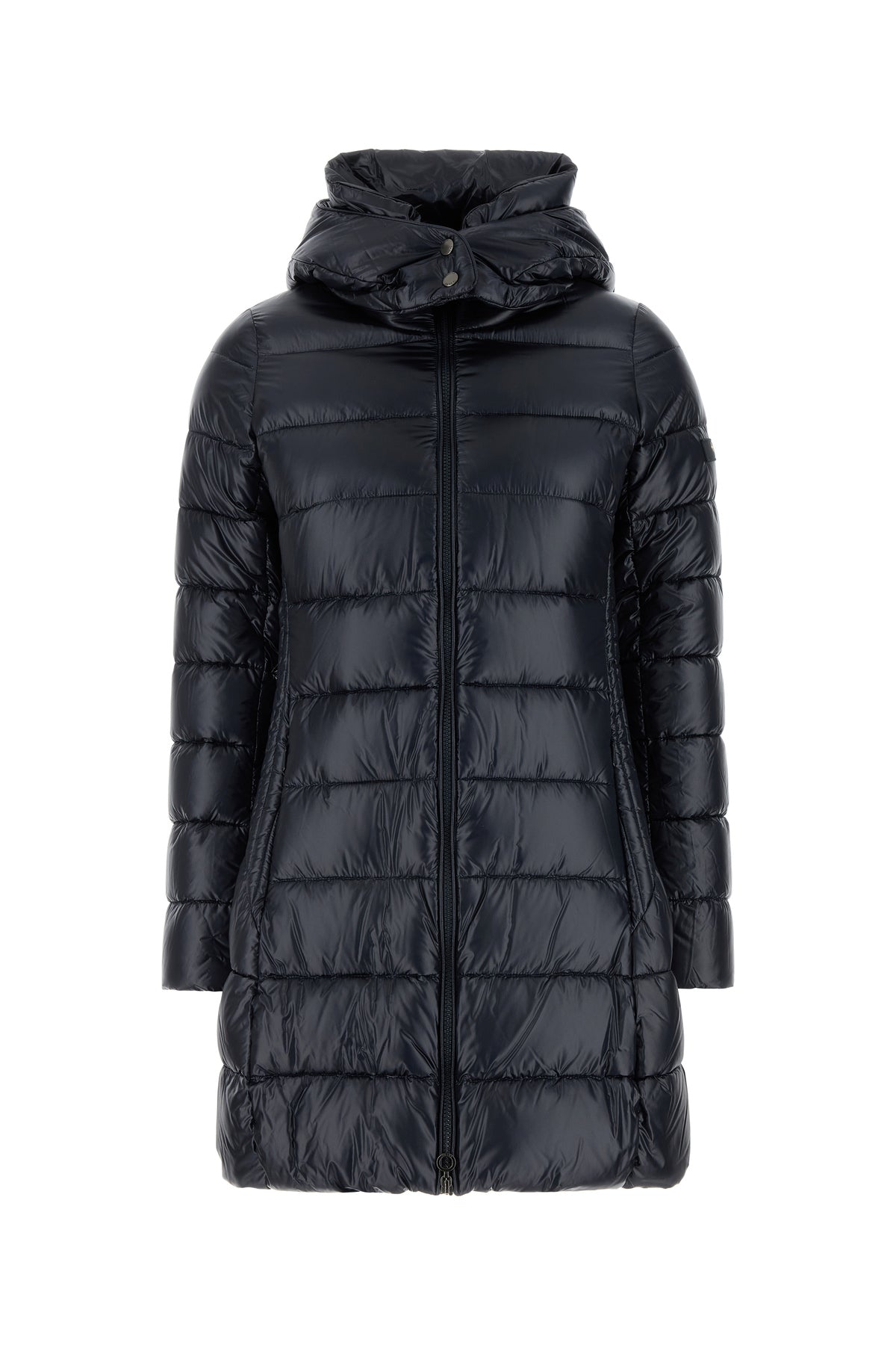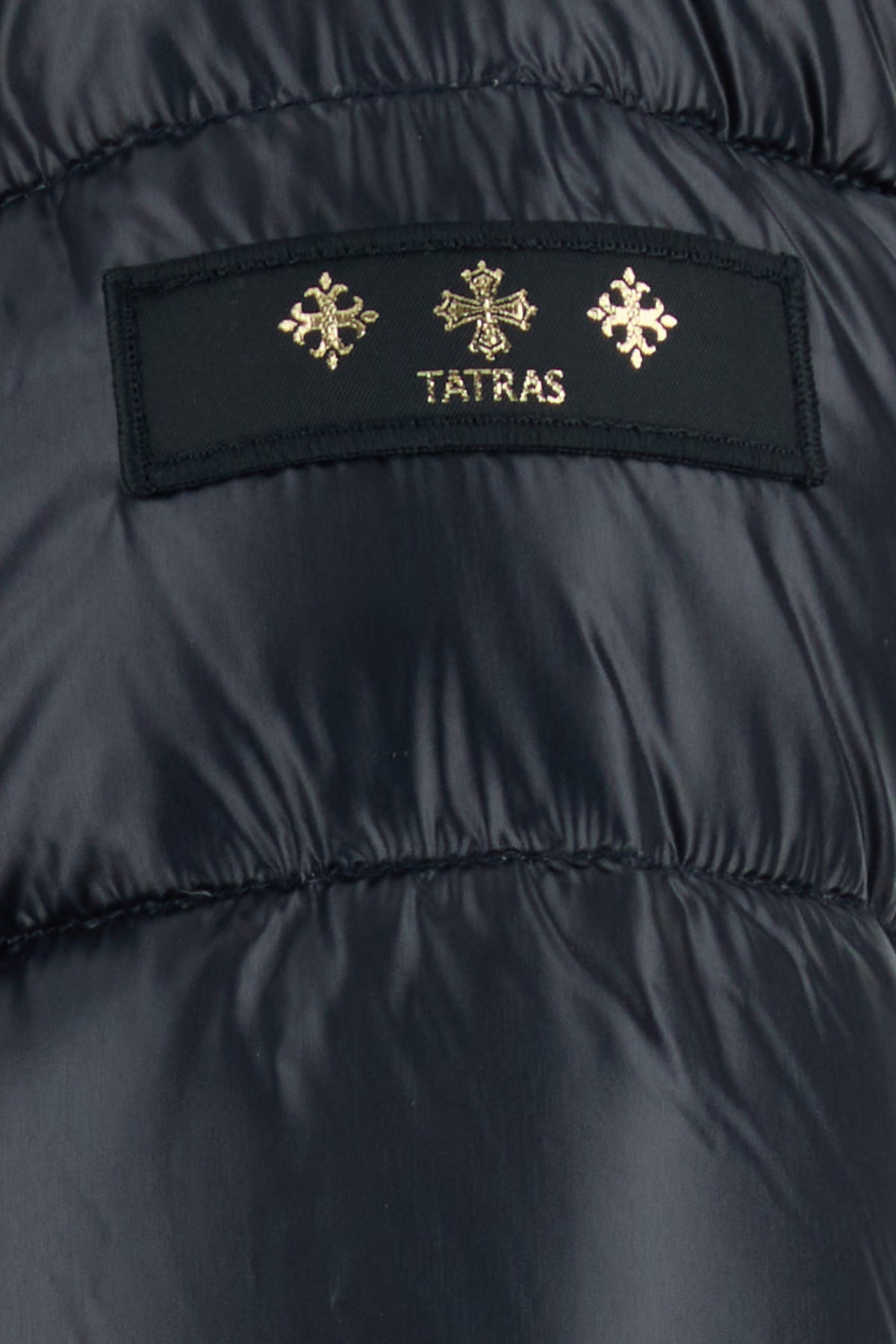 Down jacket realized in quilted nylon enriched by tonal logoed label on the sleeve.