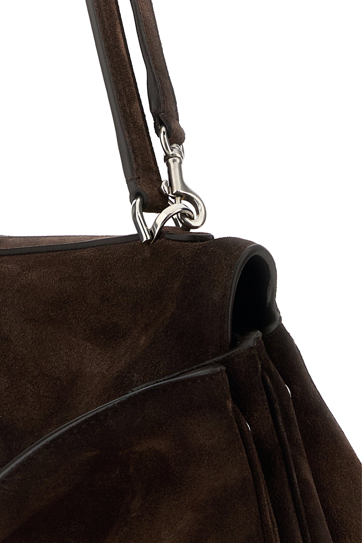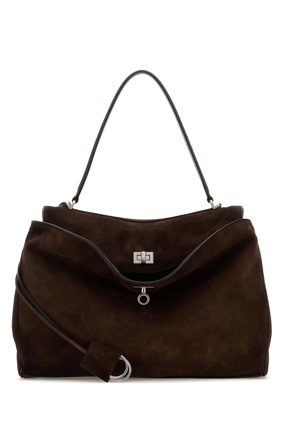 Handbag realized in vintage effect calf suede enriched by detachable tonal leather accessory with metal rings.