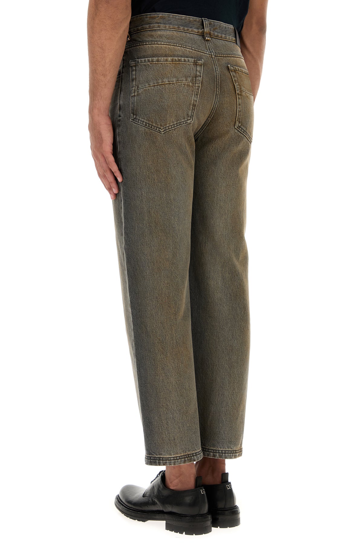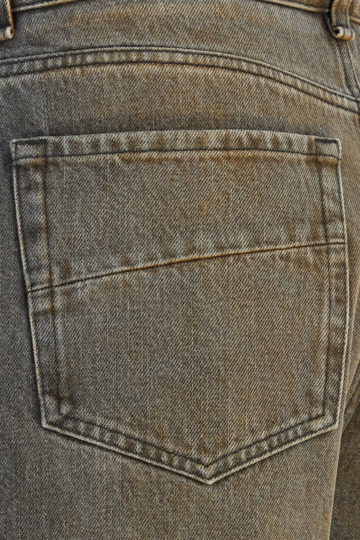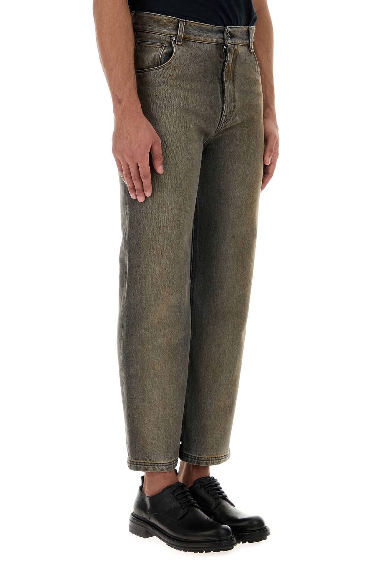 Jeans realized in stonewashed pure cotton denim with intentional dirties on the entire surface enriched by logoed label at the back.