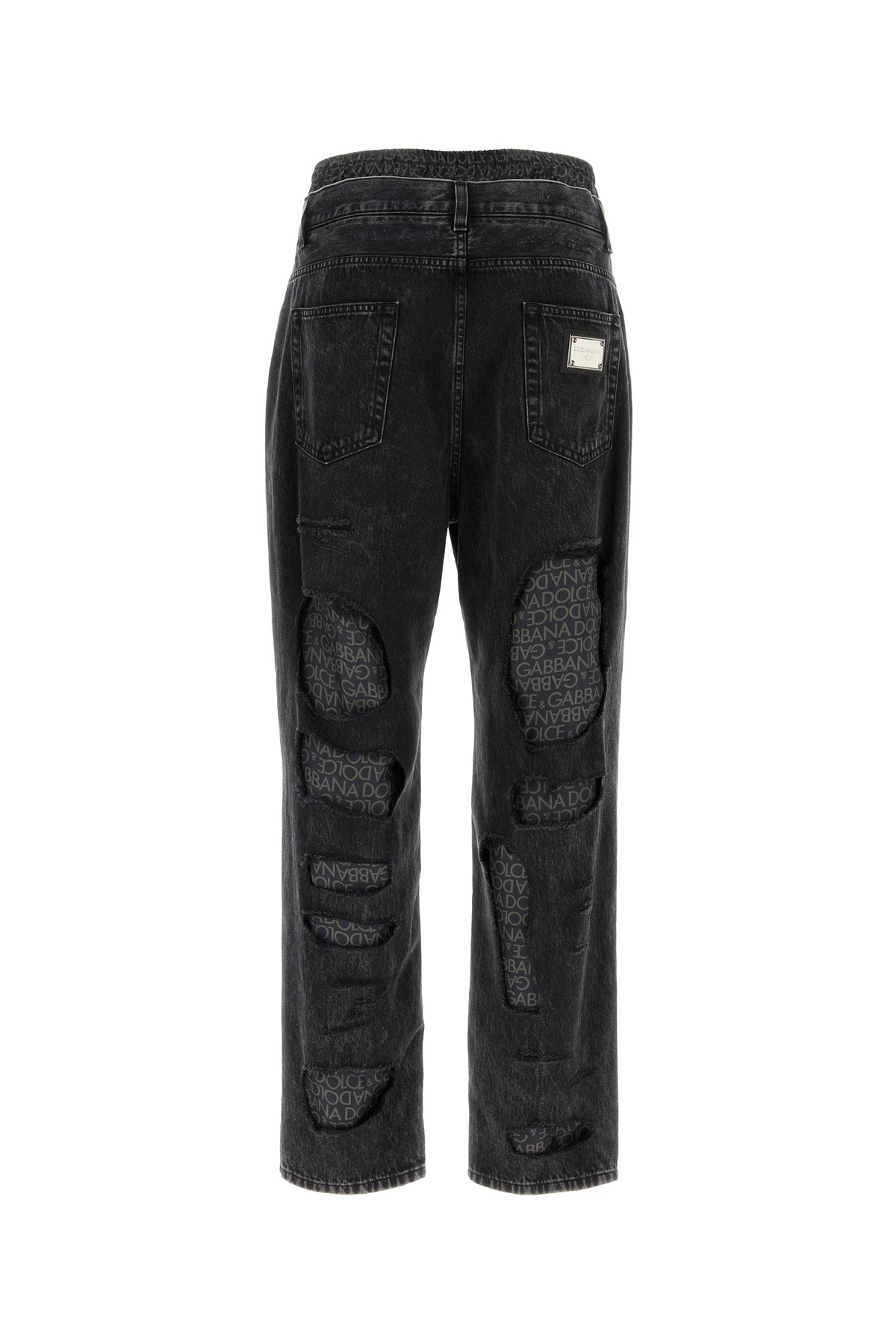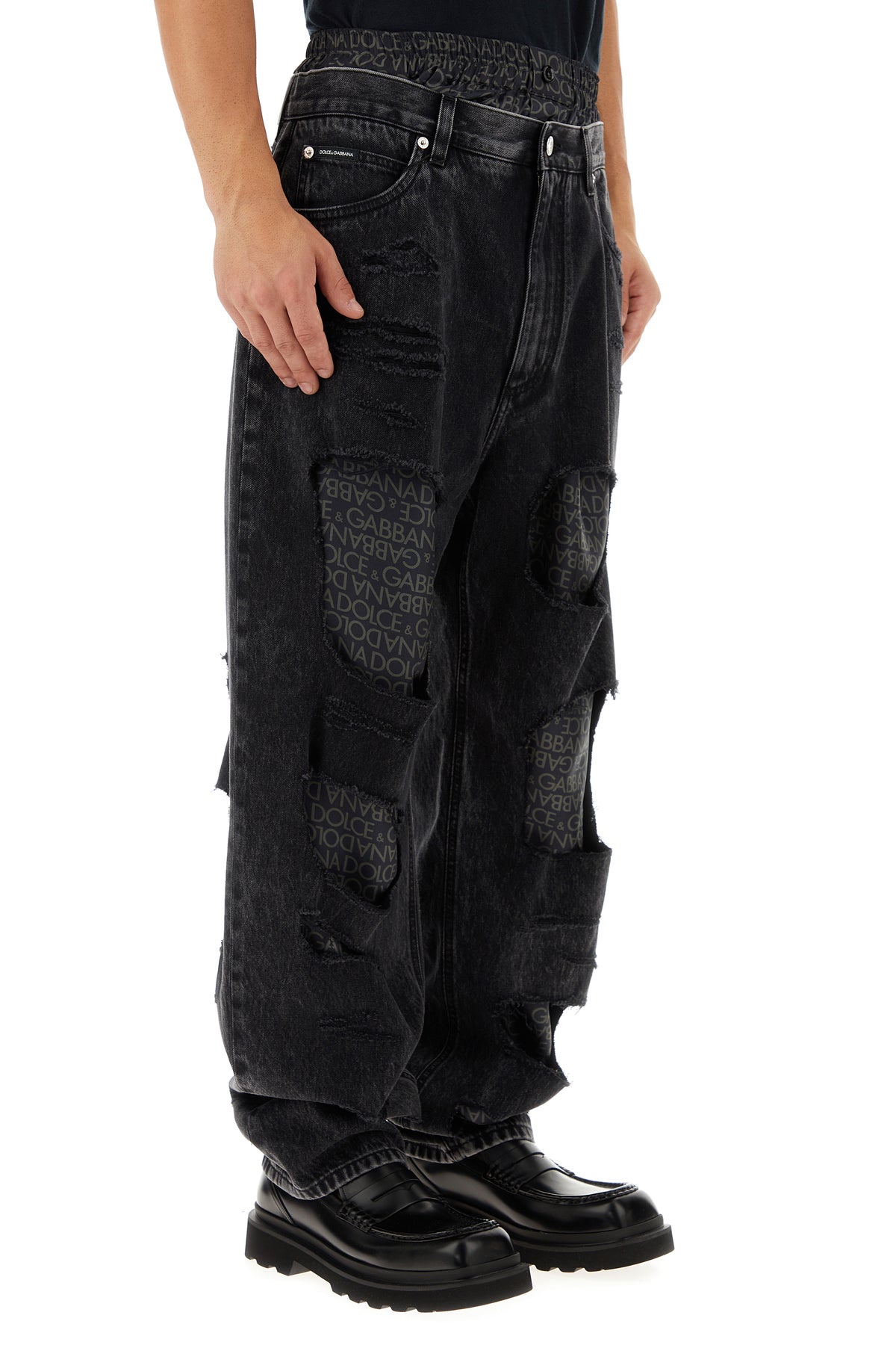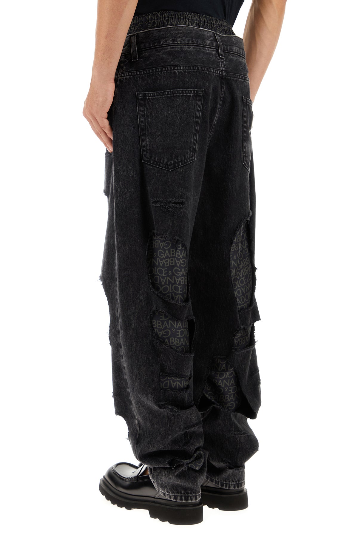 Jeans realized in pure stonewashed and distressed cotton denim with logoed printed silk inserts at the front and the back enriched by logoed metal plate at the back.