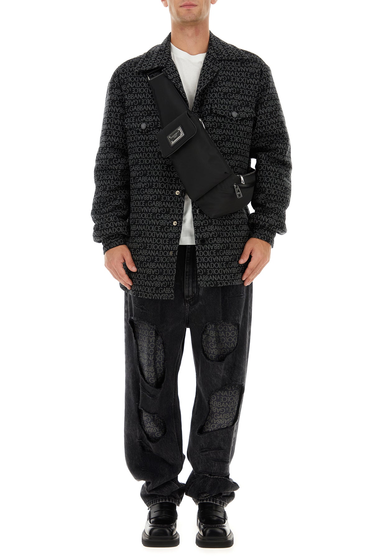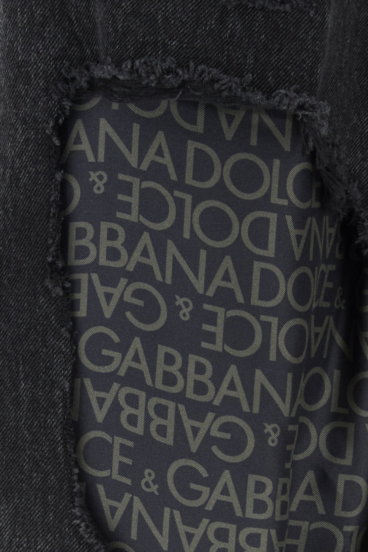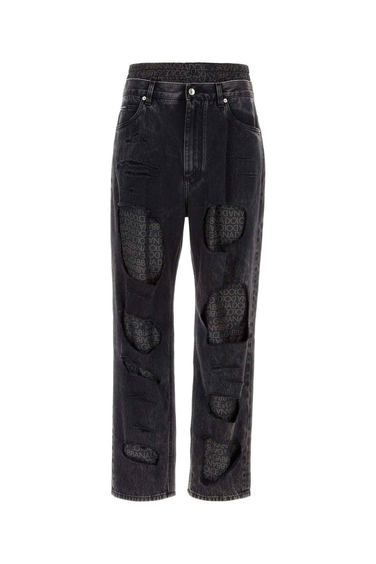 Jeans realized in pure stonewashed and distressed cotton denim with logoed printed silk inserts at the front and the back enriched by logoed metal plate at the back.