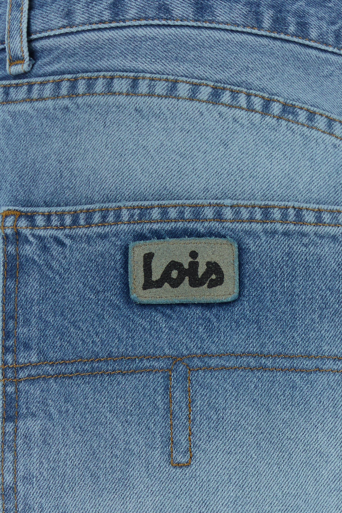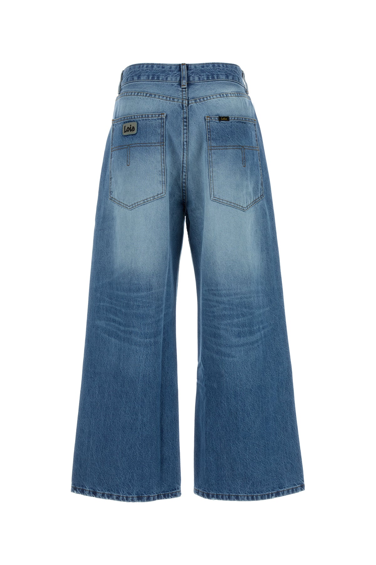 Wide-leg jeans realized in stonewashed pure cotton denim characterized by logoed patch at the front and logoed patches at the back.