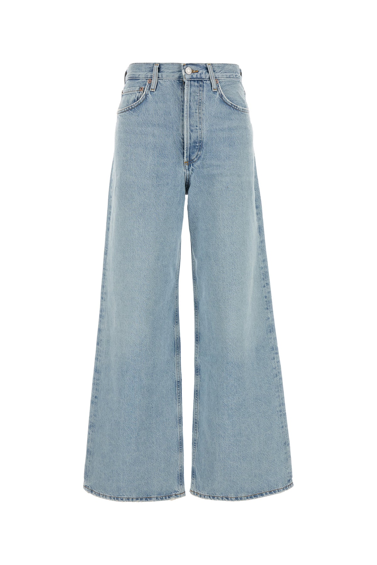 Wide-leg jeans realized in stonewashed and slightly distressed denim.