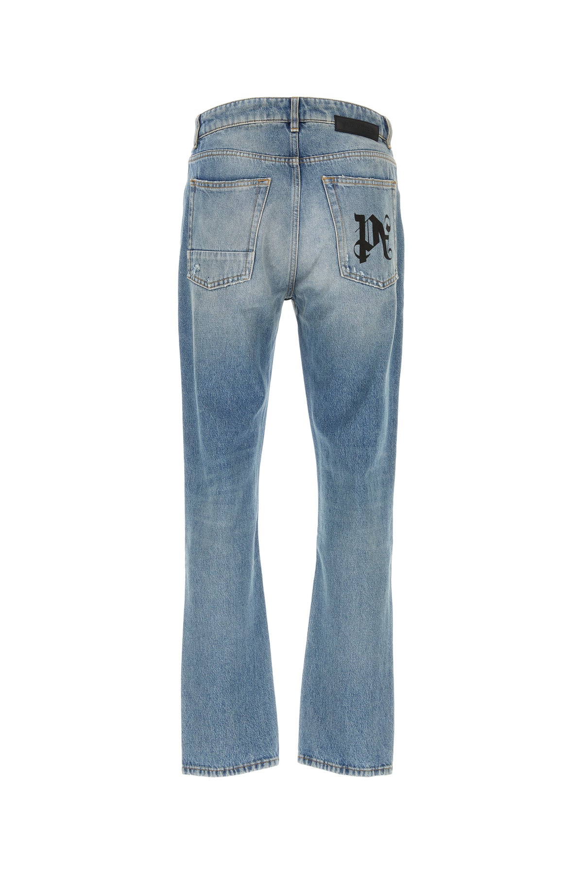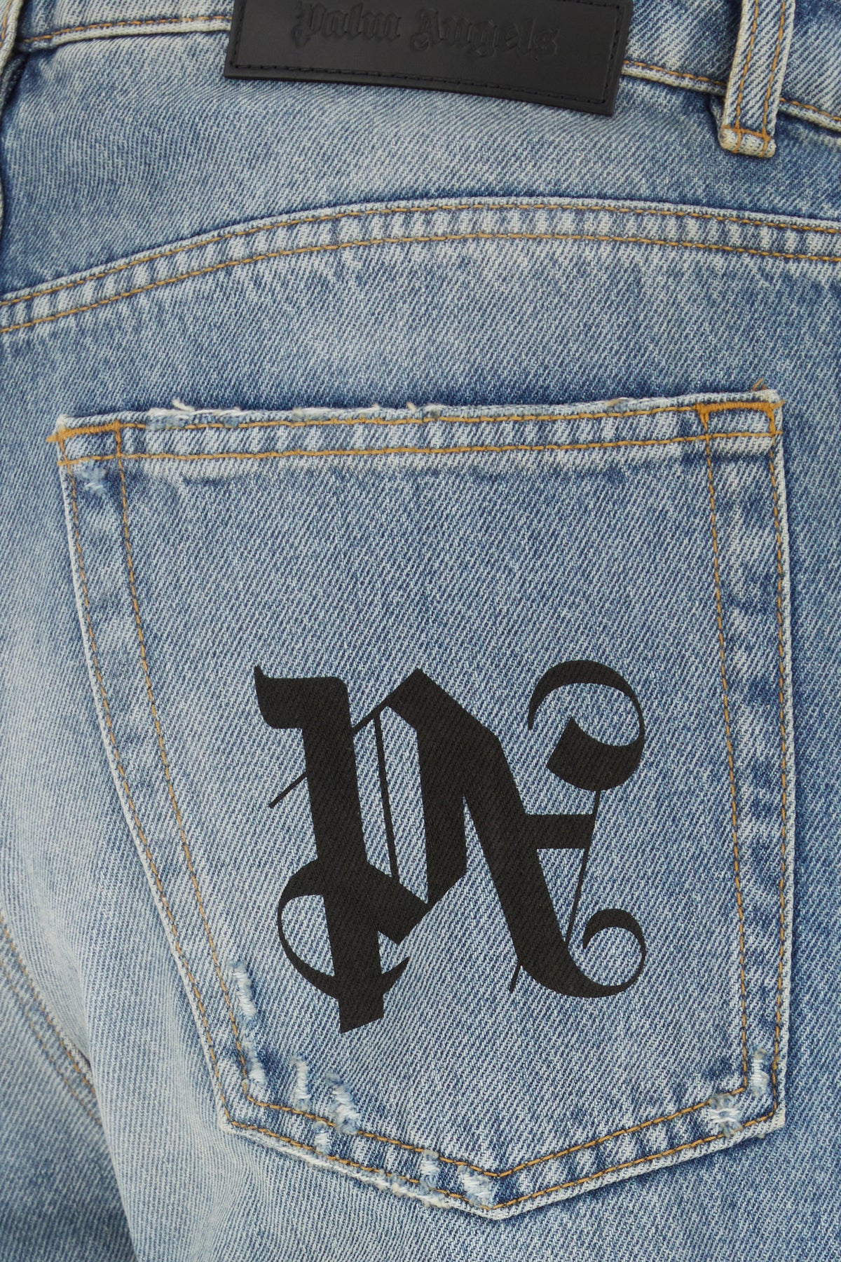 Regular jeans realized in stonewashed and distressed pure cotton denim characterized by contrasting Monogram print at the back.